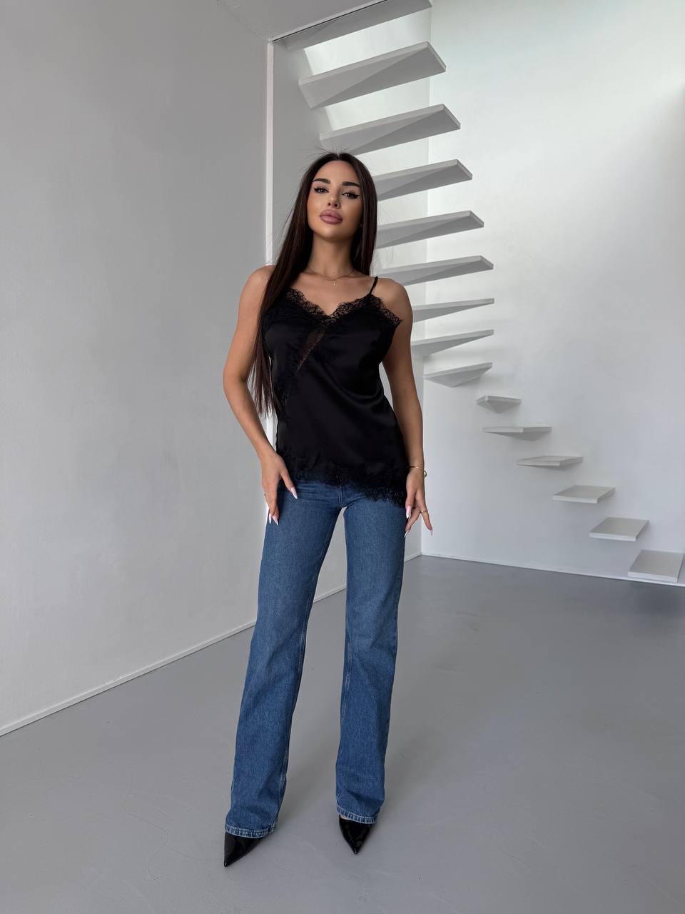 Женский Асимметричный Черный Топ на Бретелях с Гипюровыми Вставками