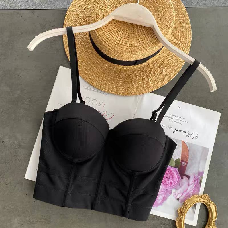 Женский Базовый Черный Топ на Бретелях с Чашечками и Сеткой