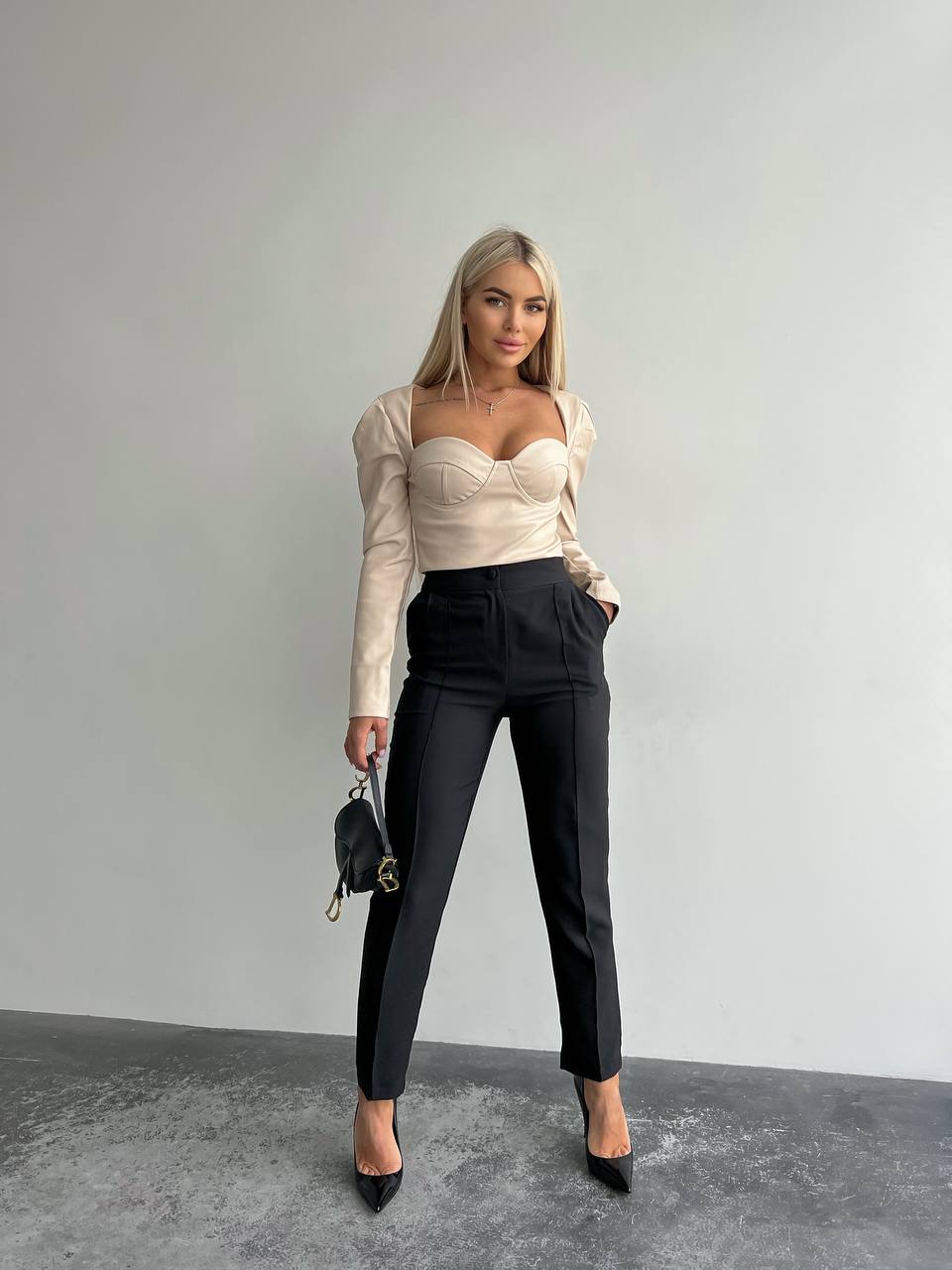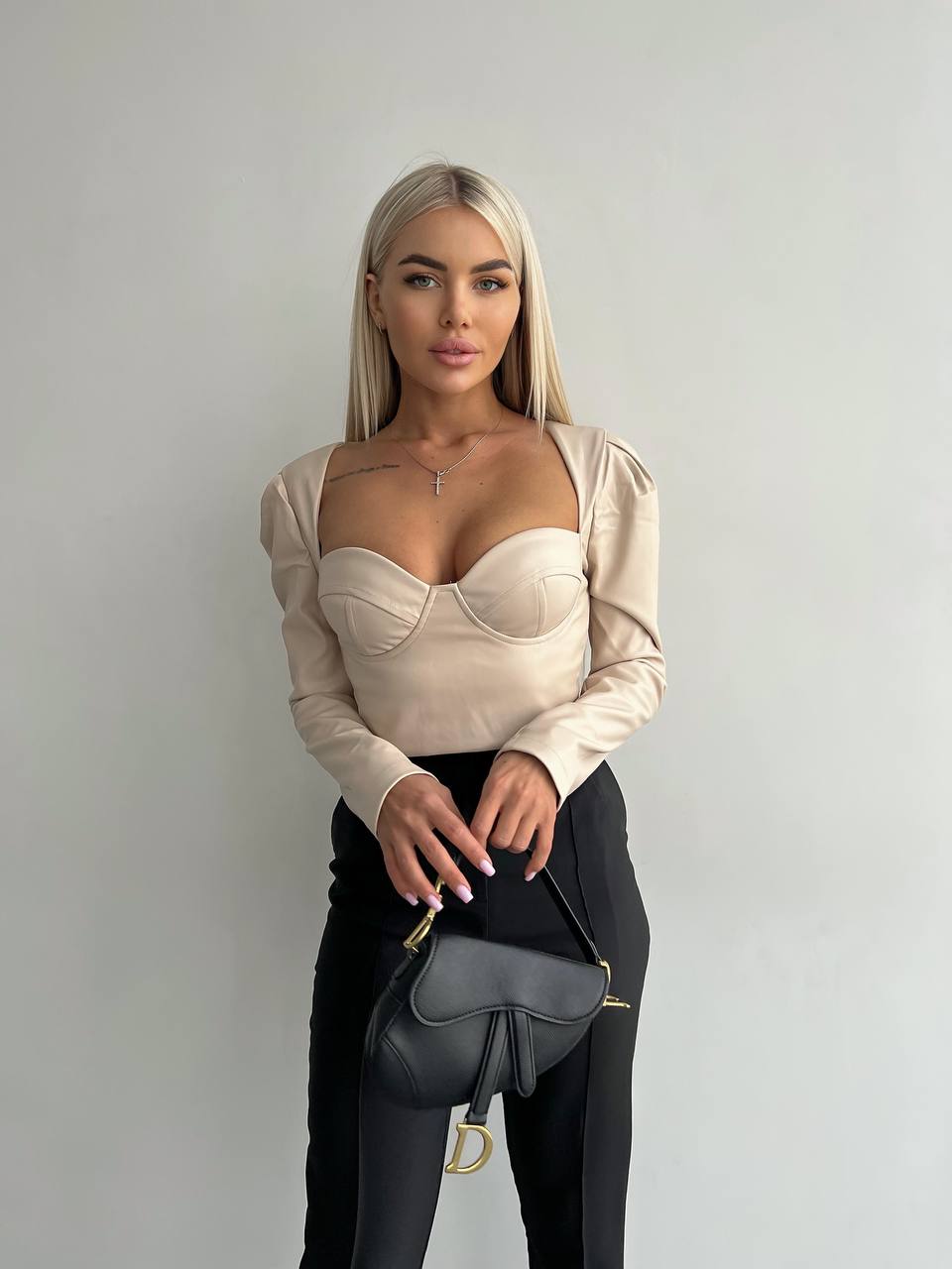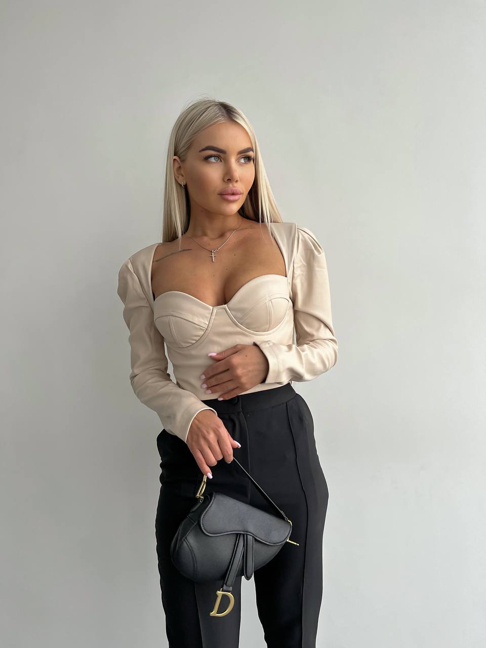 Женский Бежевый Кожаный Топ Бюстье с Фигурным Вырезом Декольте и Объемными Рукавами