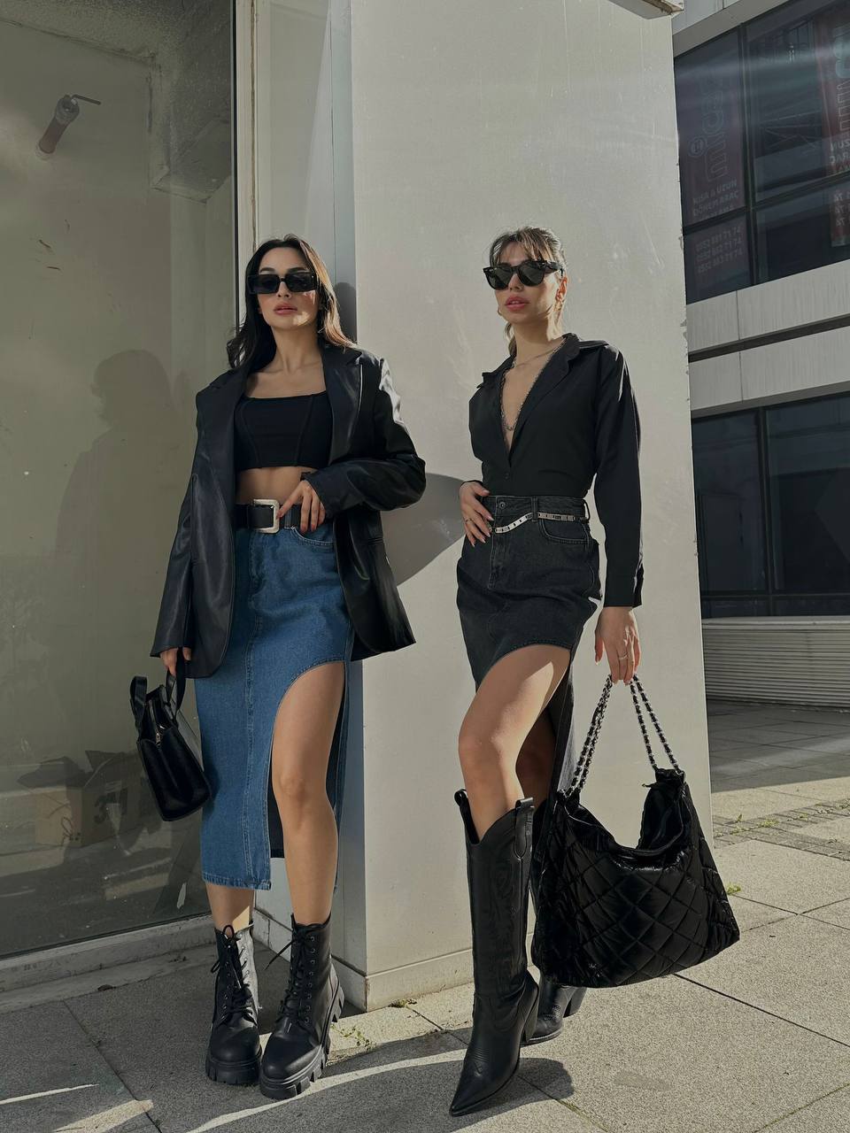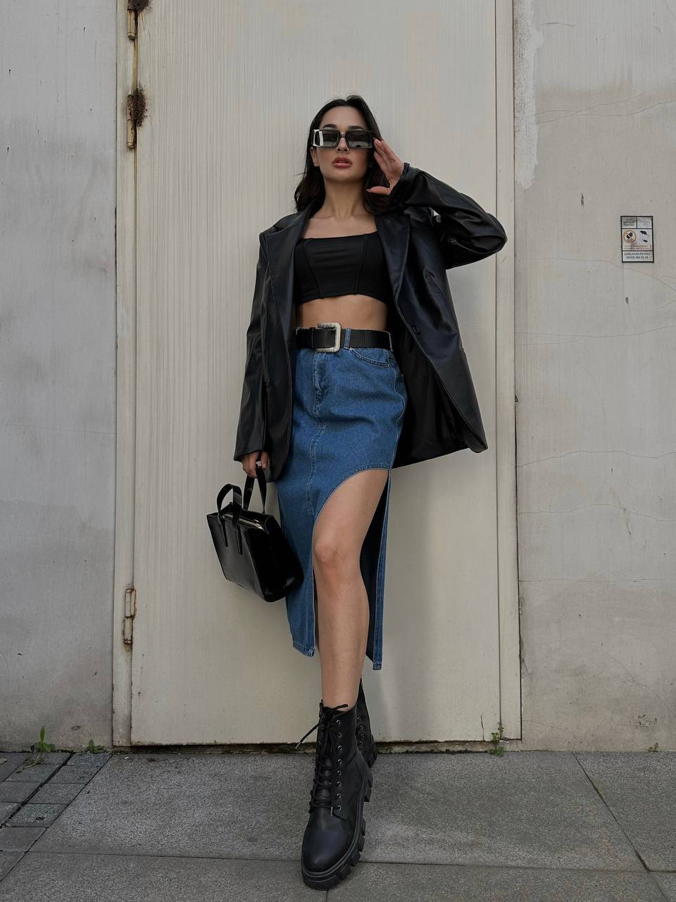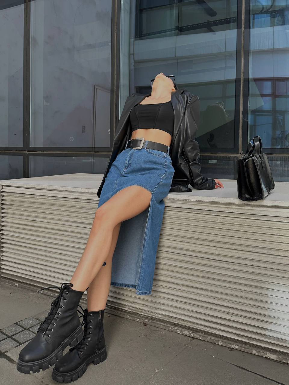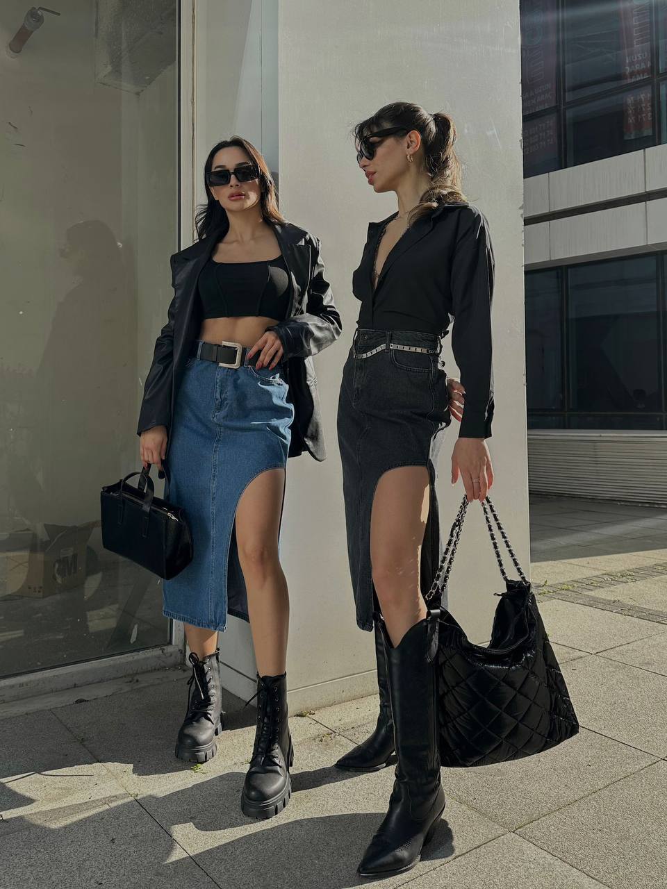 Женская Синяя Джинсовая Юбка Миди с Высокой Талией и Разрезом на Ноге