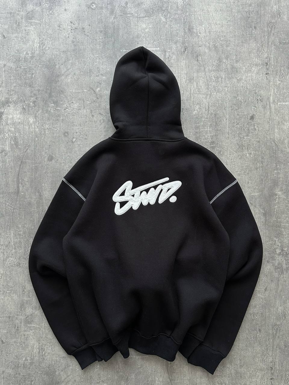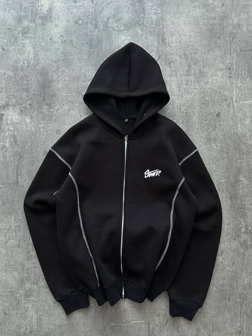 Мужская Черная Кофта Зипка Оверсайз – Зип Худи на Молнии с Контрастными Швами