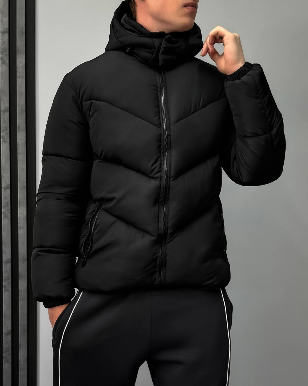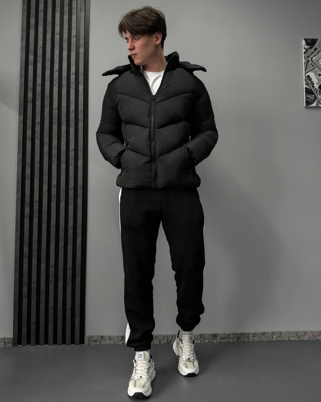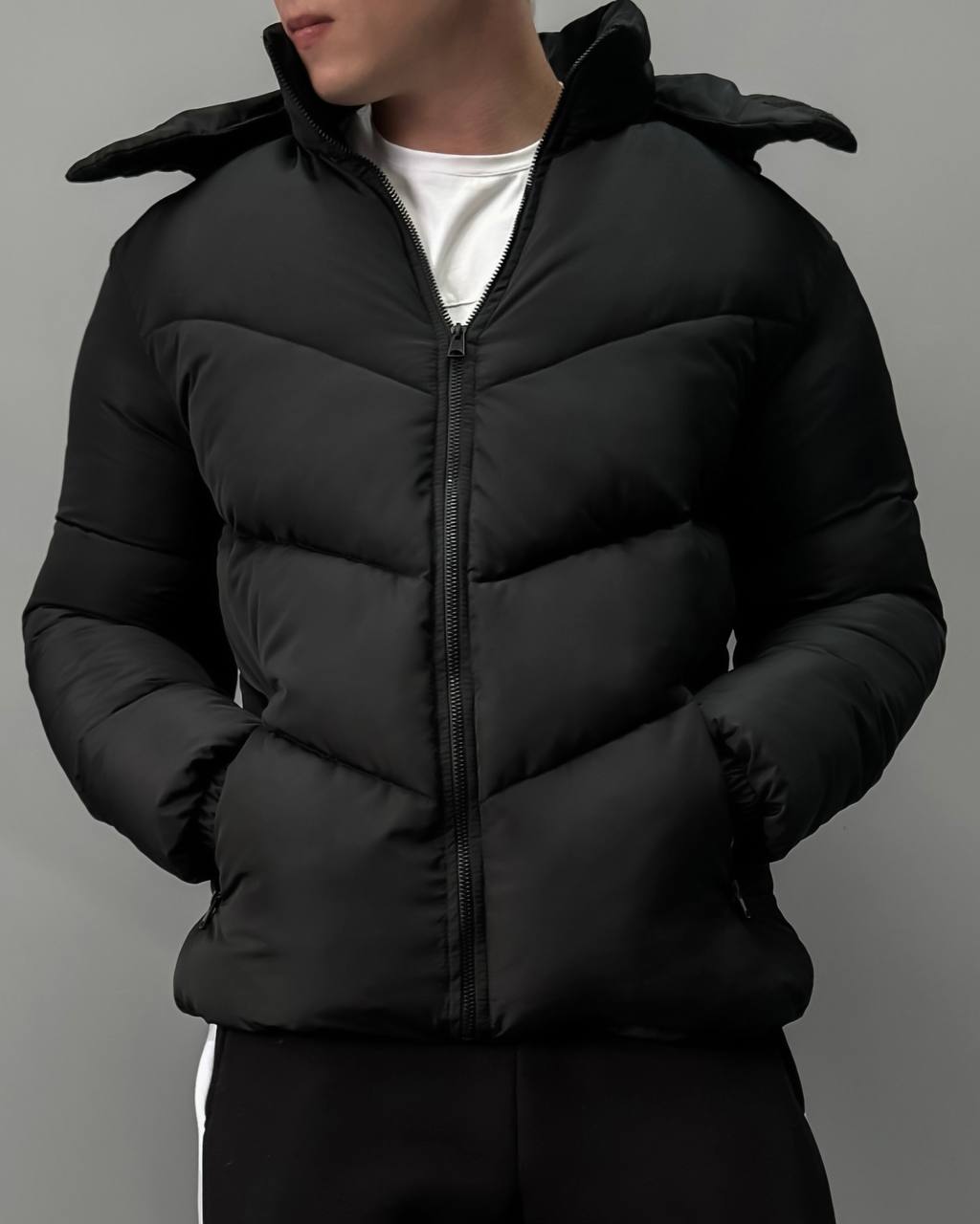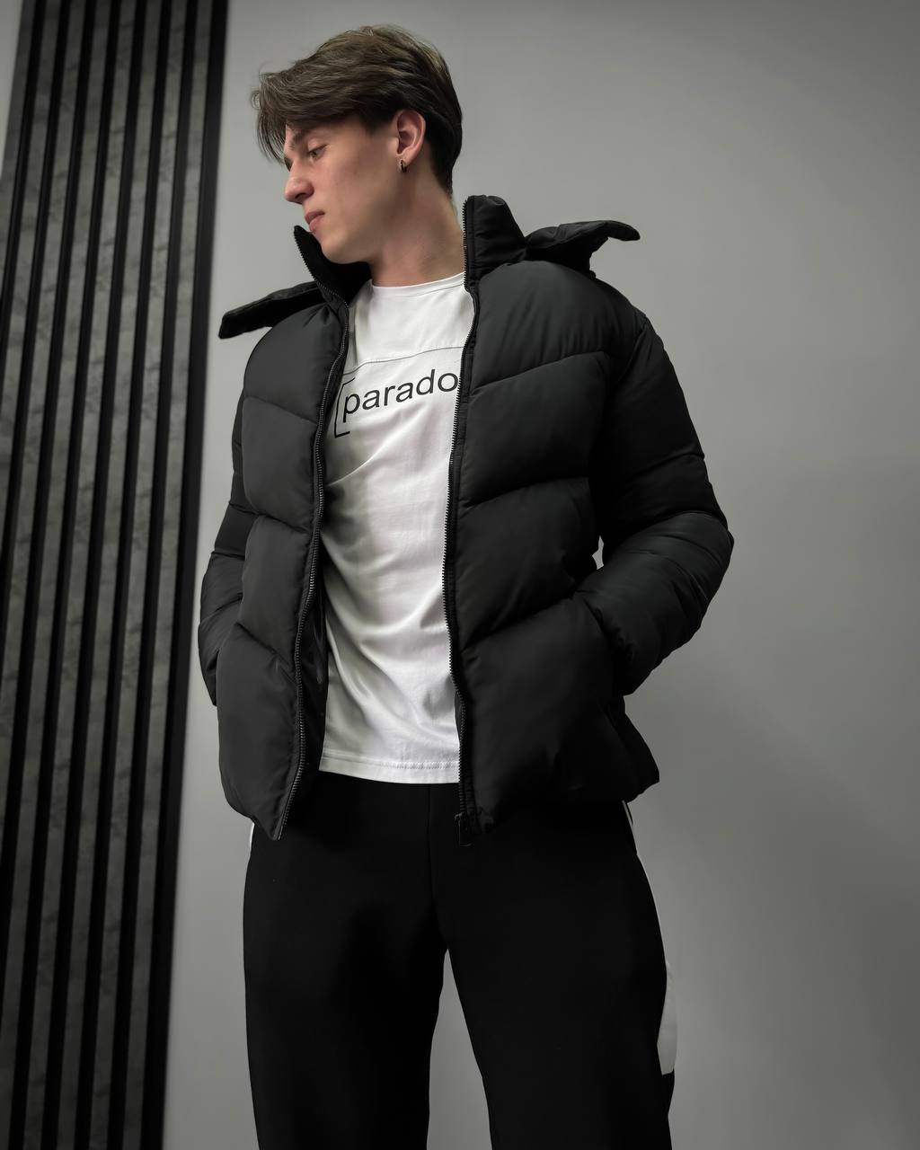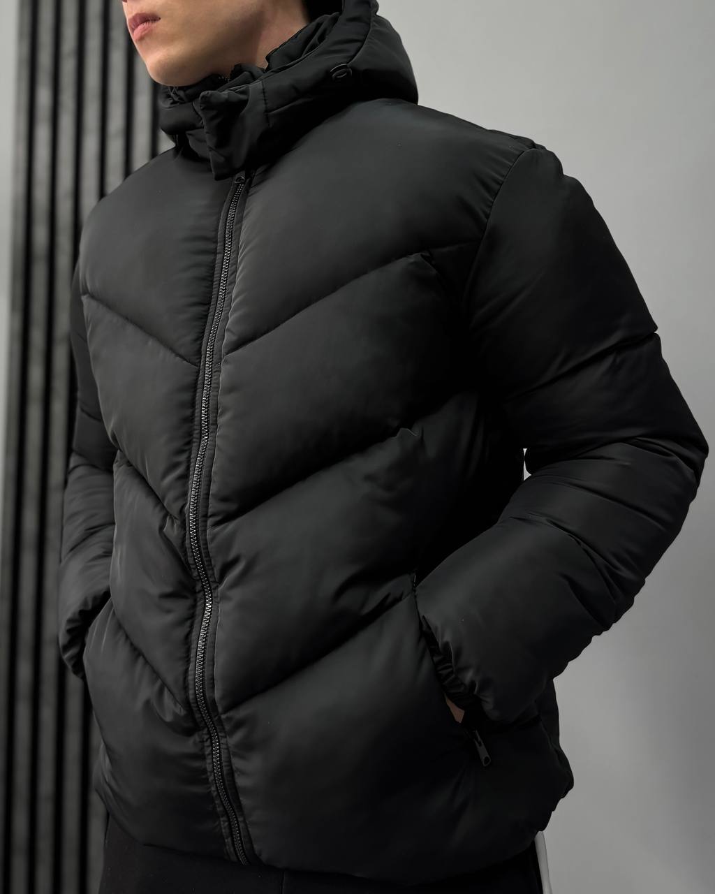 Мужская Демисезонная Черная Стеганая Куртка Пуховик с Высоким Горлом и Капюшоном
