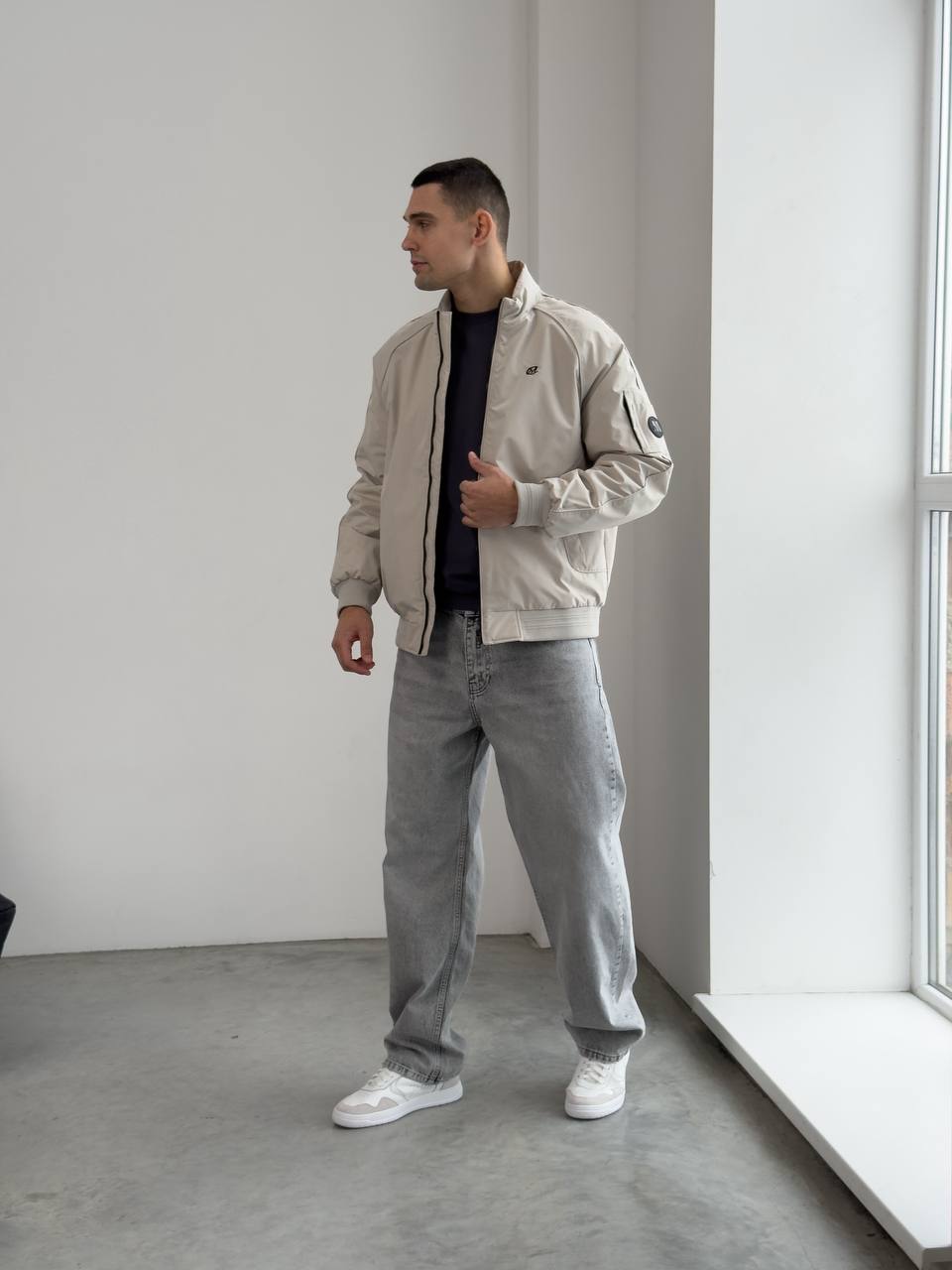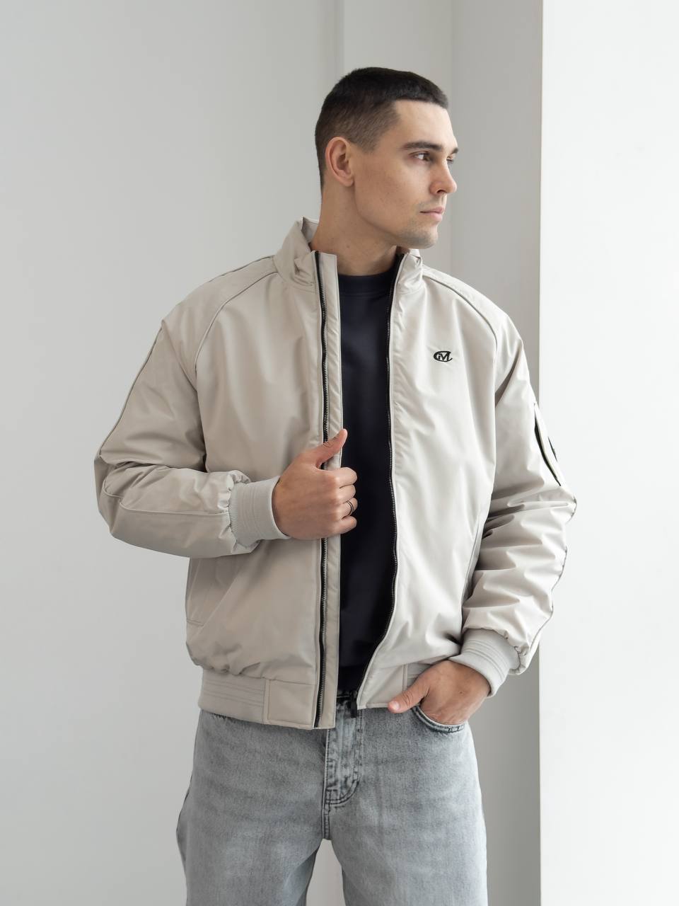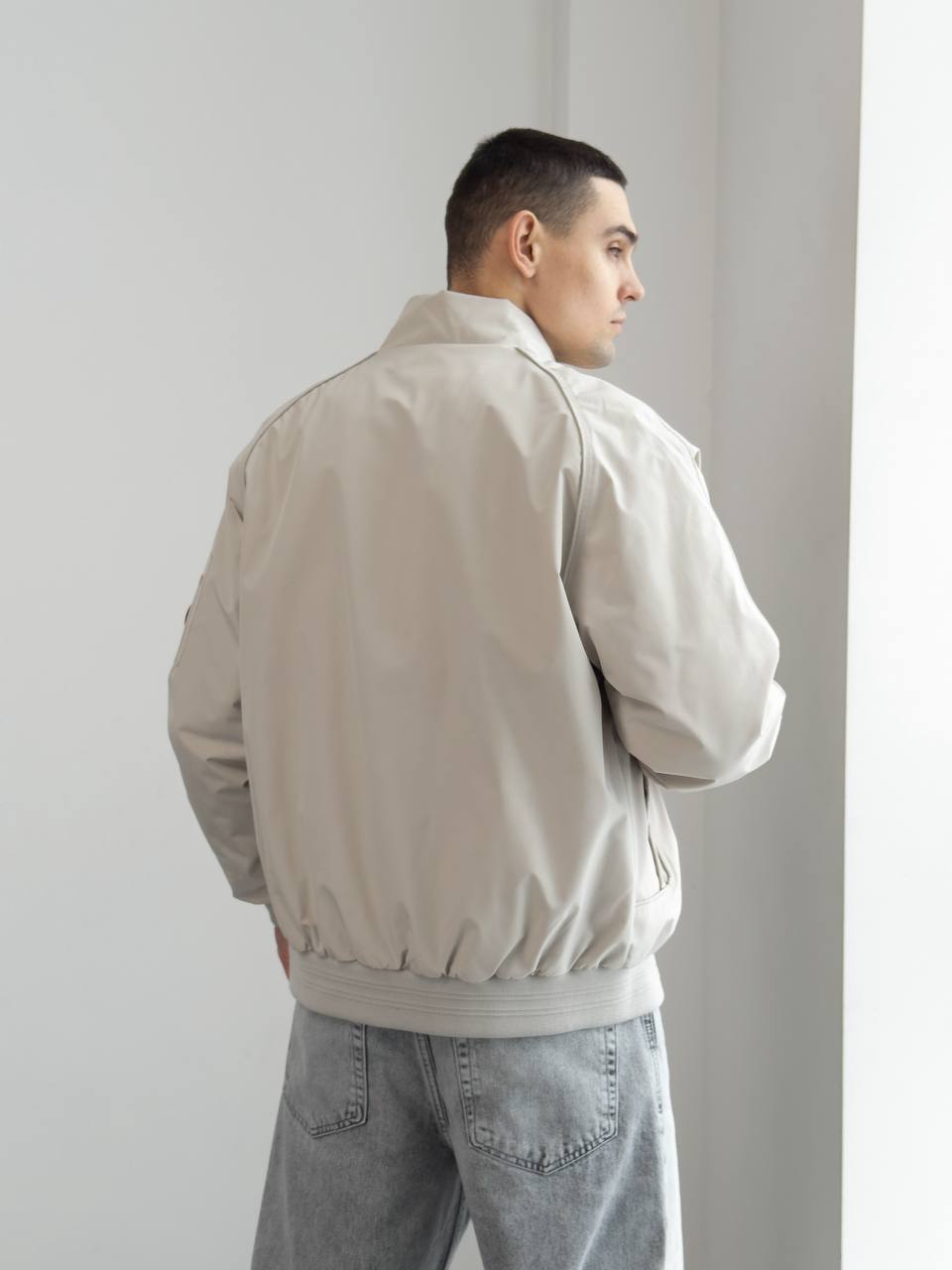 Мужская Демисезонная Светло-Серая Куртка Бомбер Свободного Кроя с Высокой Горловиной