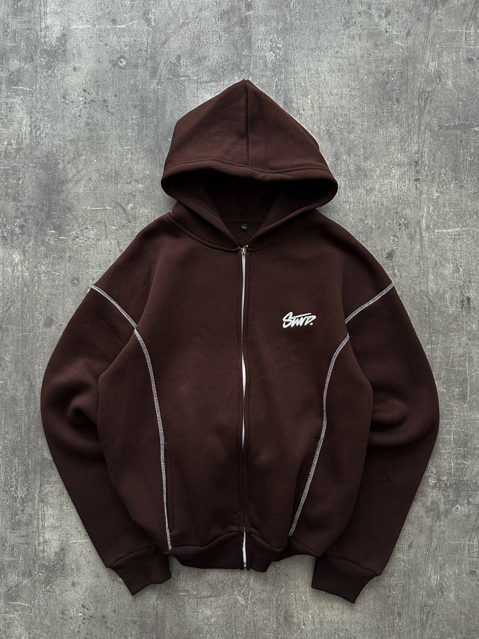 Мужская Коричневая Кофта Зипка Оверсайз – Зип Худи на Молнии с Контрастными Швами