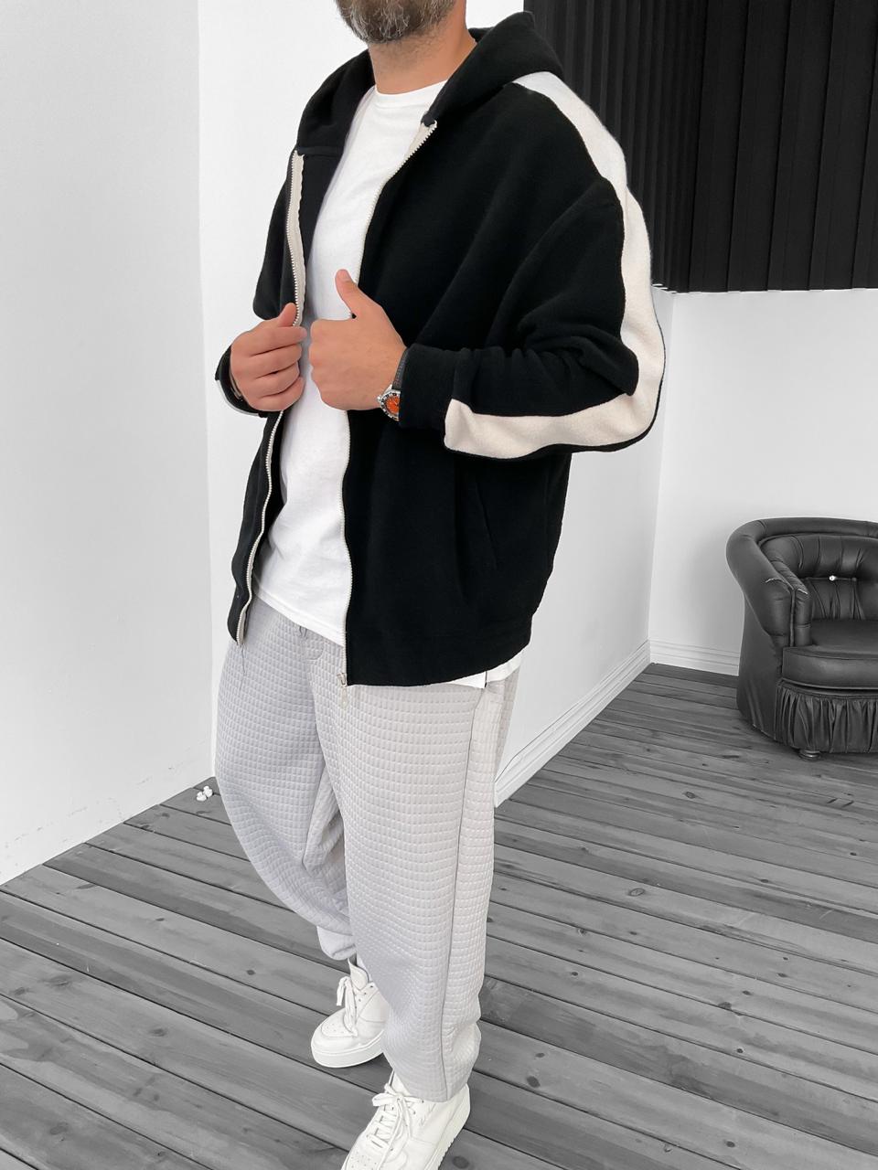 Мужская Теплая Флисовая Черная Кофта Зипка с Лампасами – Зип Худи Оверсайз на Молнии