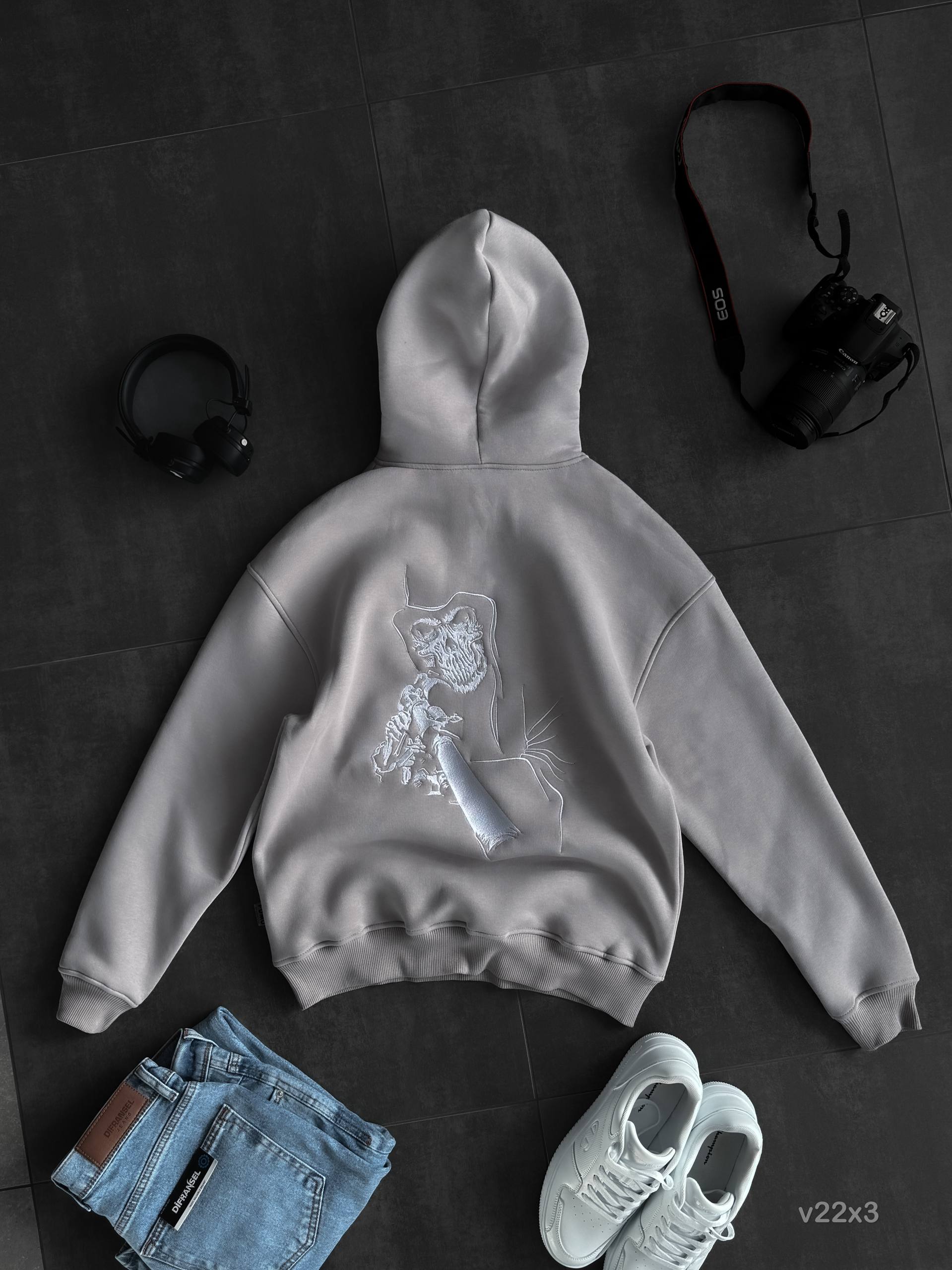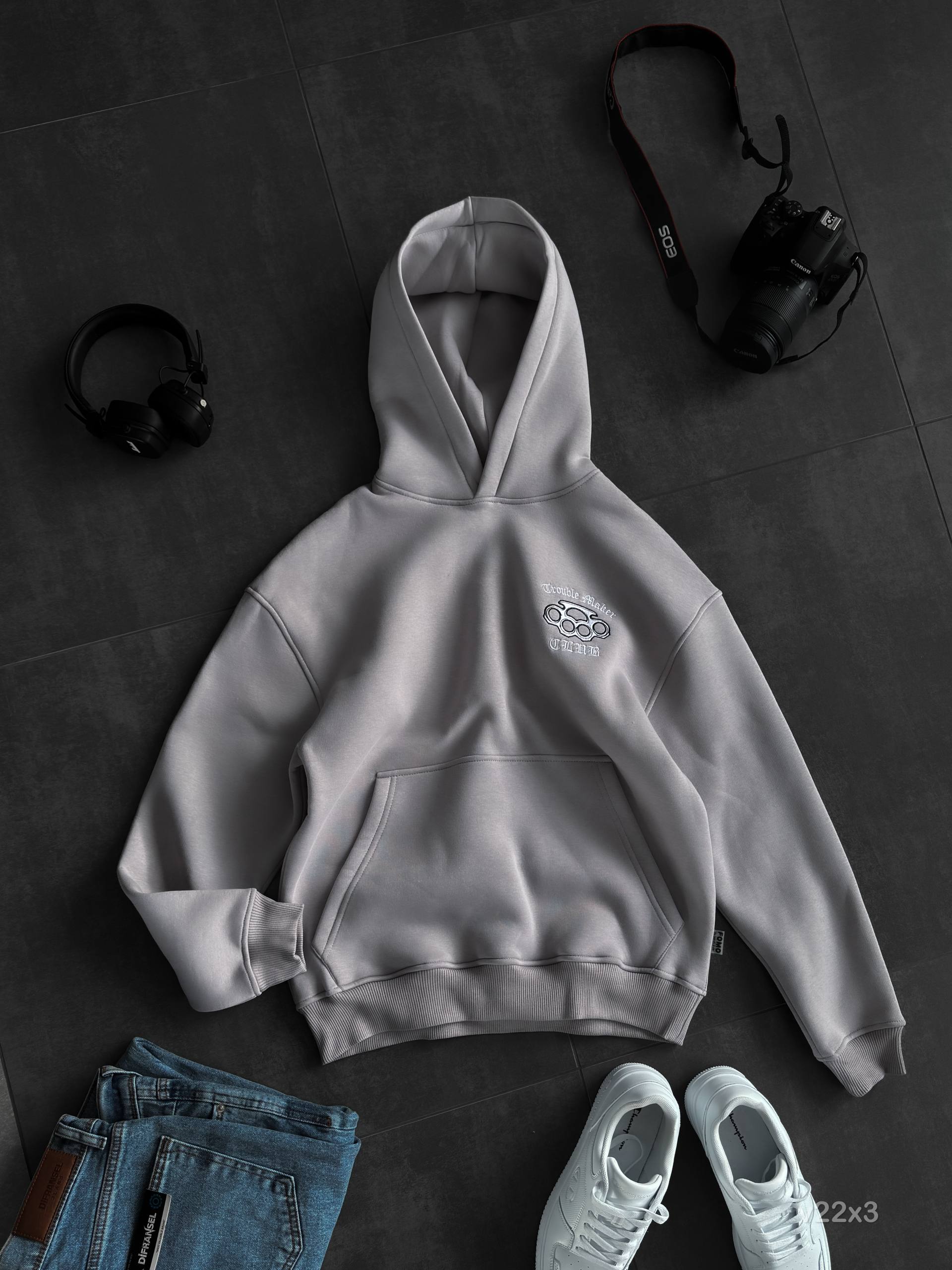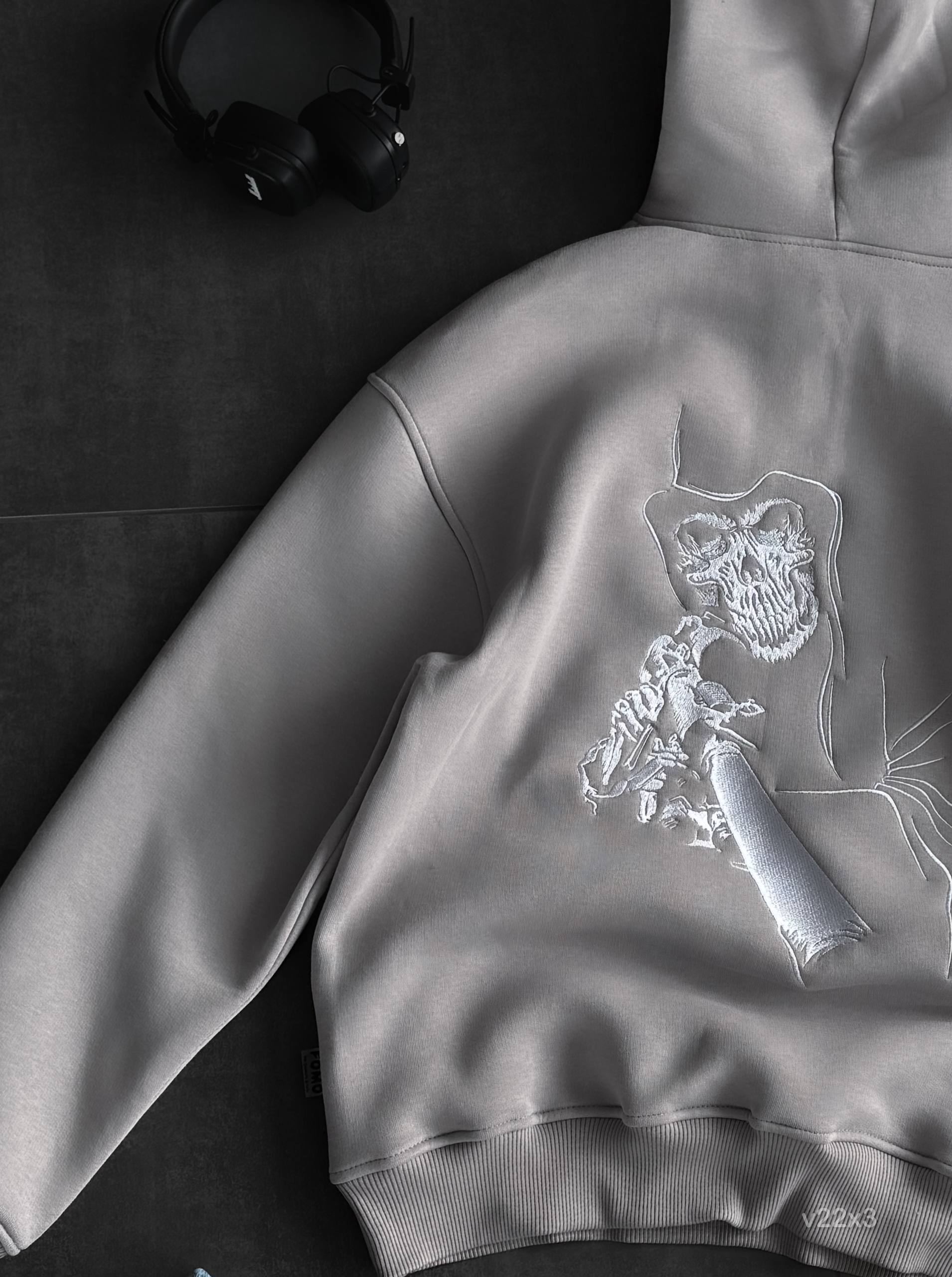 Мужское Серое Худи на Флисе с Вышивкой – Утепленное Свободного Кроя