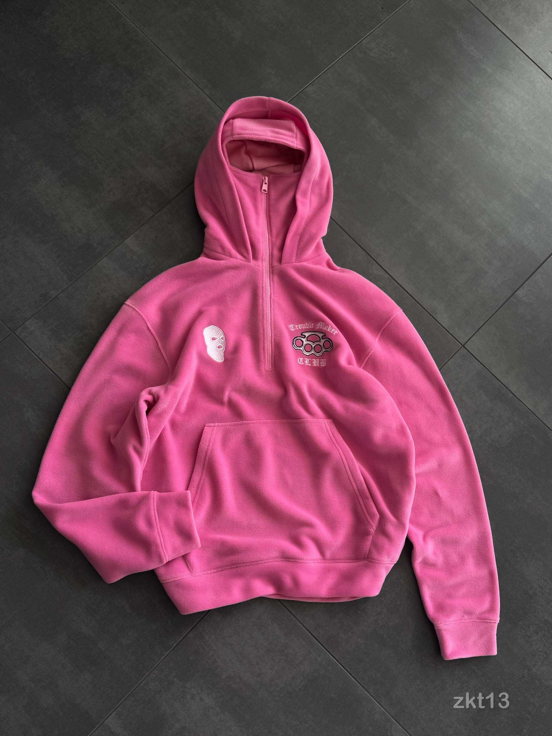 Мужское Теплое Розовое Худи Оверсайз – Флисовое с Балаклавой и Вышивками