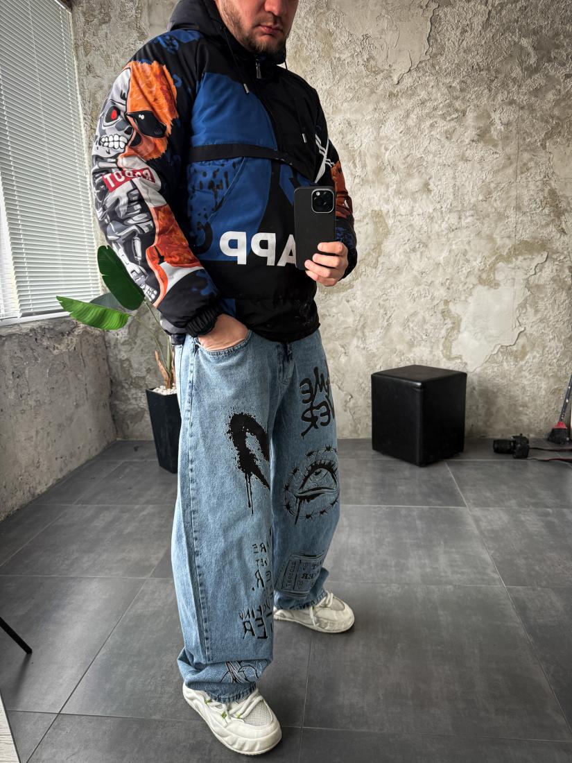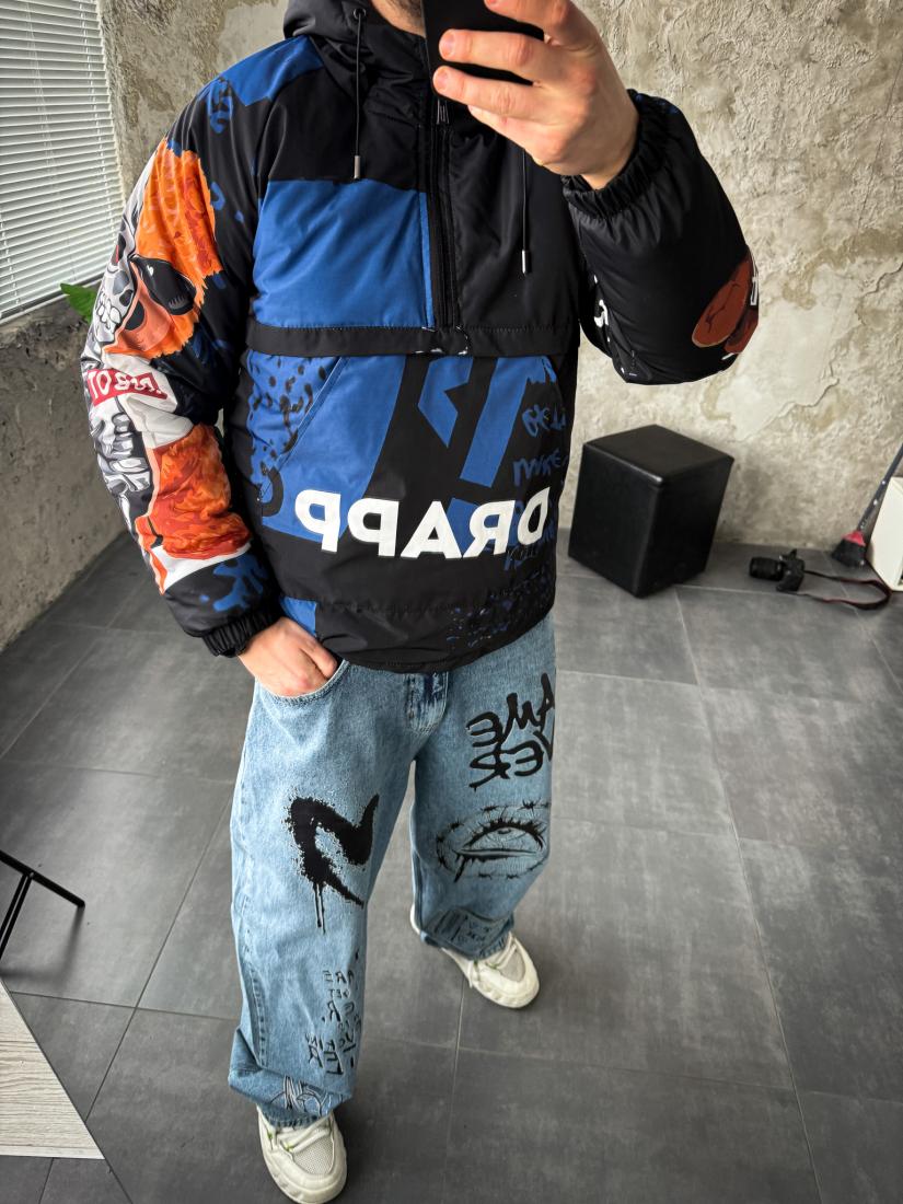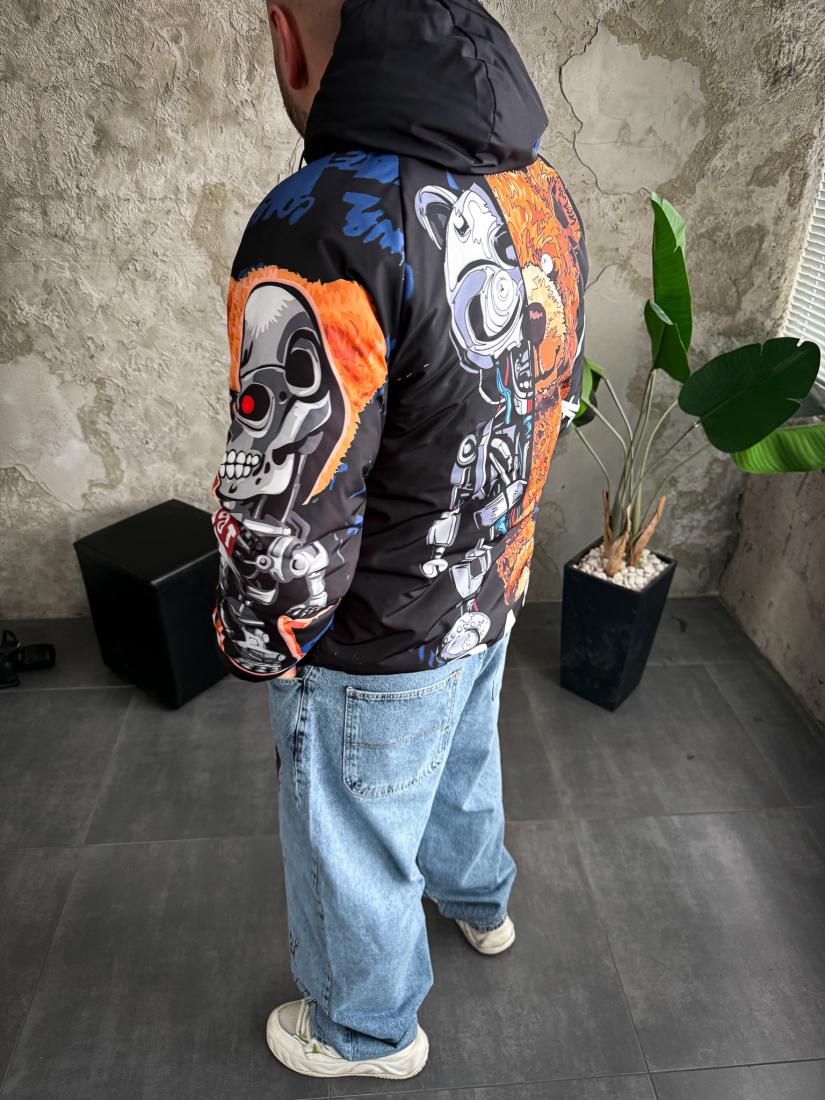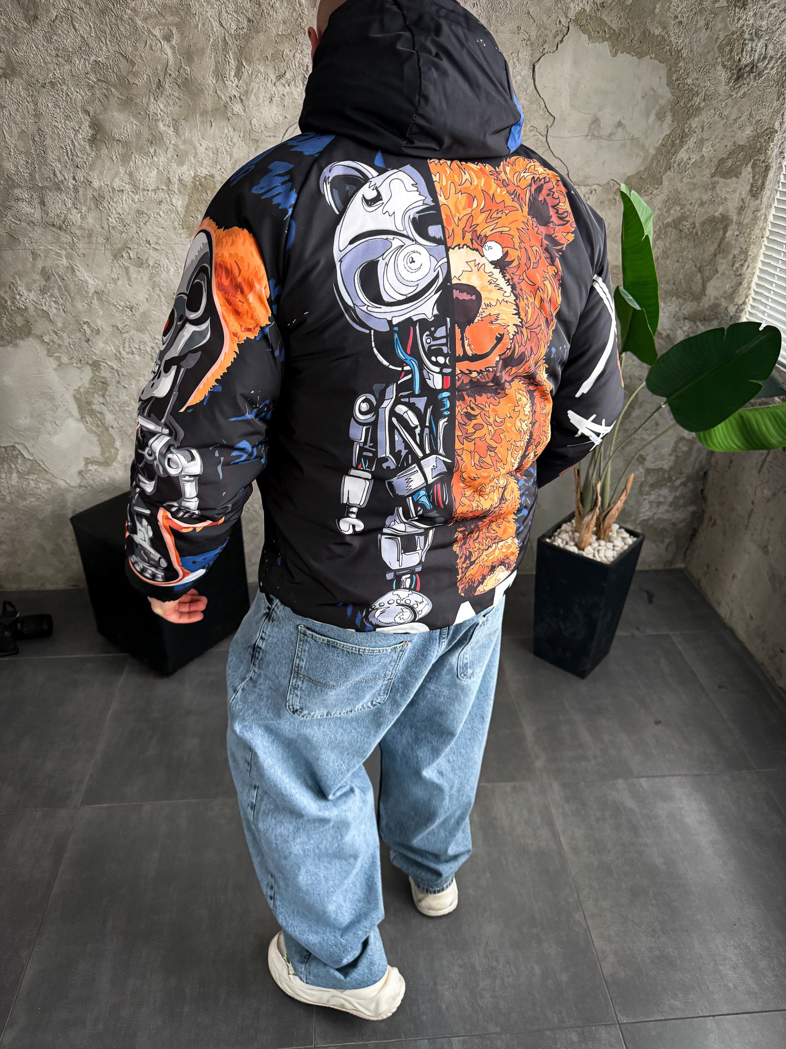 Мужской Ченый Анорак Оверсайз Плащевка – Утепленный с Капюшоном в Принт Медведь