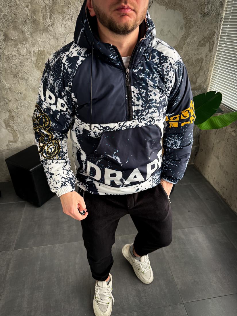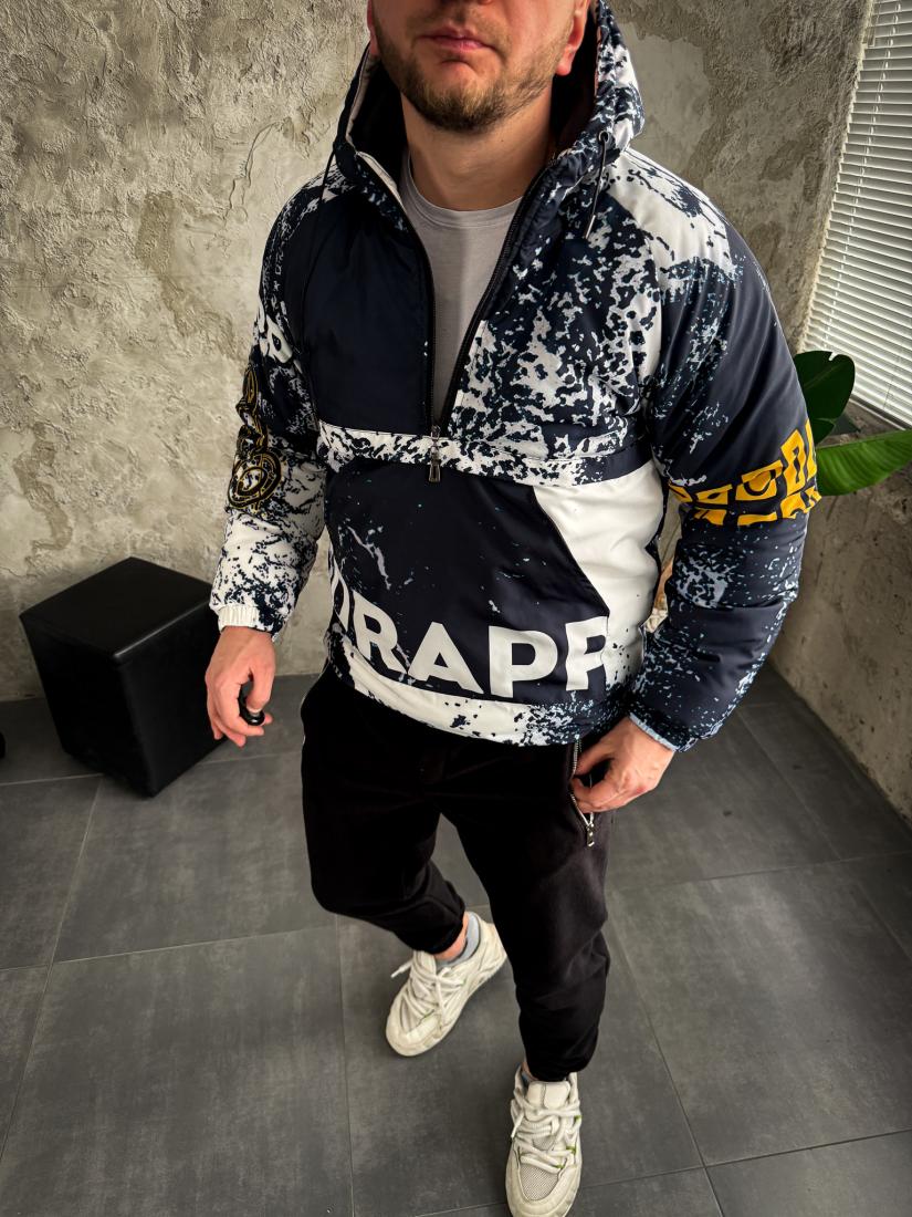 Мужской Темно-Синий Анорак Оверсайз Плащевка – Утепленный с Капюшоном в Принт Медведь