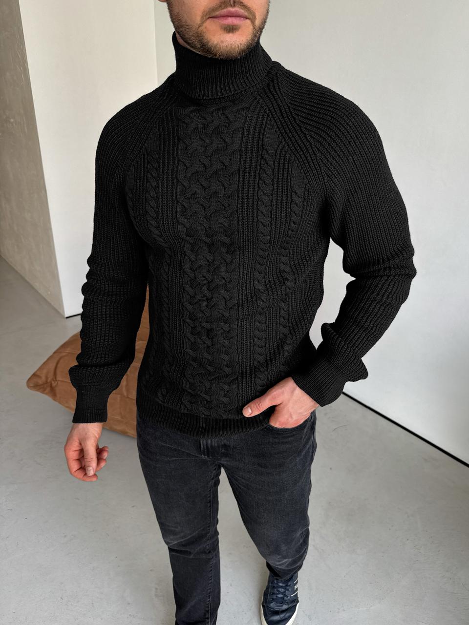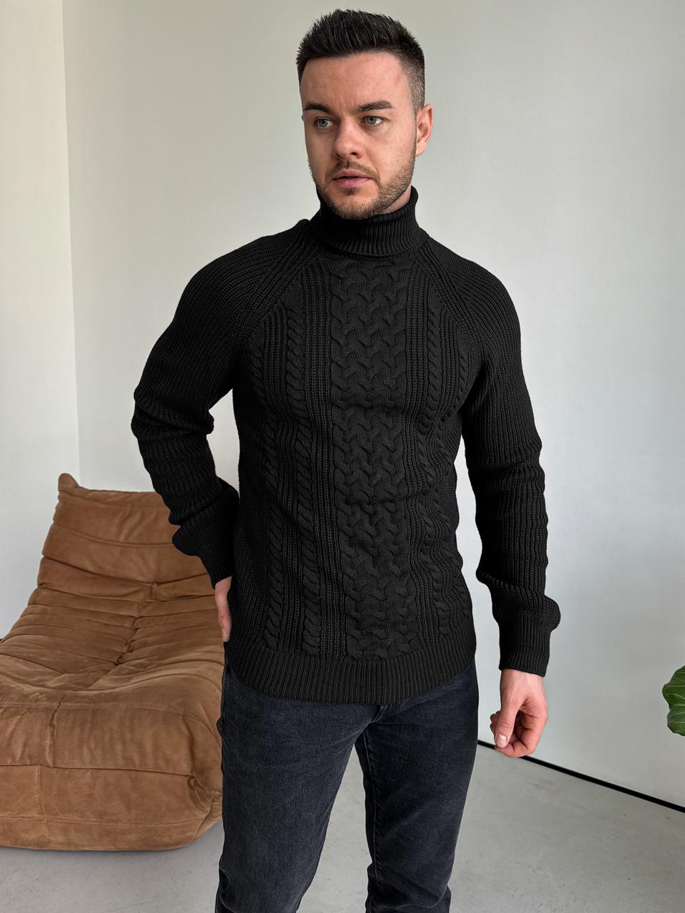 Мужской Теплый Классический Черный Свитер Косичка с Высокой Горловиной