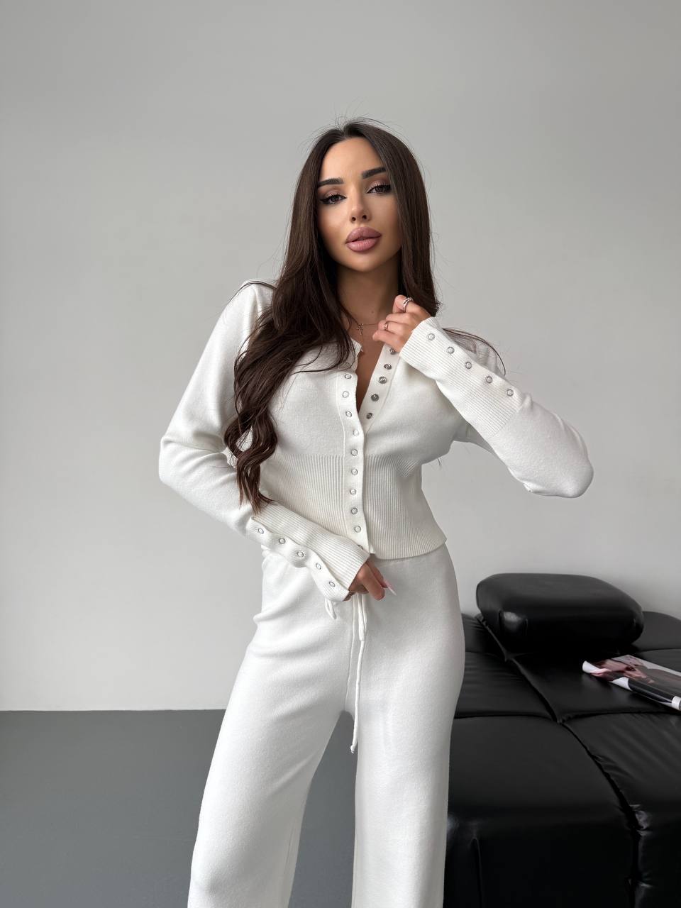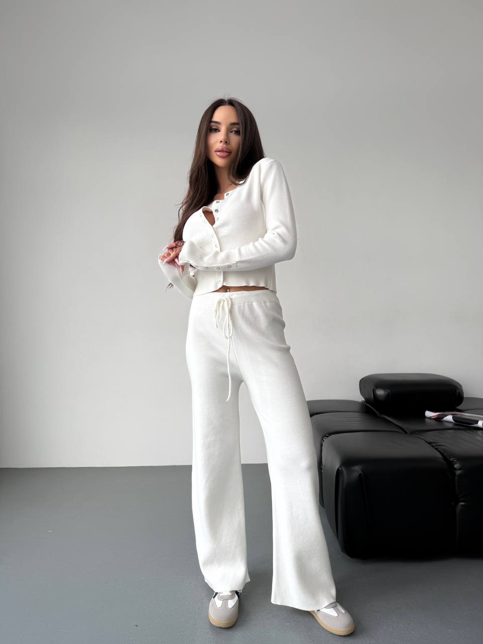 Женский Базовый Белый Костюм Двойка – Приталенная Кофта на Кнопках + Свободные Штаны