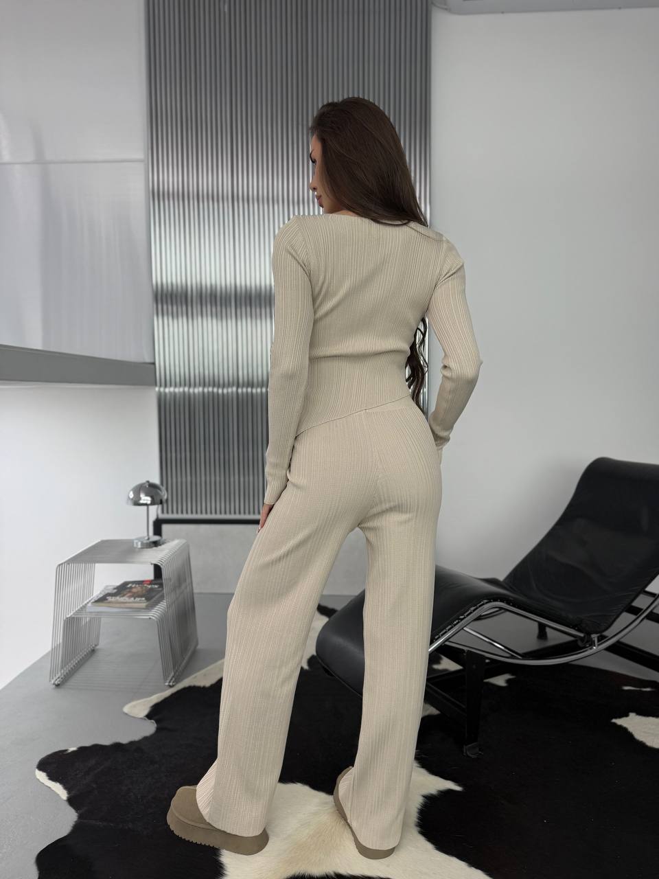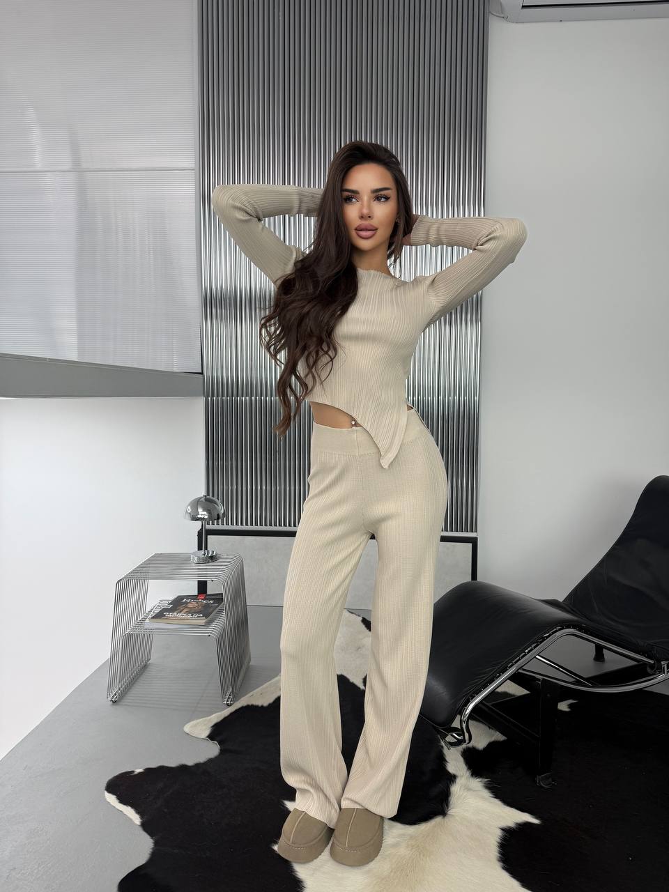 Женский Базовый Бежевый Костюм из Фактурной Ткани – Асимметричная Кофта + Свободные Штаны
