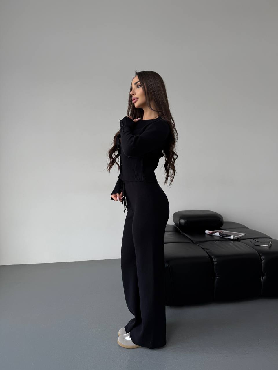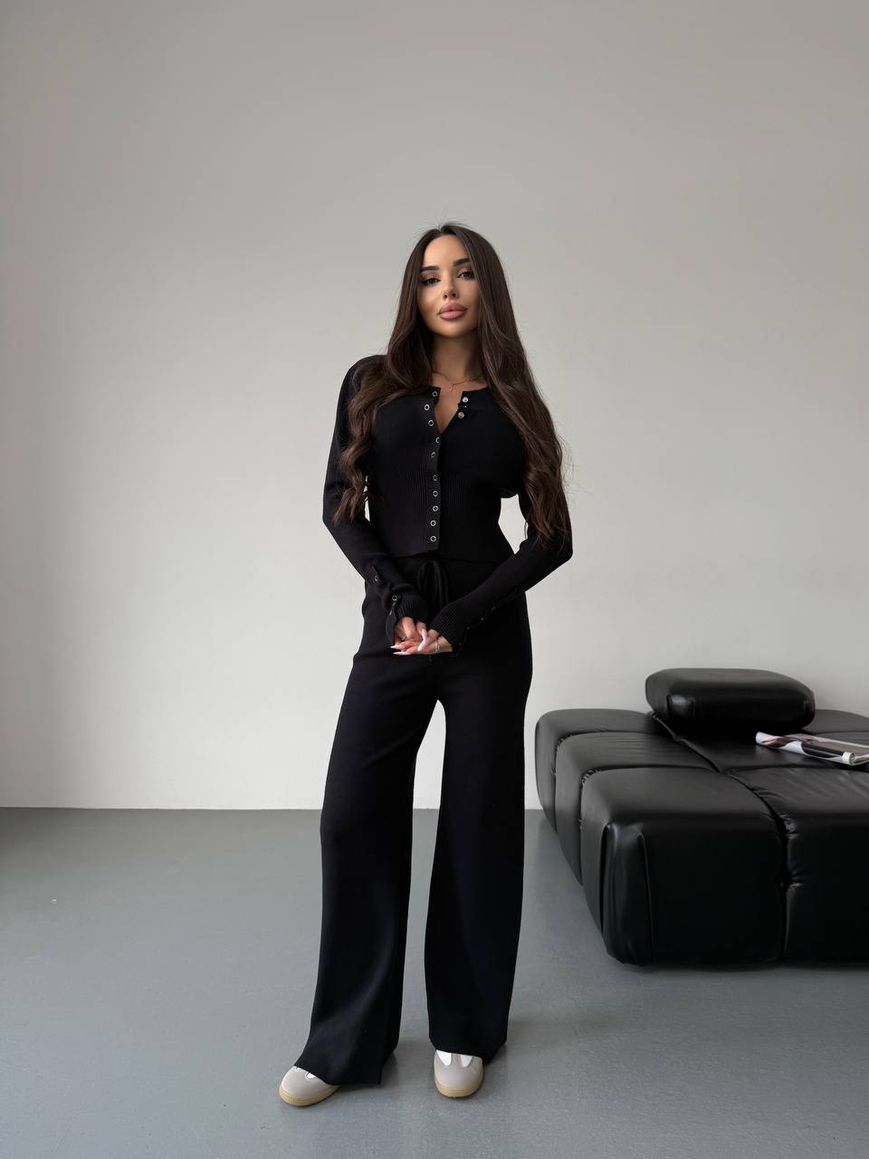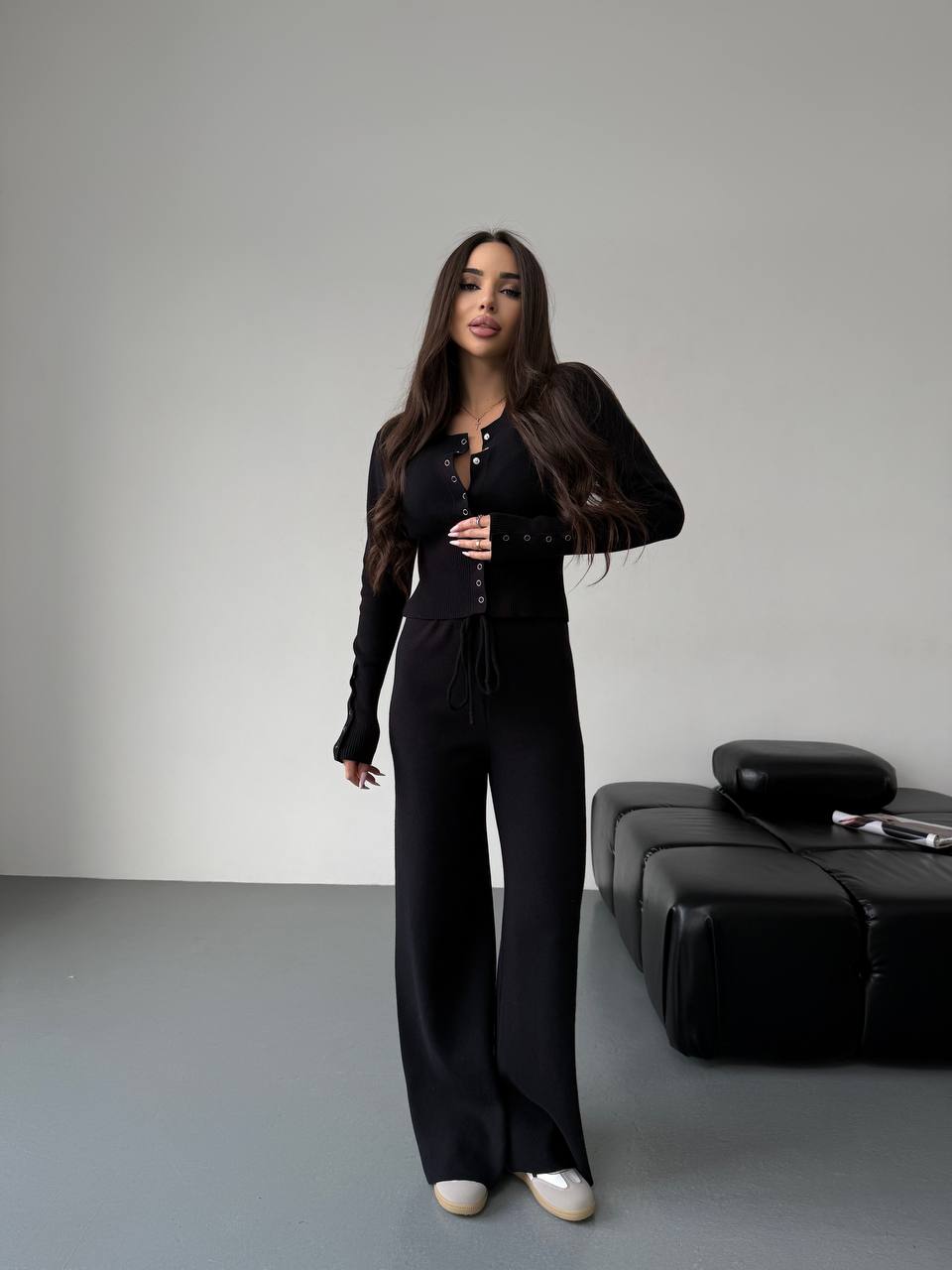 Женский Базовый Черный Костюм Двойка – Приталенная Кофта на Кнопках + Свободные Штаны