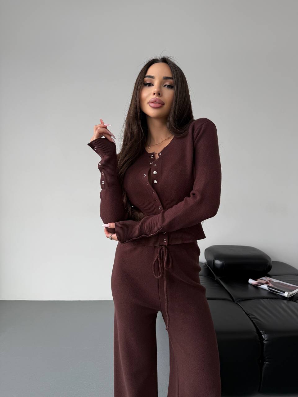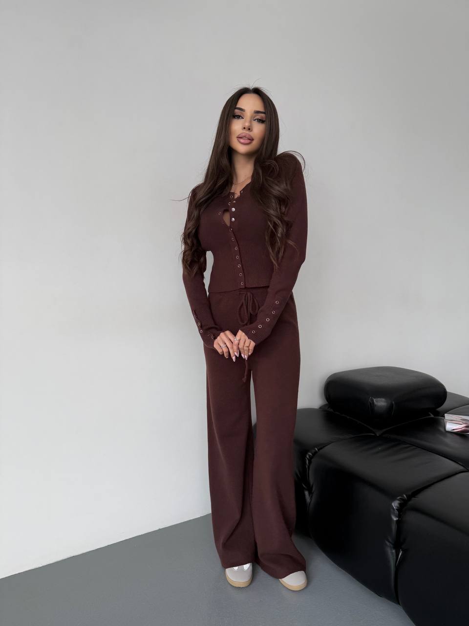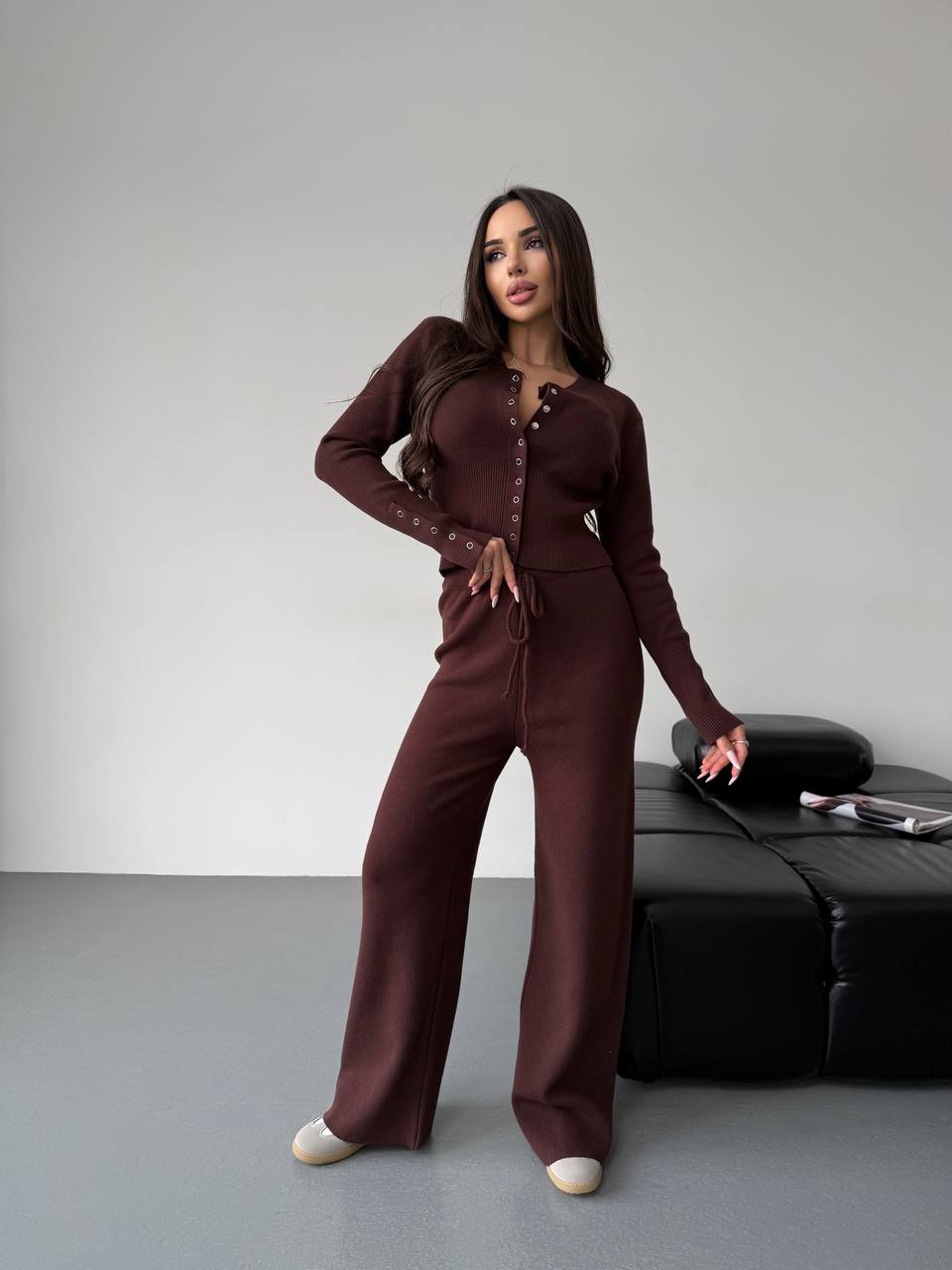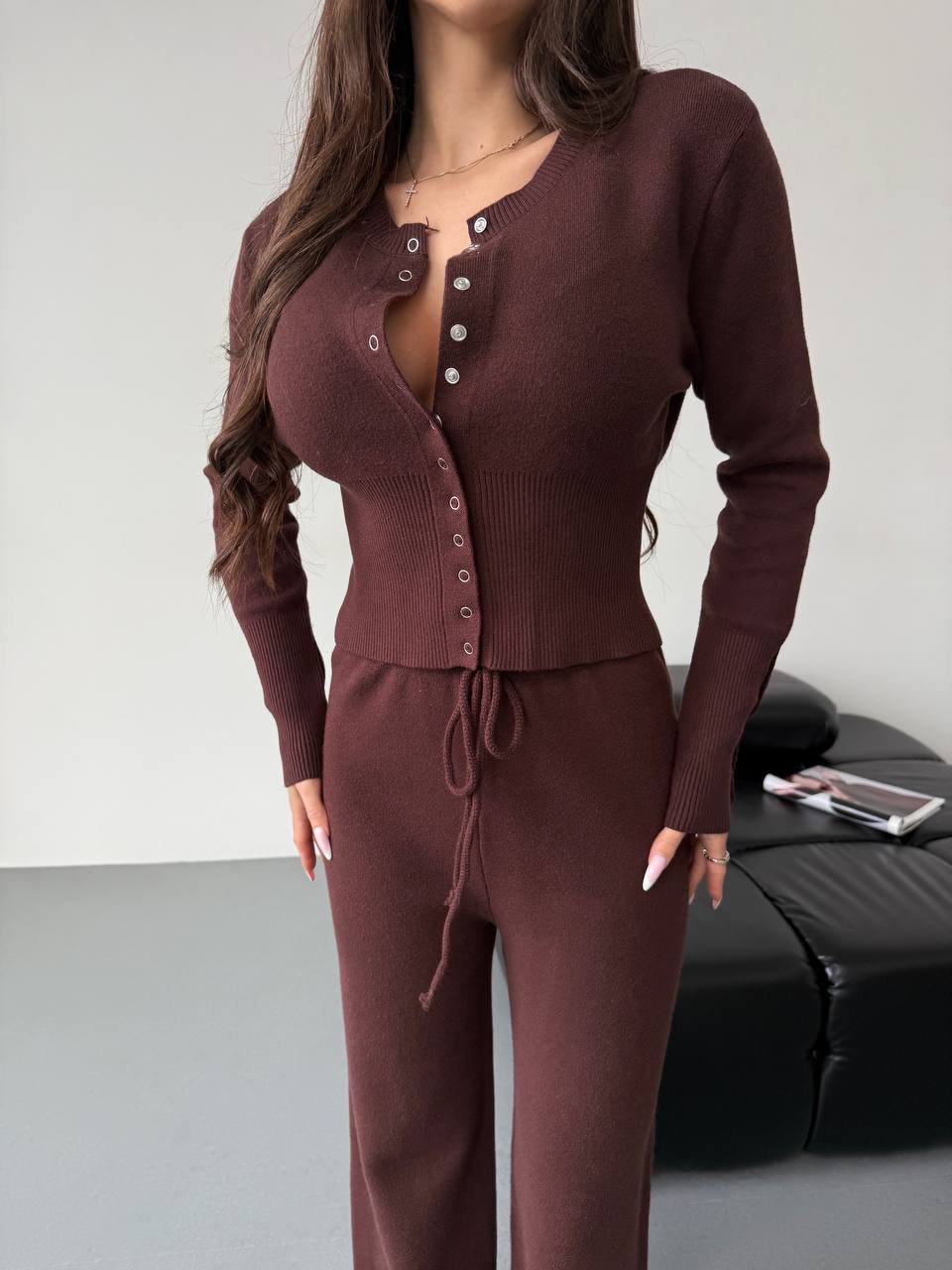 Женский Базовый Коричневый Костюм Двойка – Приталенная Кофта на Кнопках + Свободные Штаны