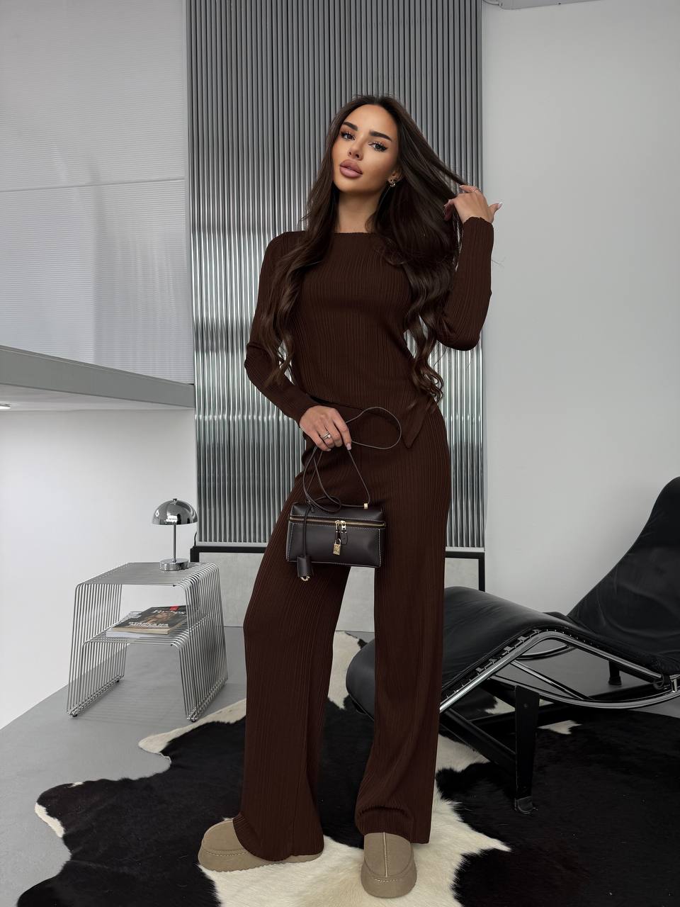 Женский Базовый Коричневый Костюм из Фактурной Ткани – Асимметричная Кофта + Свободные Штаны