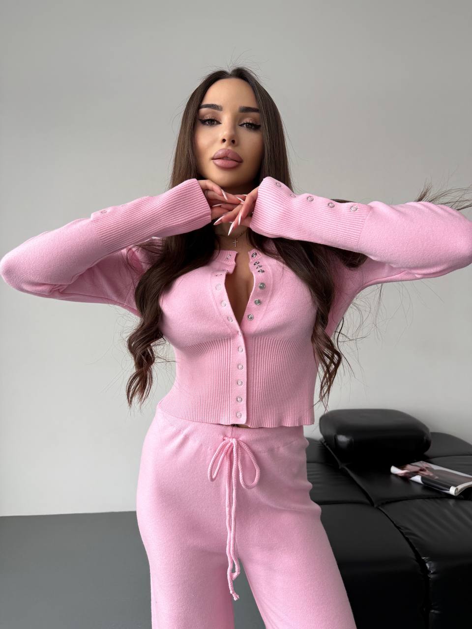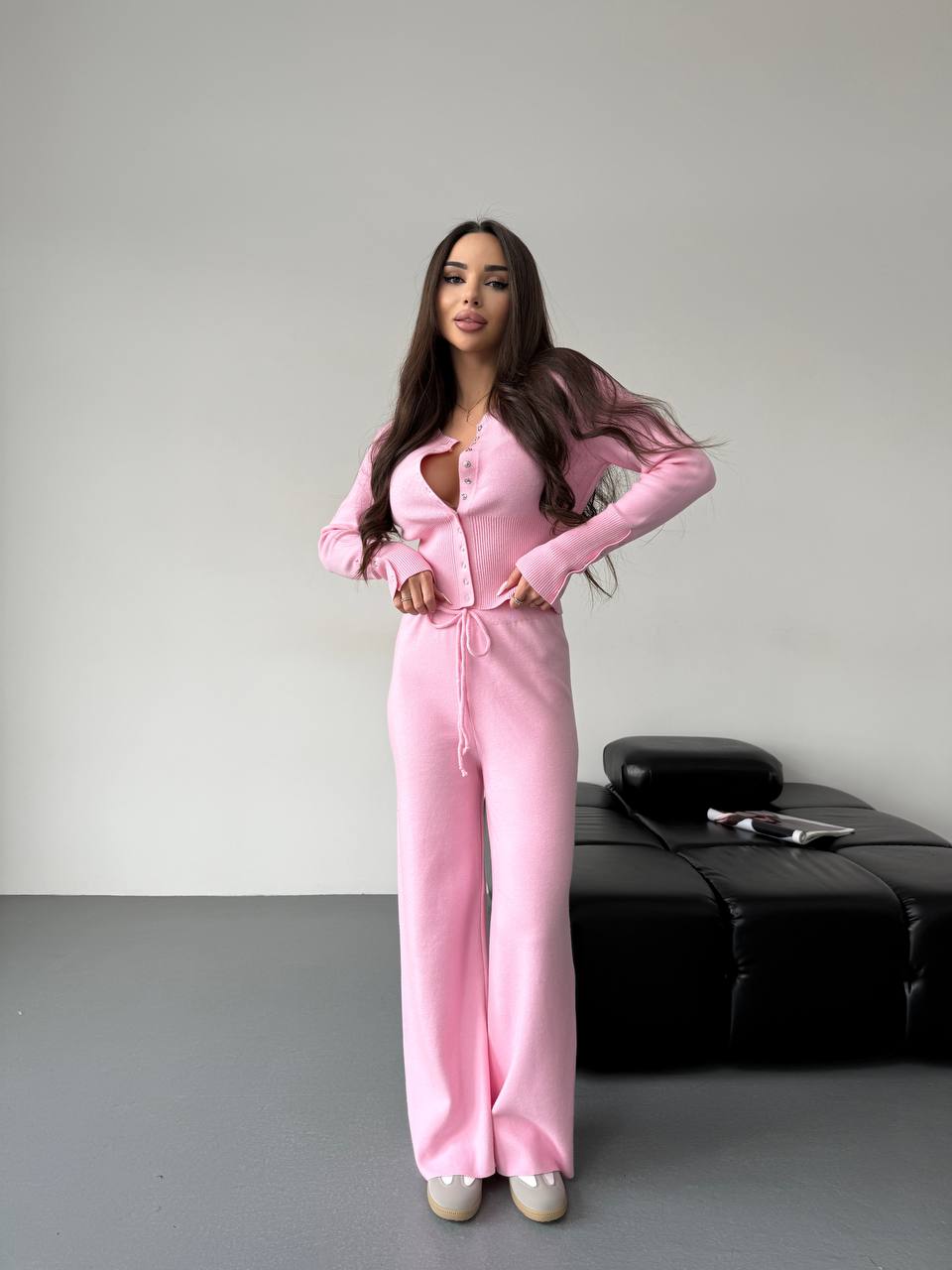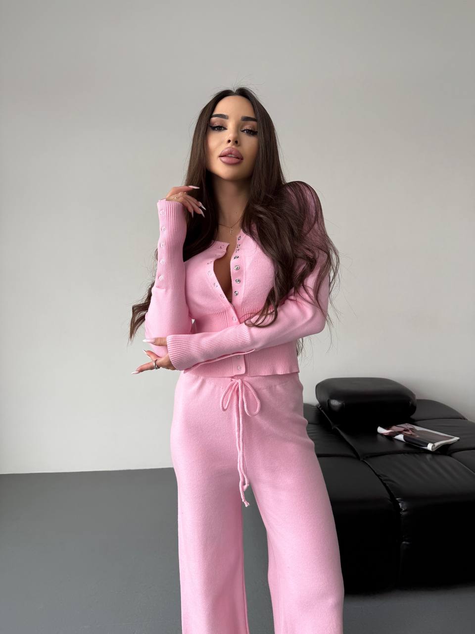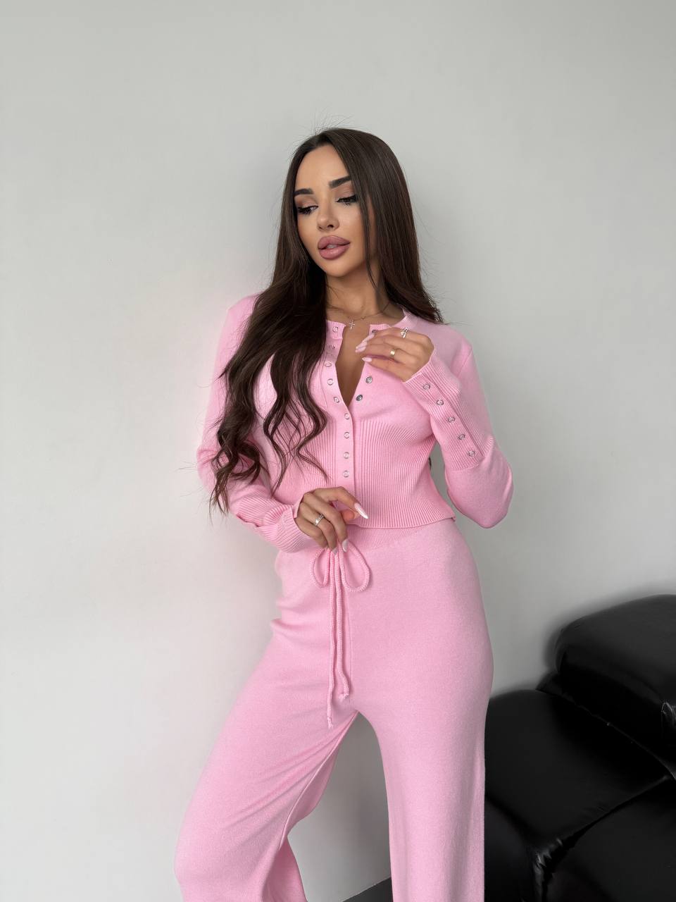 Женский Базовый Розовый Костюм Двойка – Приталенная Кофта на Кнопках + Свободные Штаны