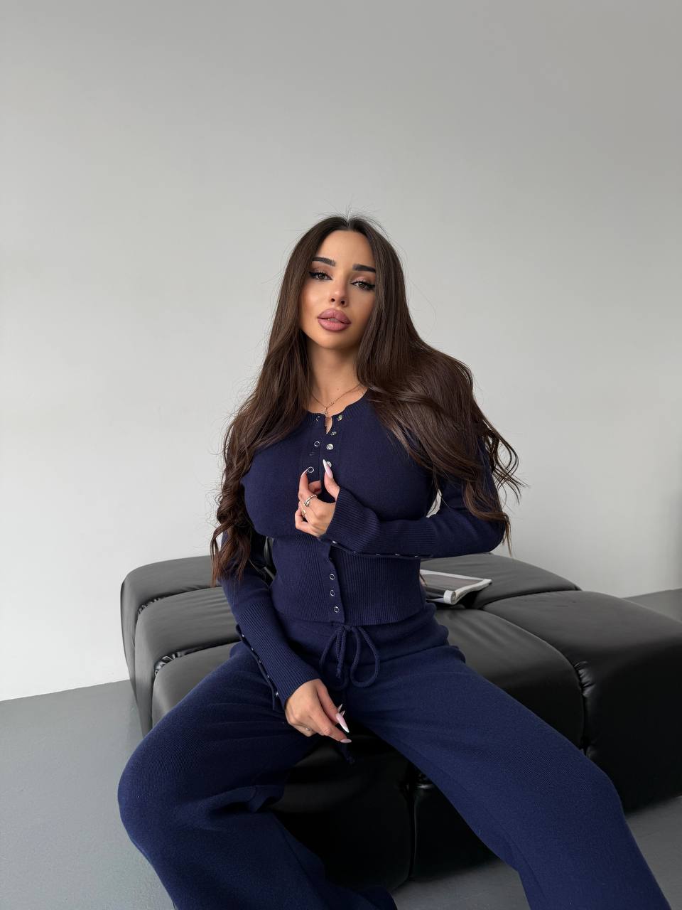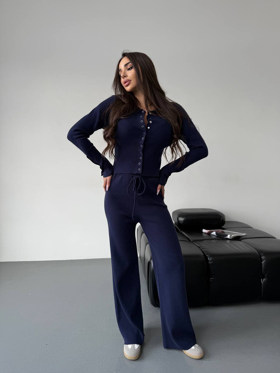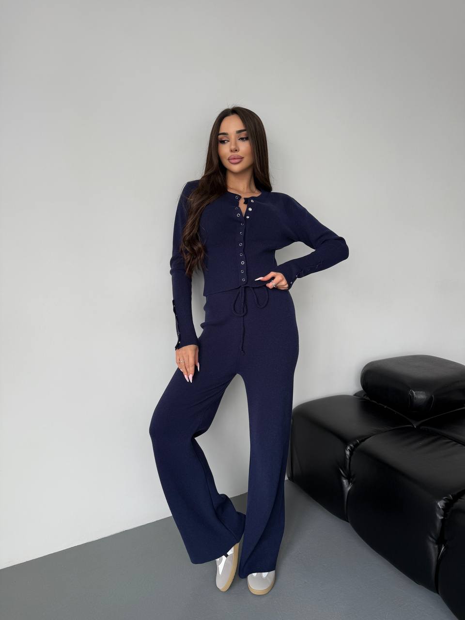Женский Базовый Темно-Синий Костюм Двойка – Приталенная Кофта на Кнопках + Свободные Штаны