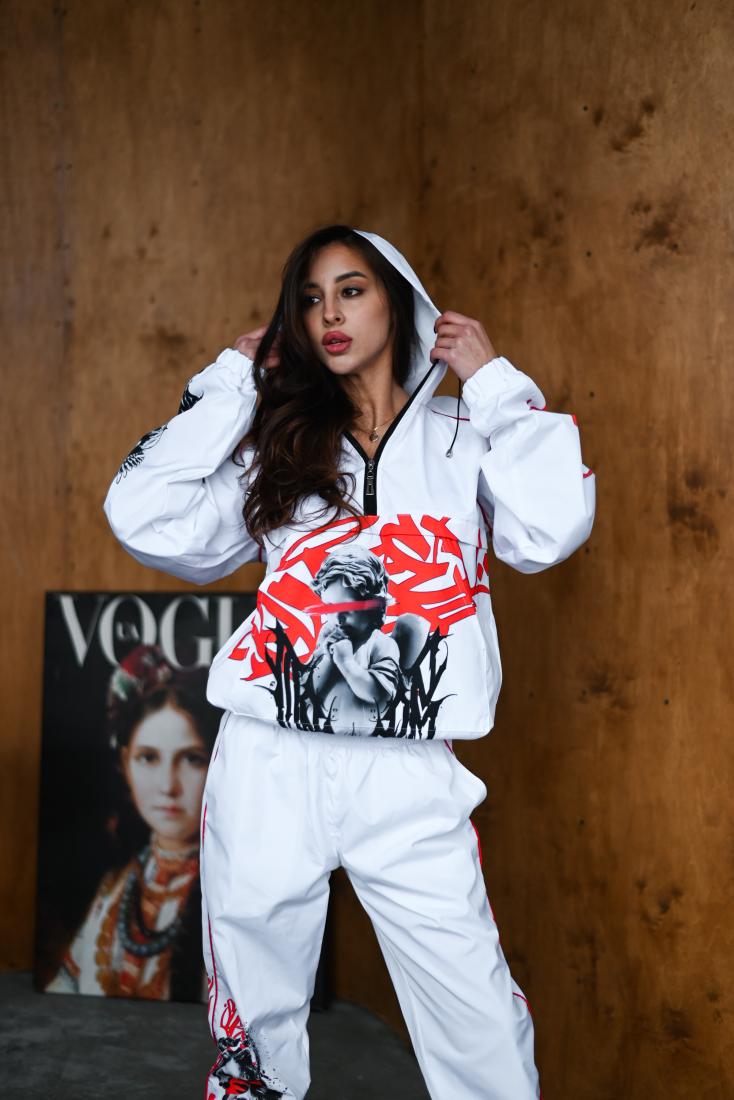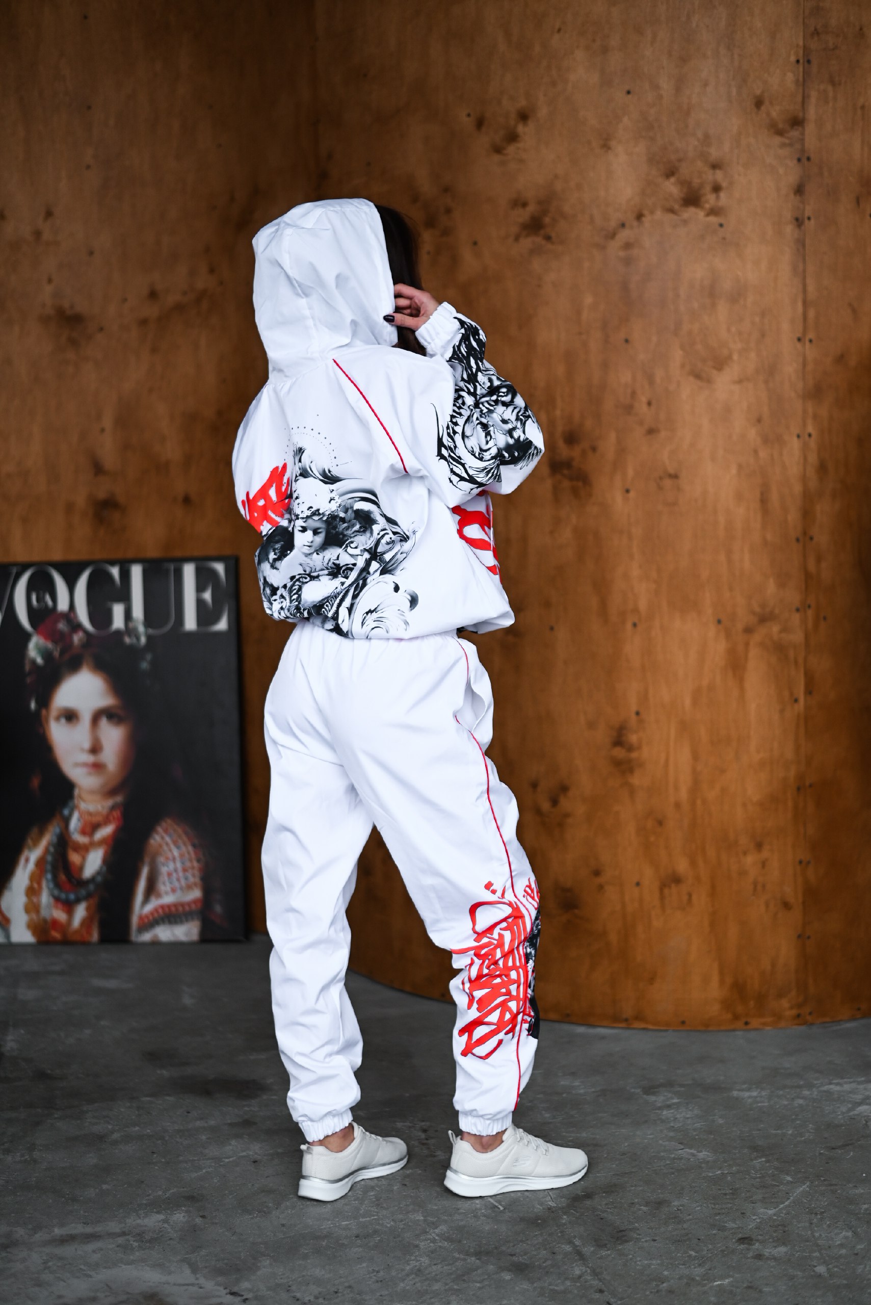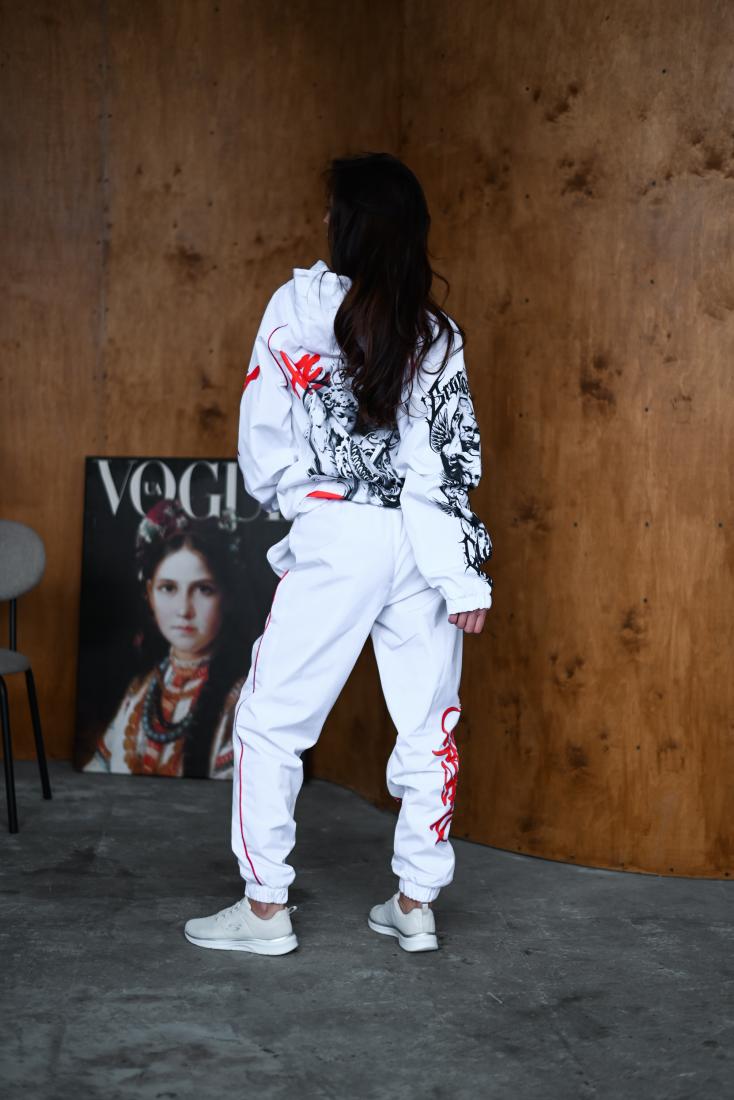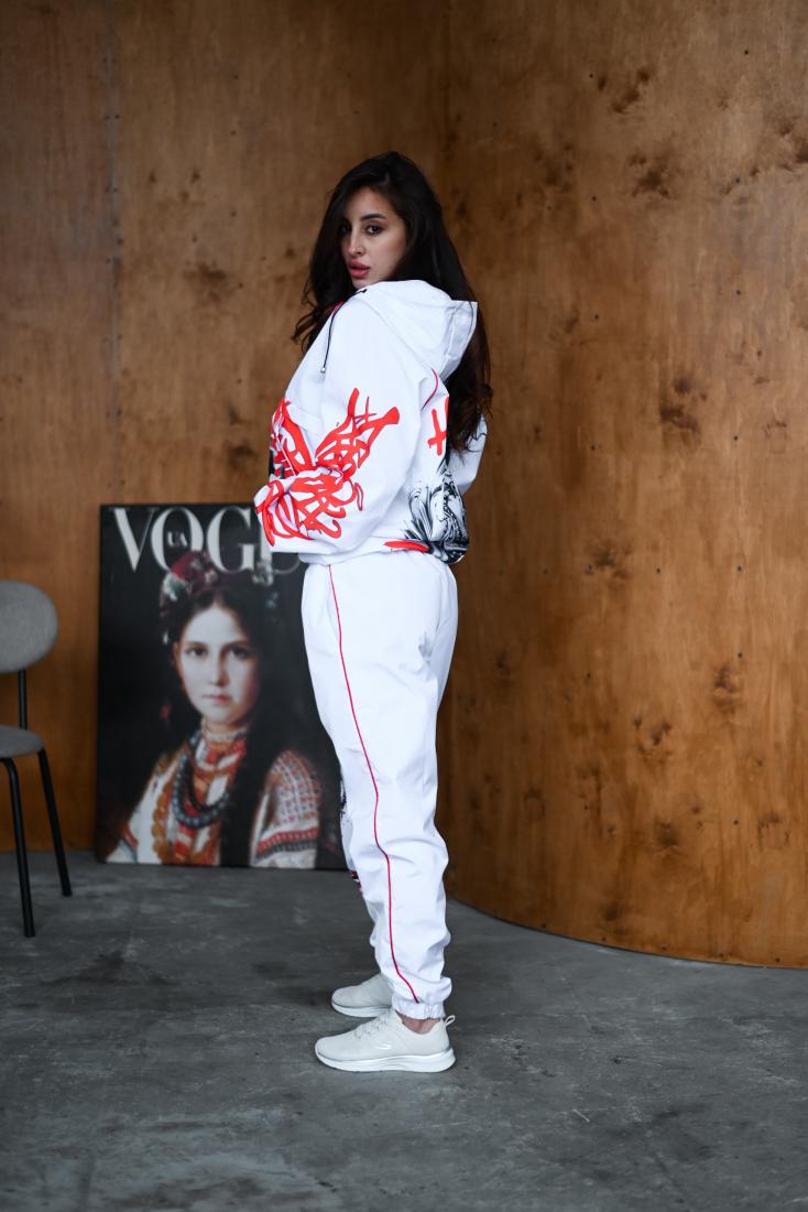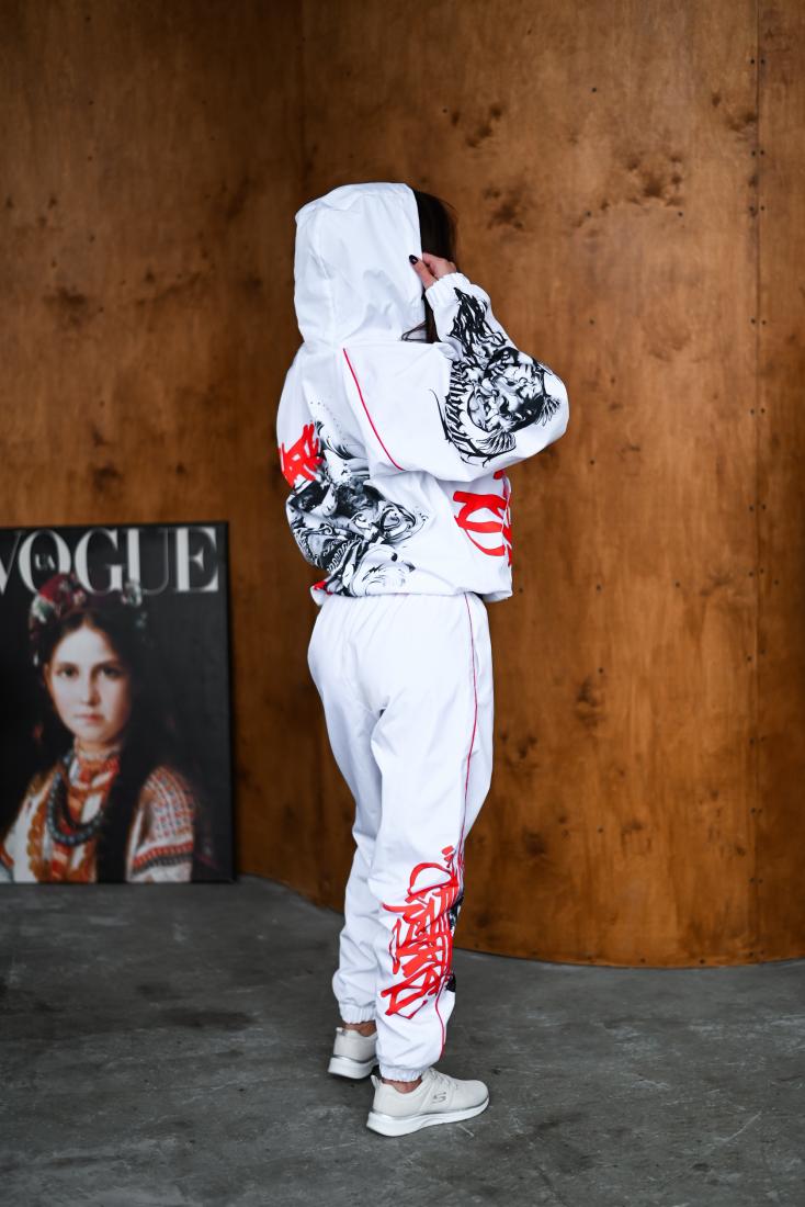 Женский Белый Спортивный Костюм Плащевка с Принтами и Кантом – Анорак + Штаны Джоггеры