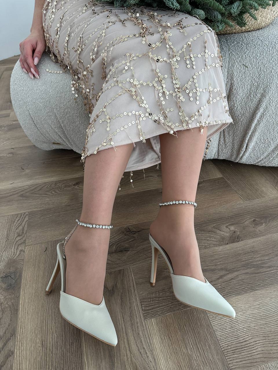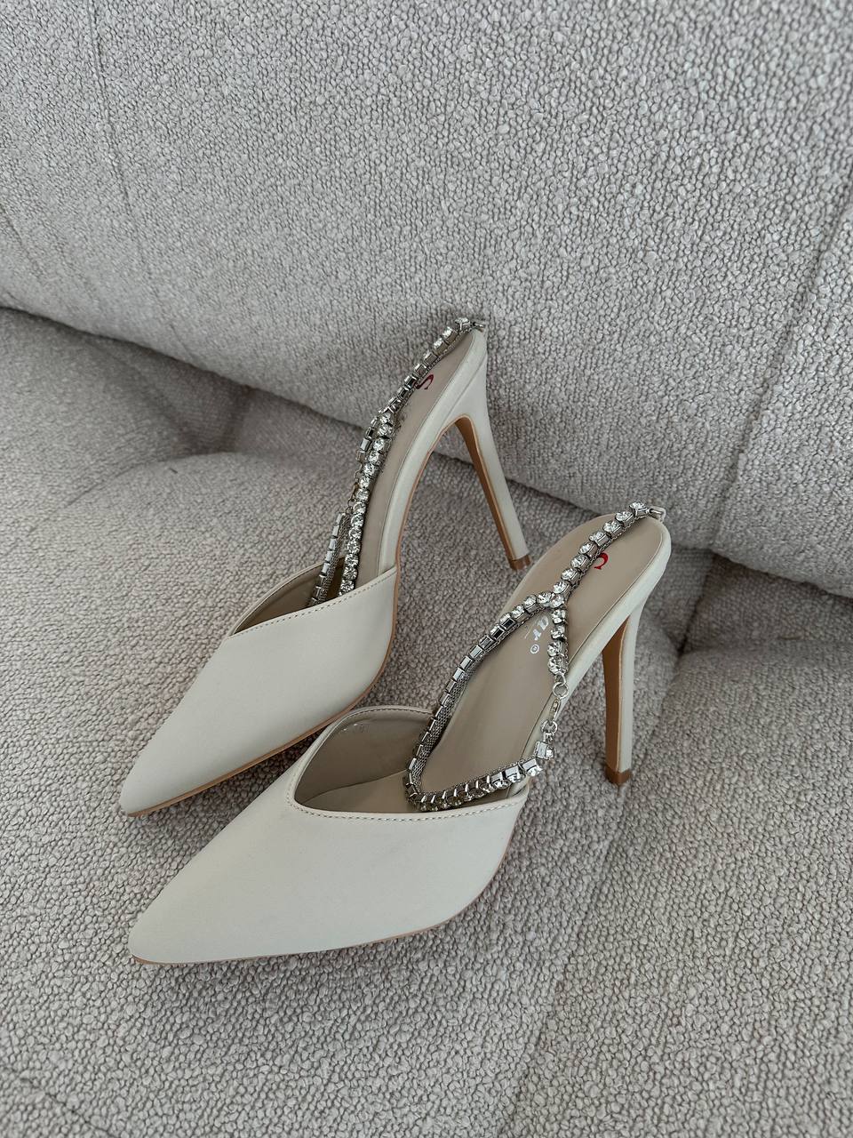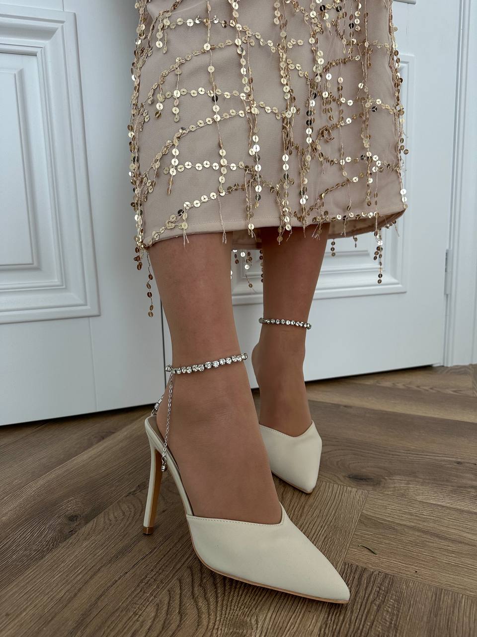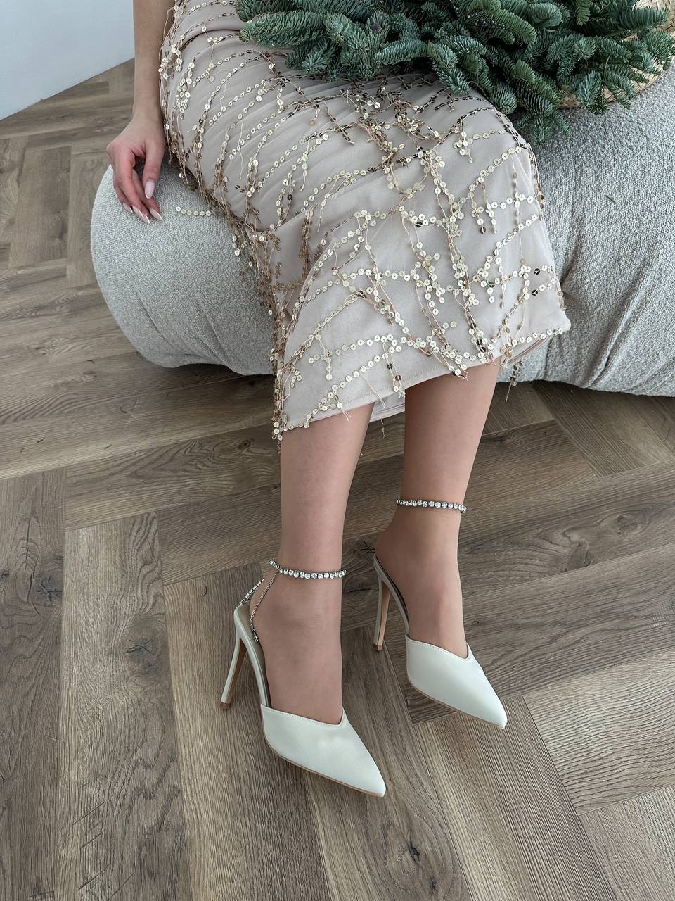 Женски Атласные Бежевые Туфли на Шпильке с Острым Носом и Камушками на Застежке