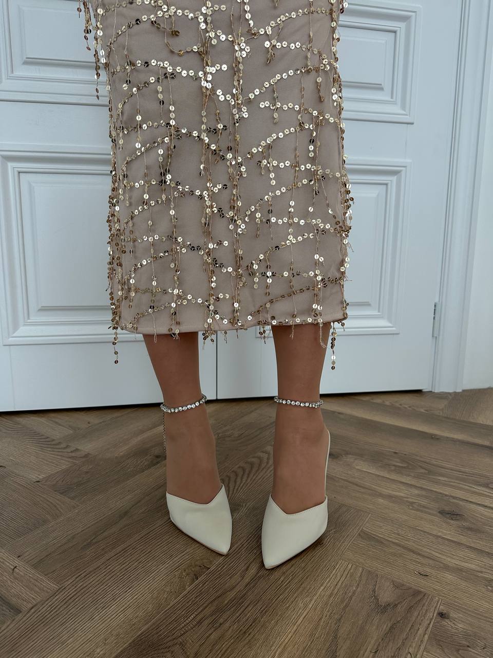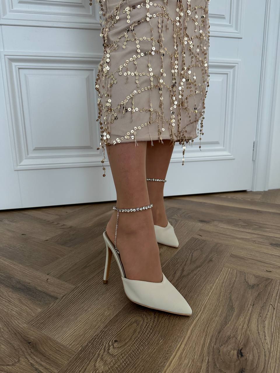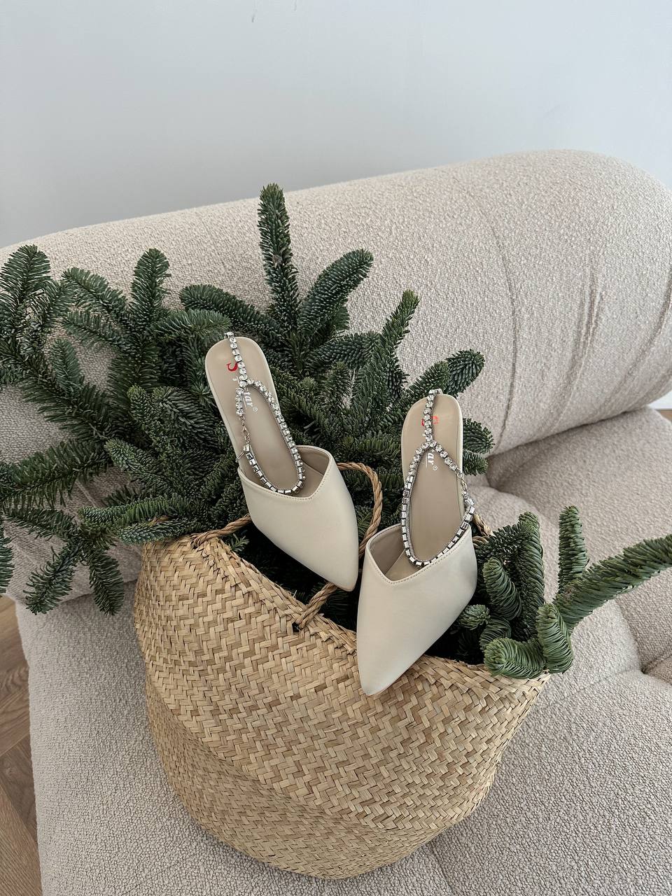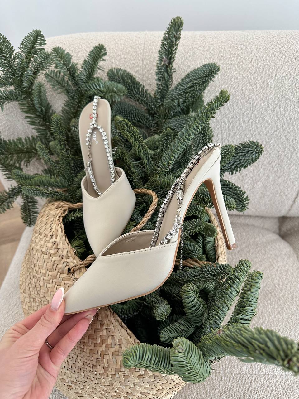Женски Атласные Бежевые Туфли на Шпильке с Острым Носом и Камушками на Застежке