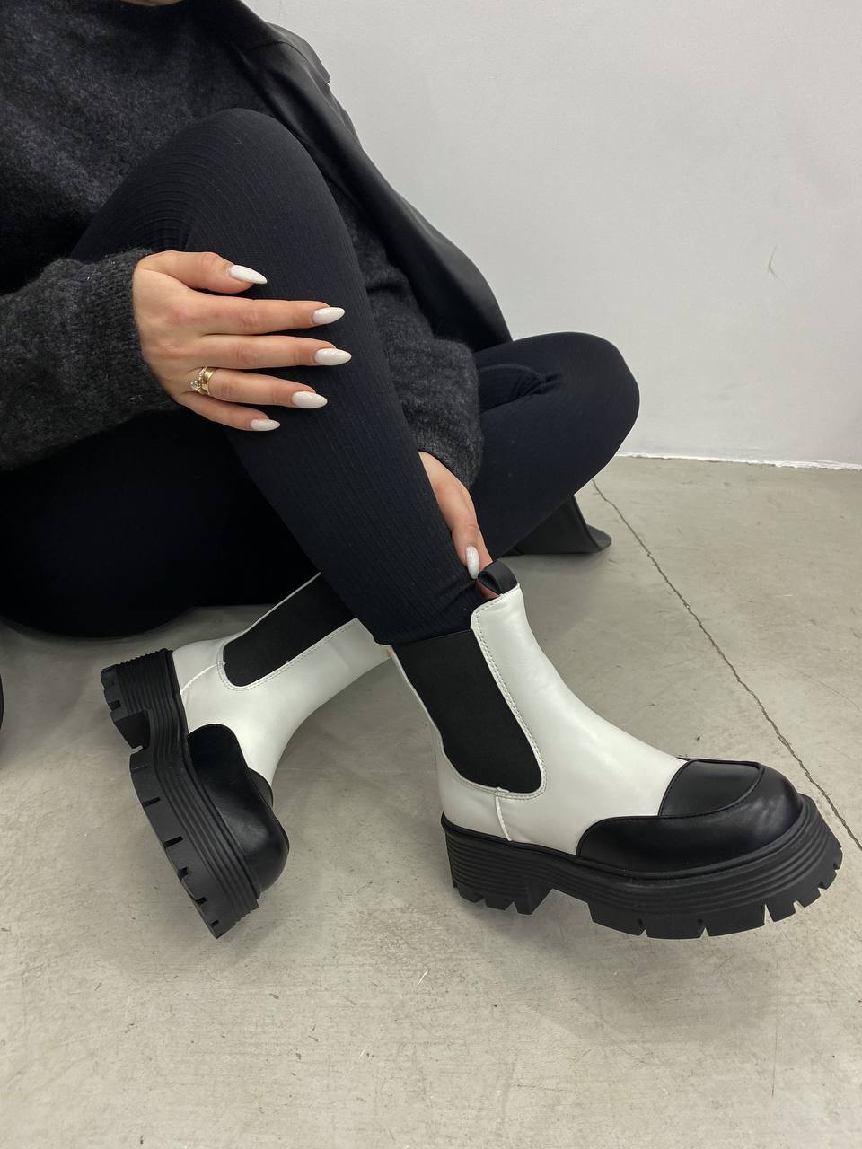 Женские Демисезонные Ботинки Челси Черные Белые – Высокие из Натуральной Кожи Внутри с Байкой
