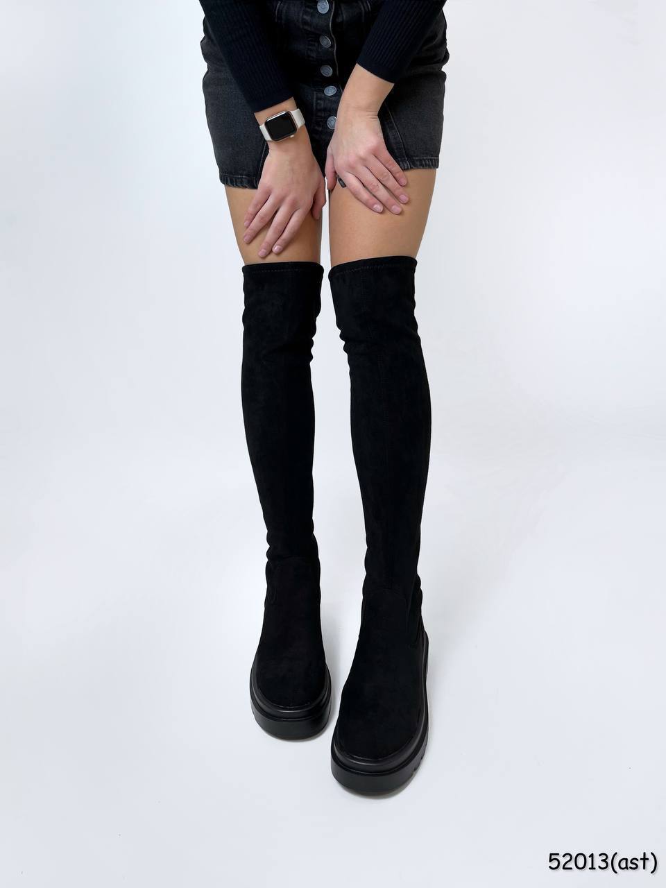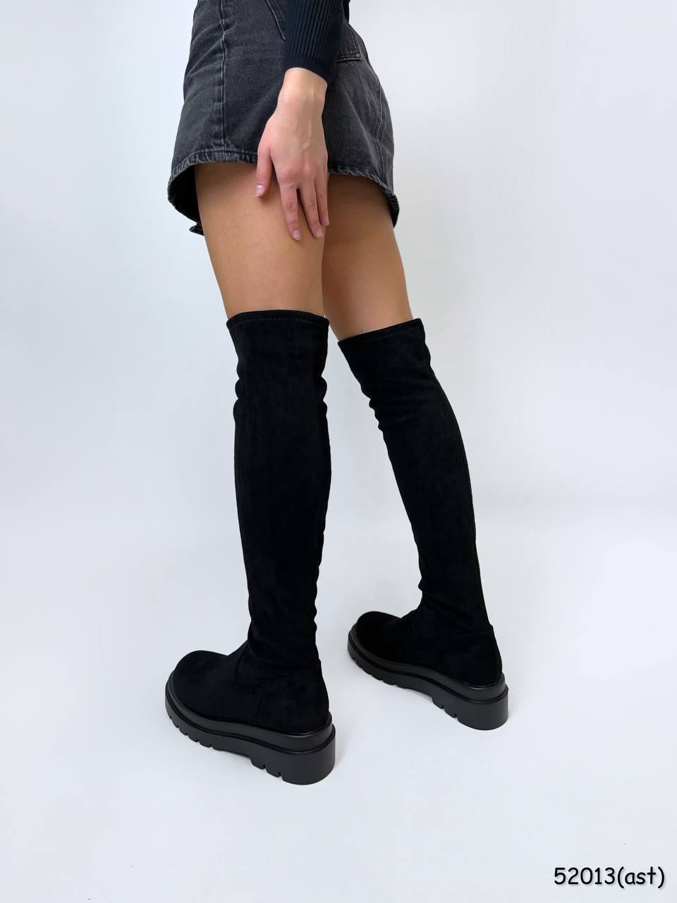 Женские Демисезонные Черные Сапоги Ботфорты – Высокие из Экозамши с Флисом