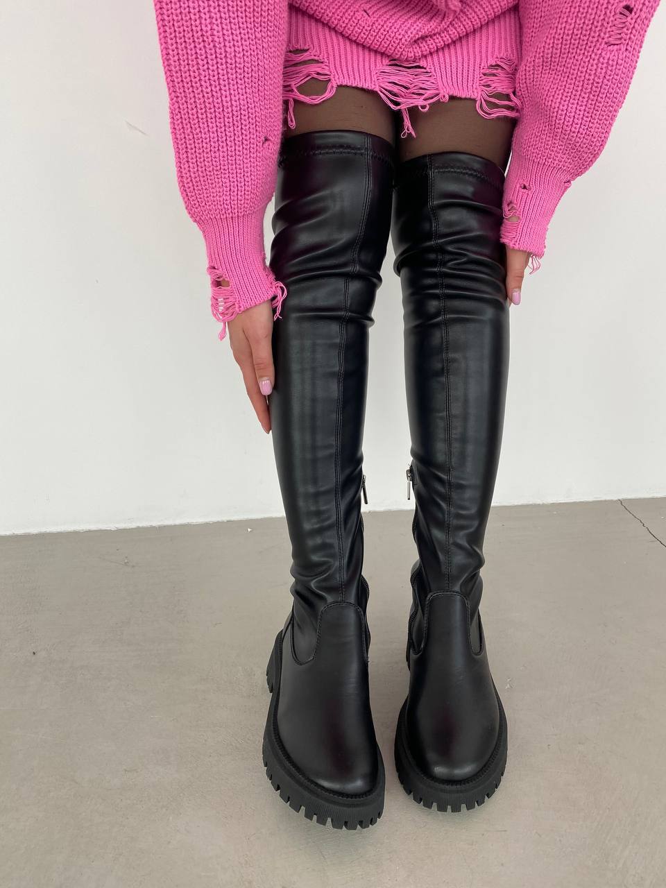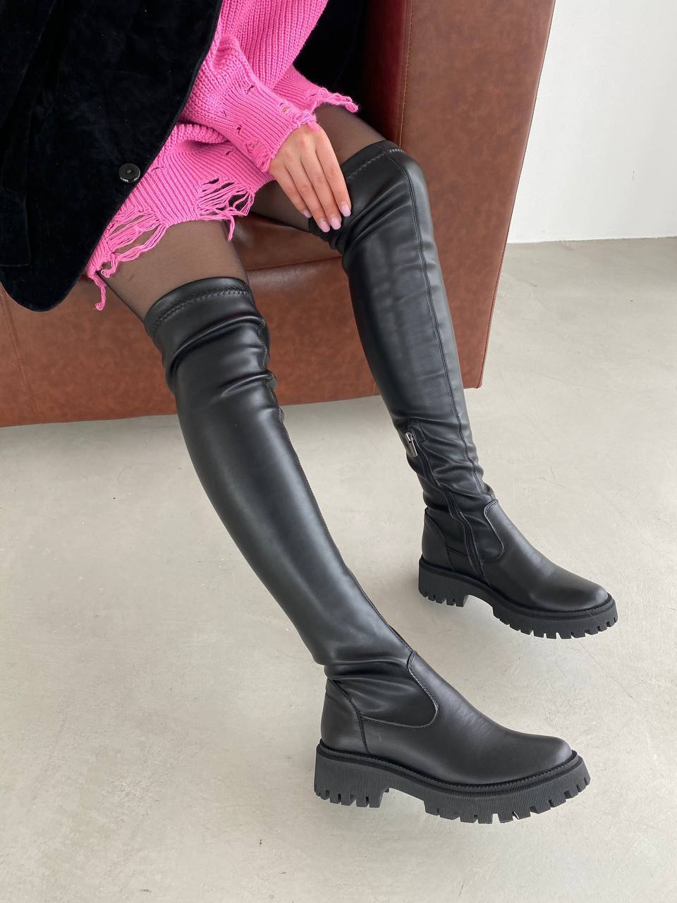 Женские Демисезонные Черные Сапоги Ботфорты – Высокие из Натурально Кожи с Байкой
