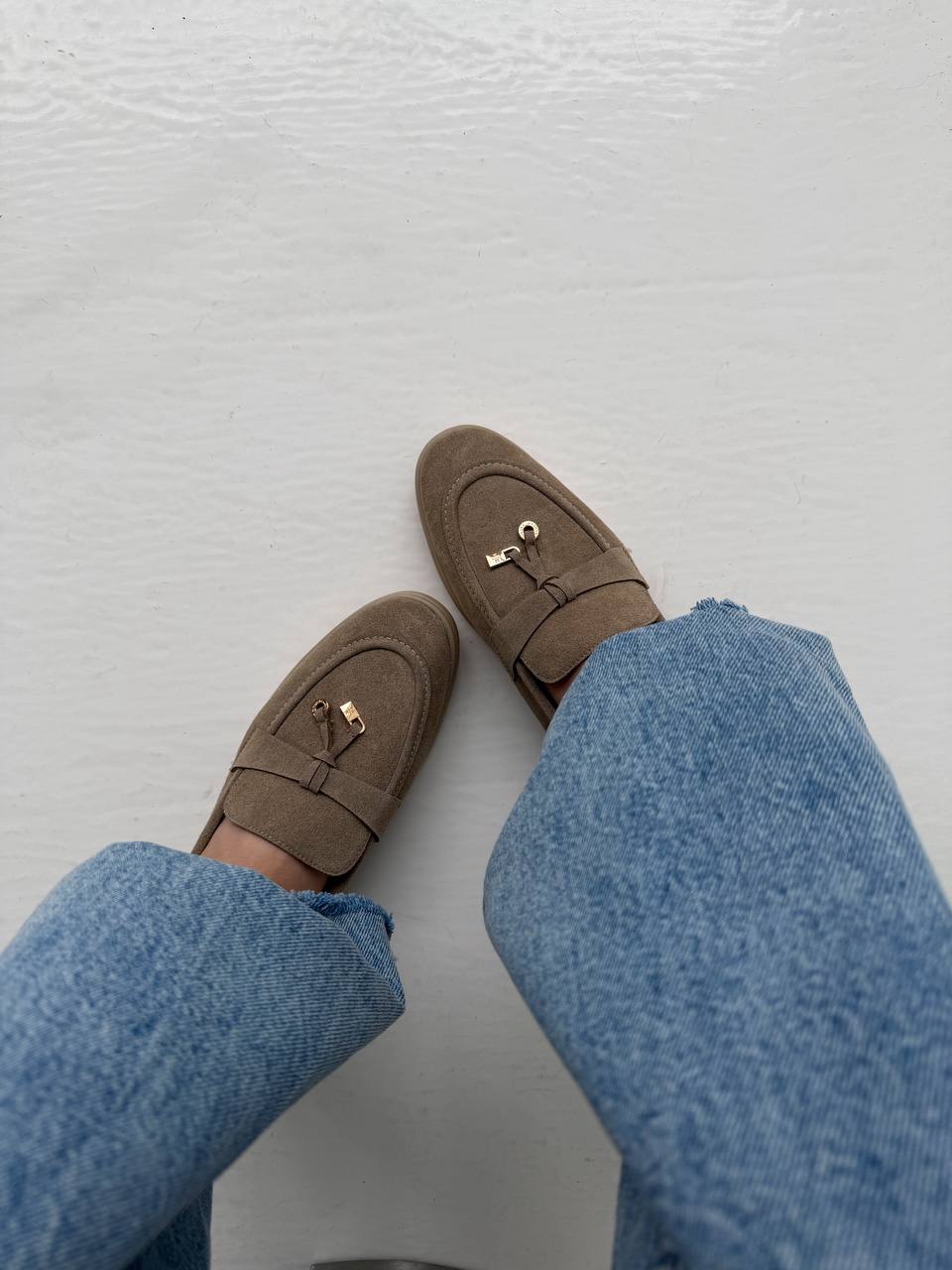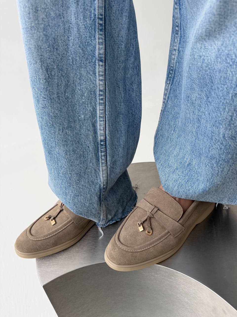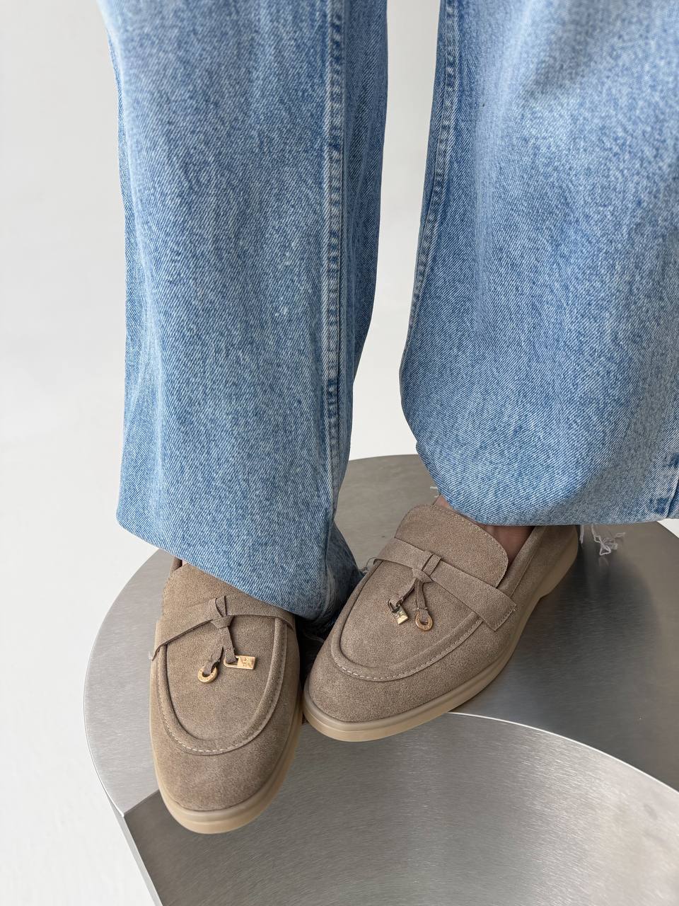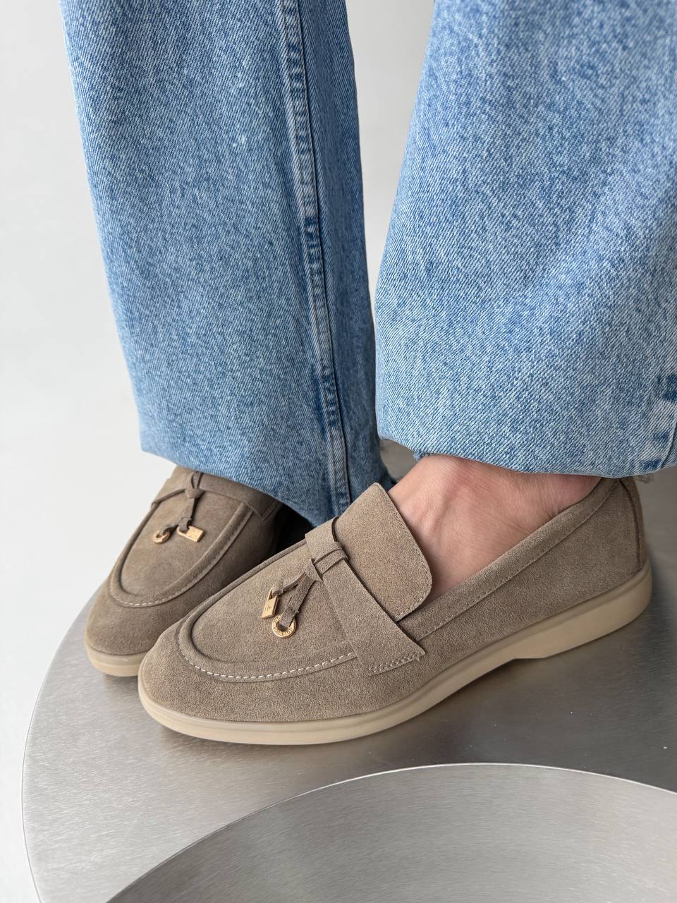 Женские Классические Замшевые Бежевые Туфли Лоферы с Декором