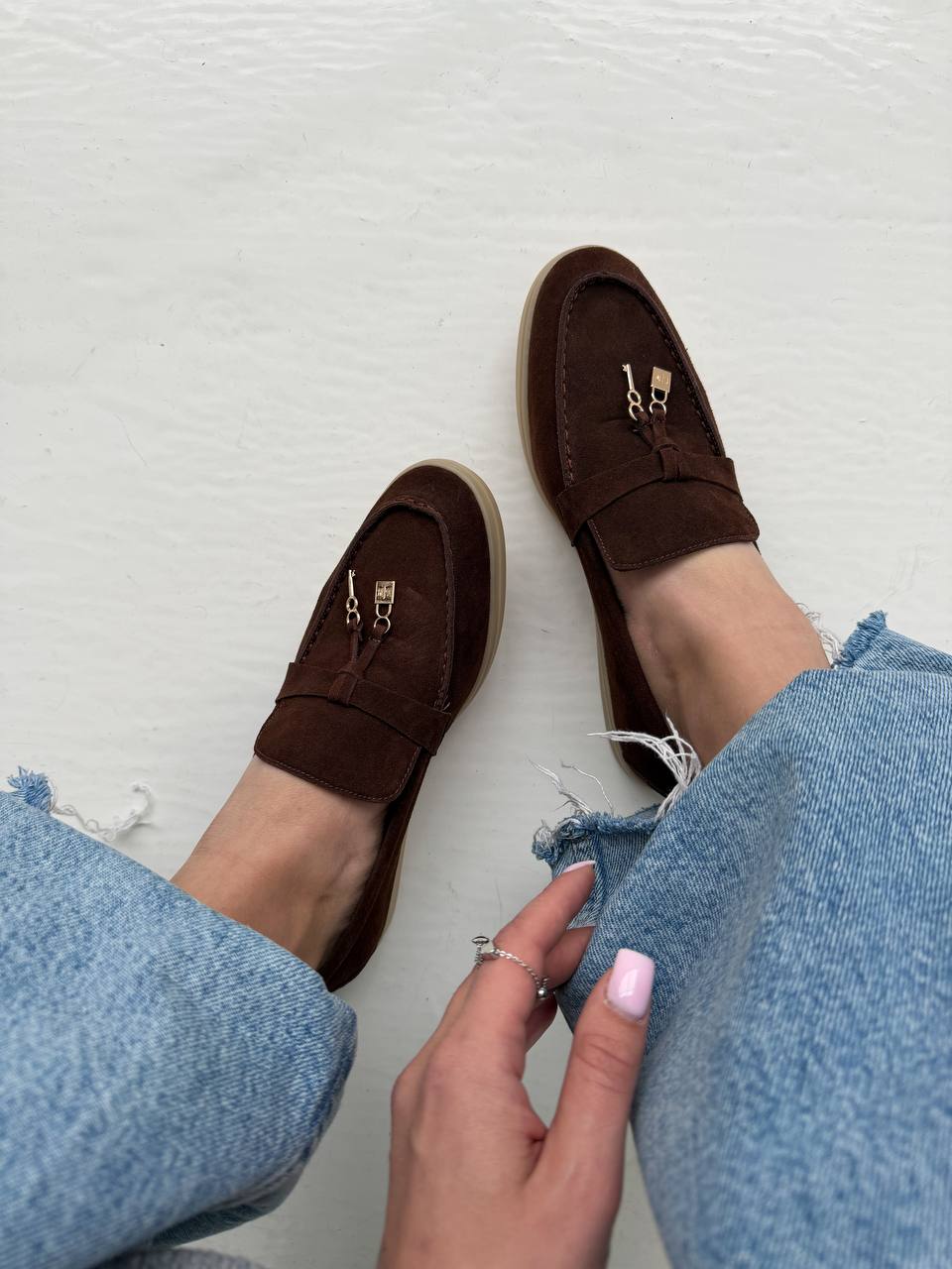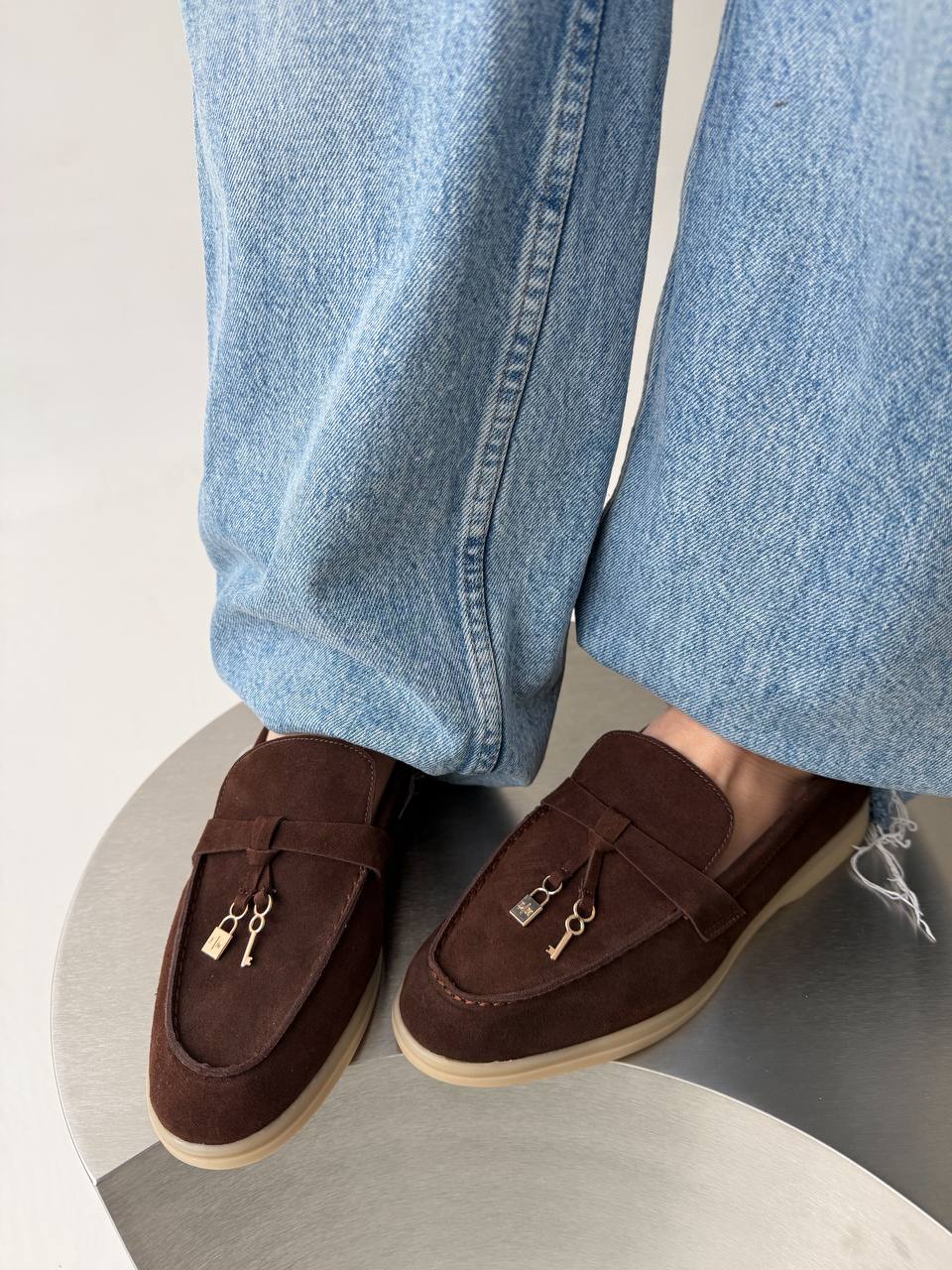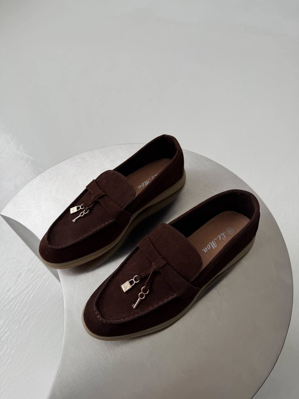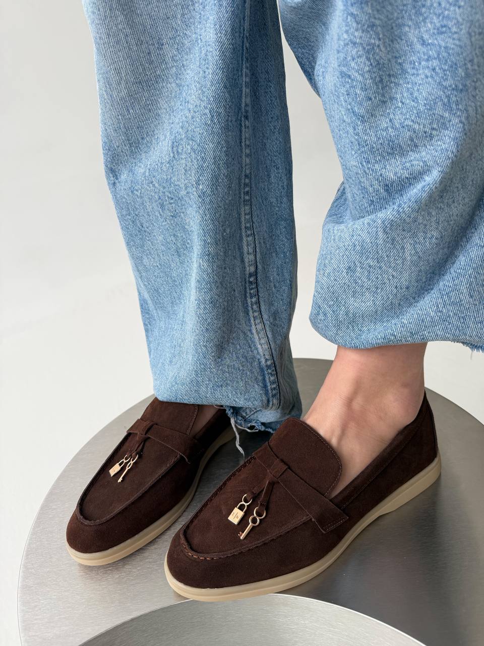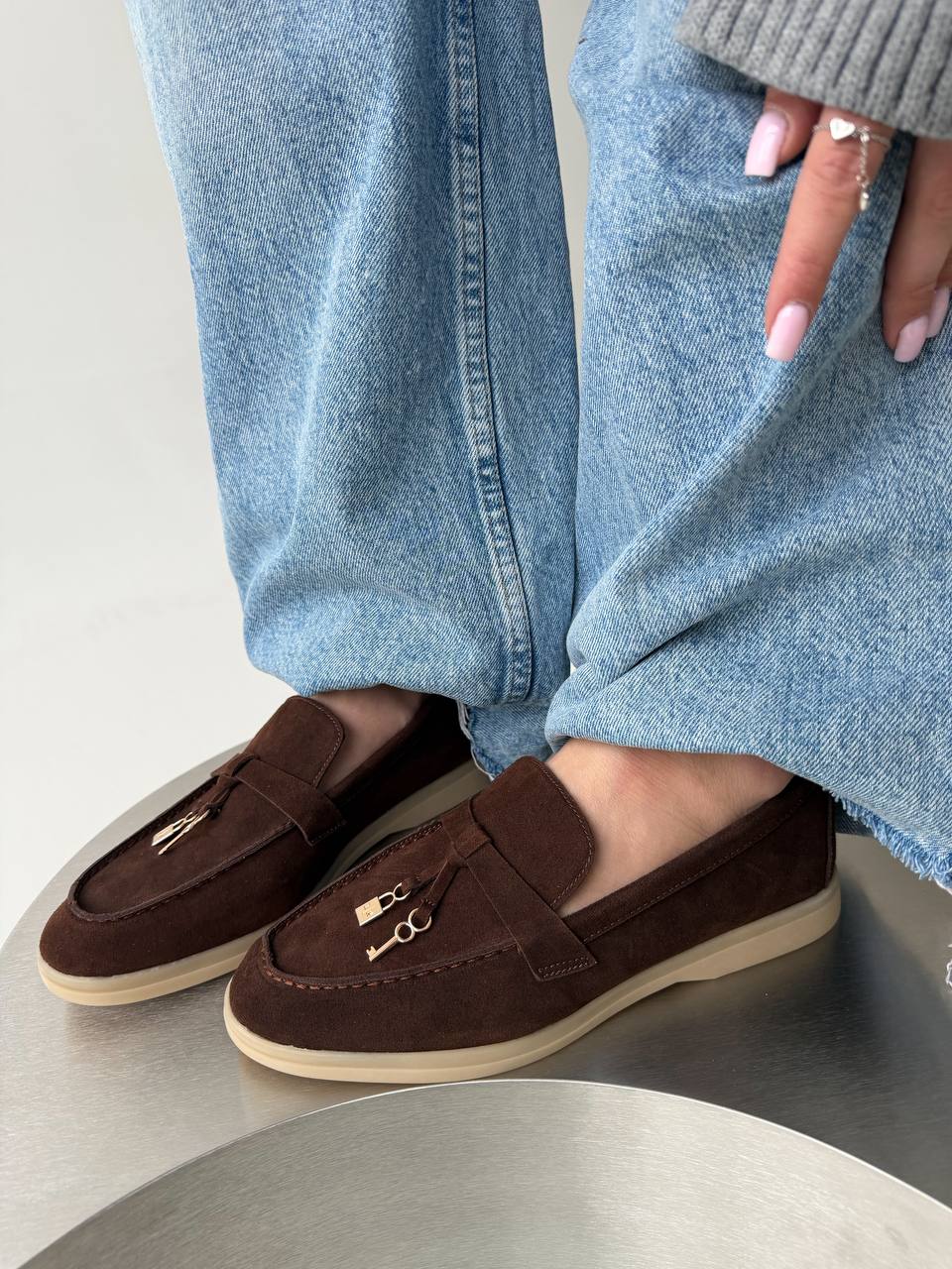 Женские Классические Замшевые Коричневые Туфли Лоферы с Декором