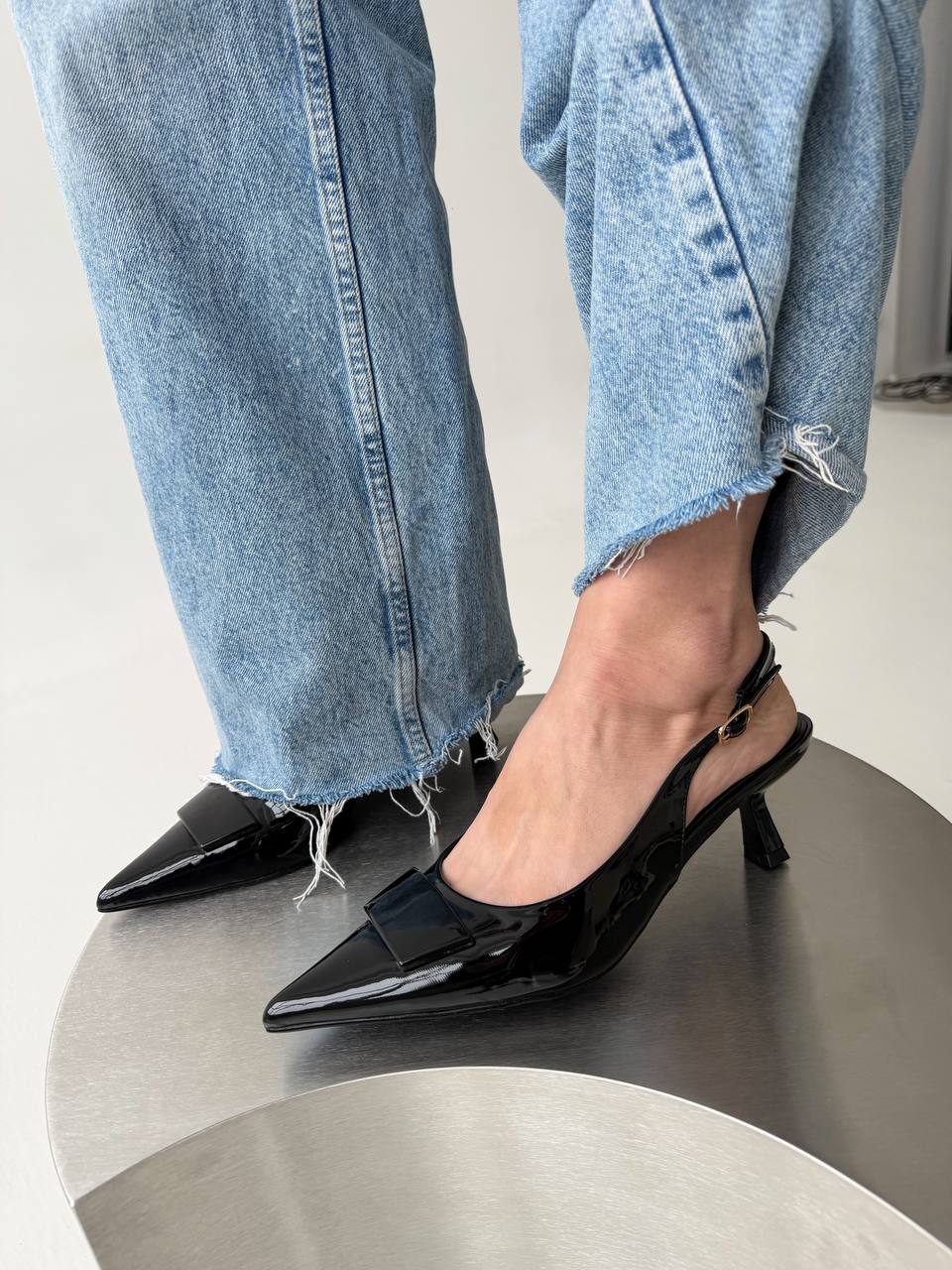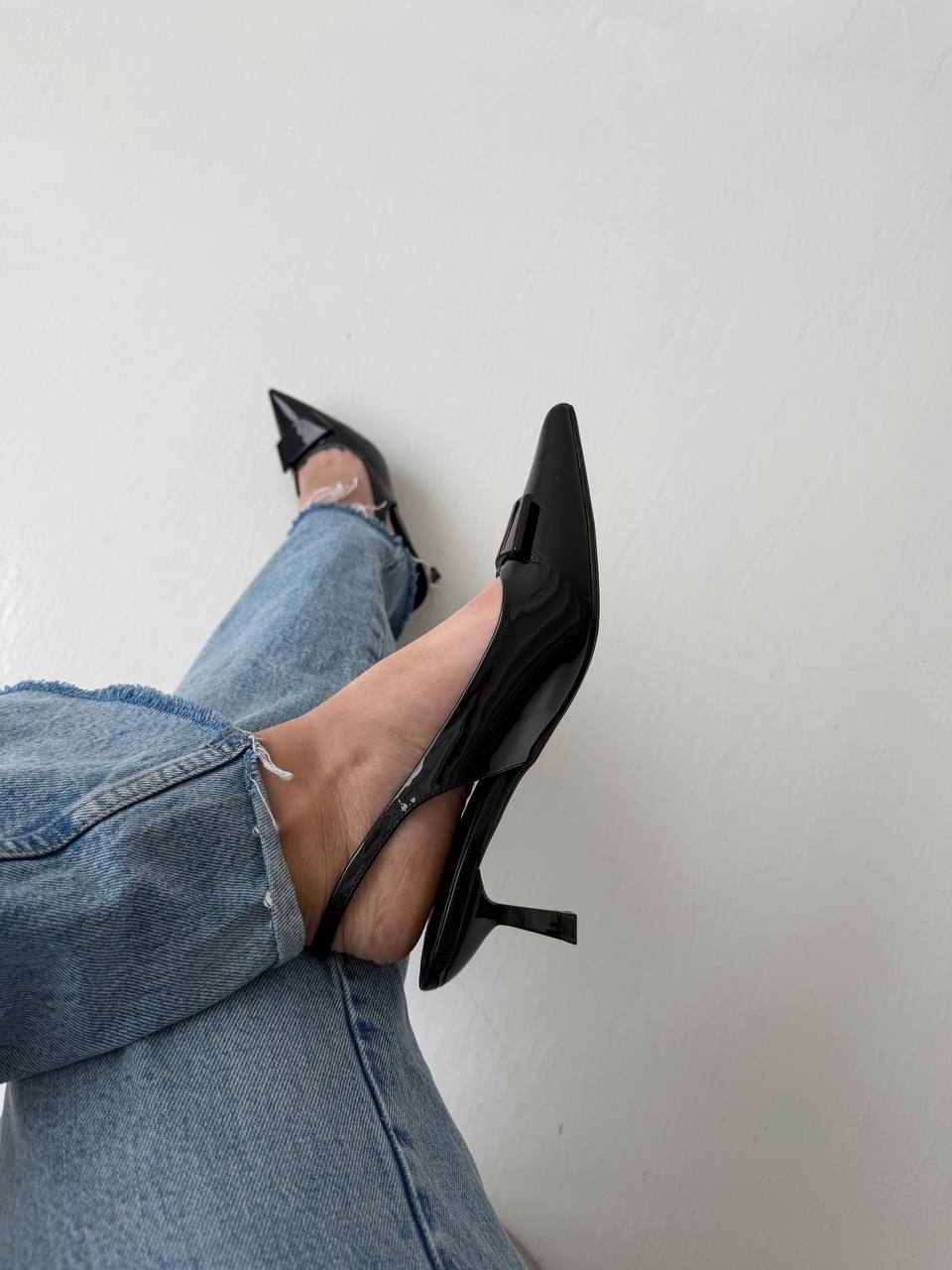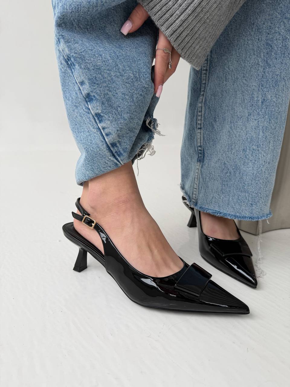 Женские Лаковые Черные Туфли Слингбэки на Маленьком Каблуке с Острым Носом и Открытой Пяткой