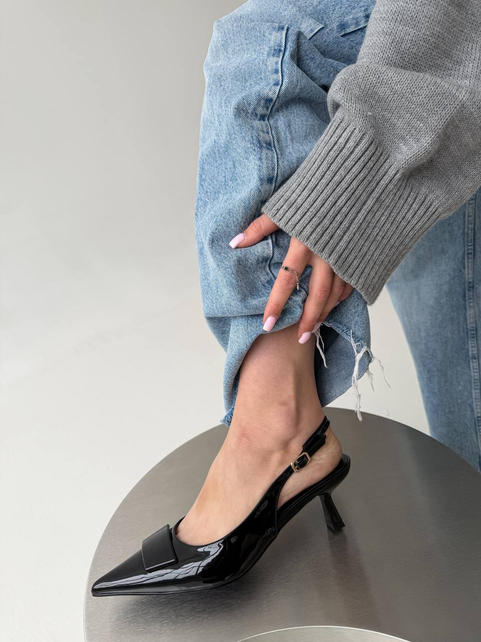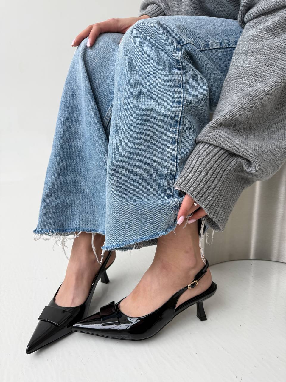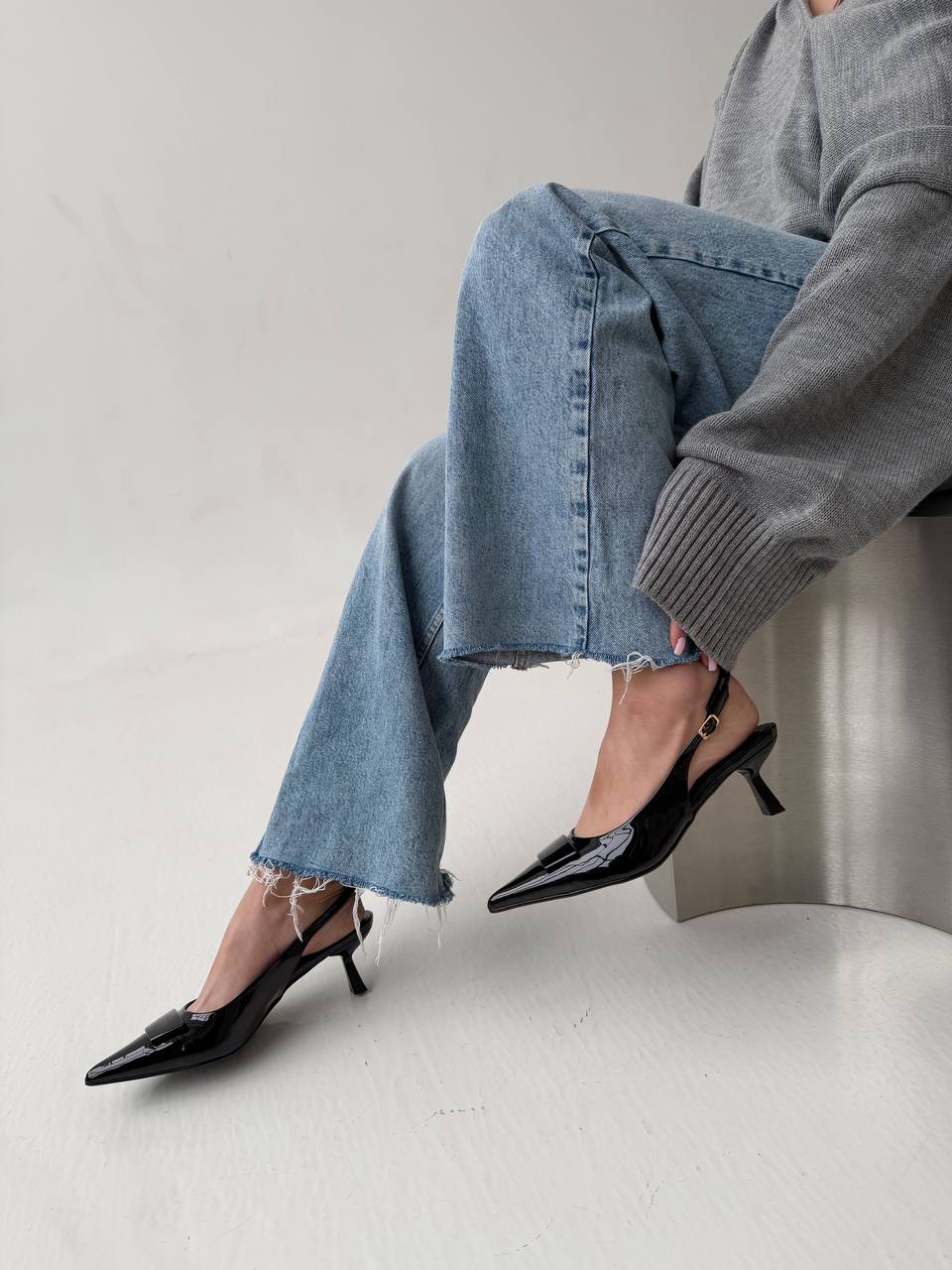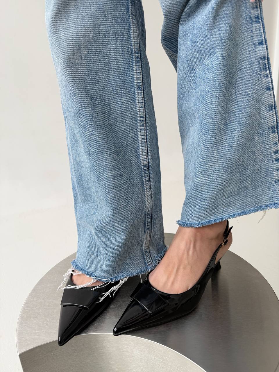 Женские Лаковые Черные Туфли Слингбэки на Маленьком Каблуке с Острым Носом и Открытой Пяткой