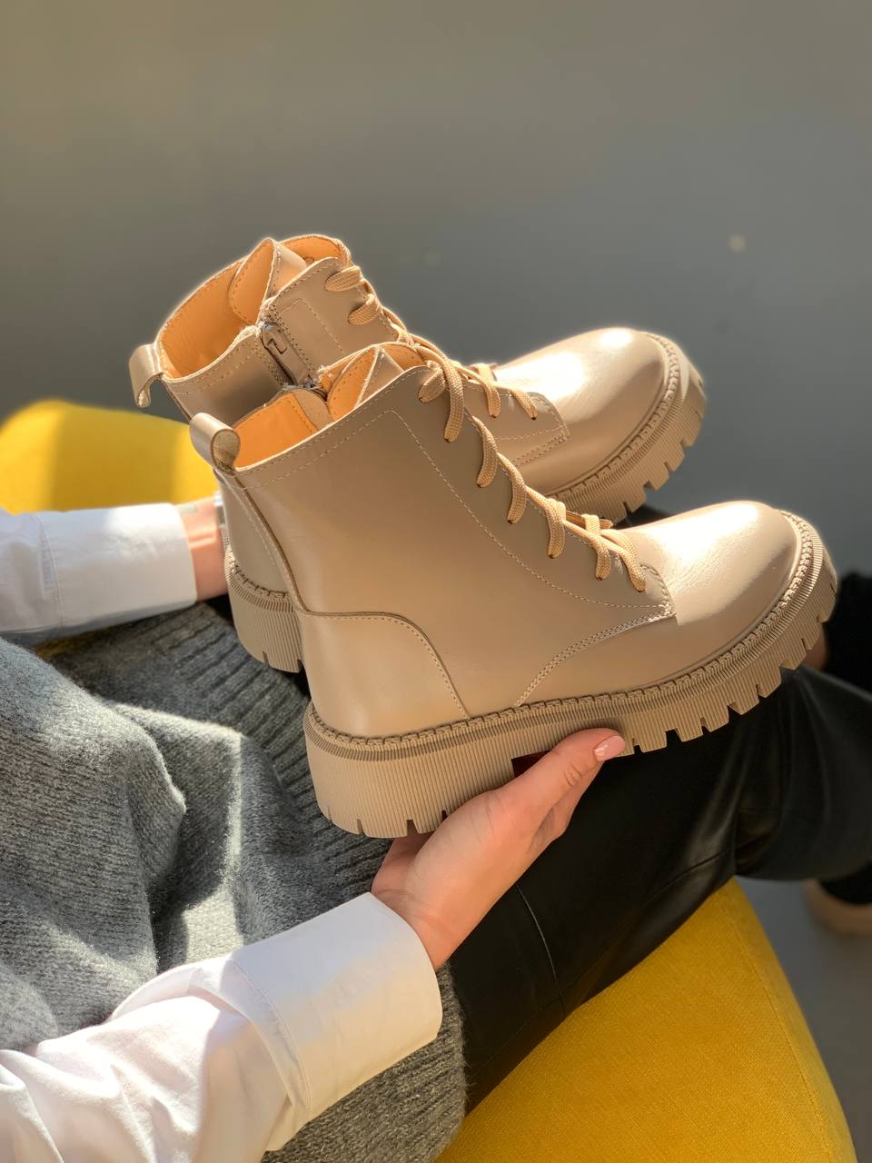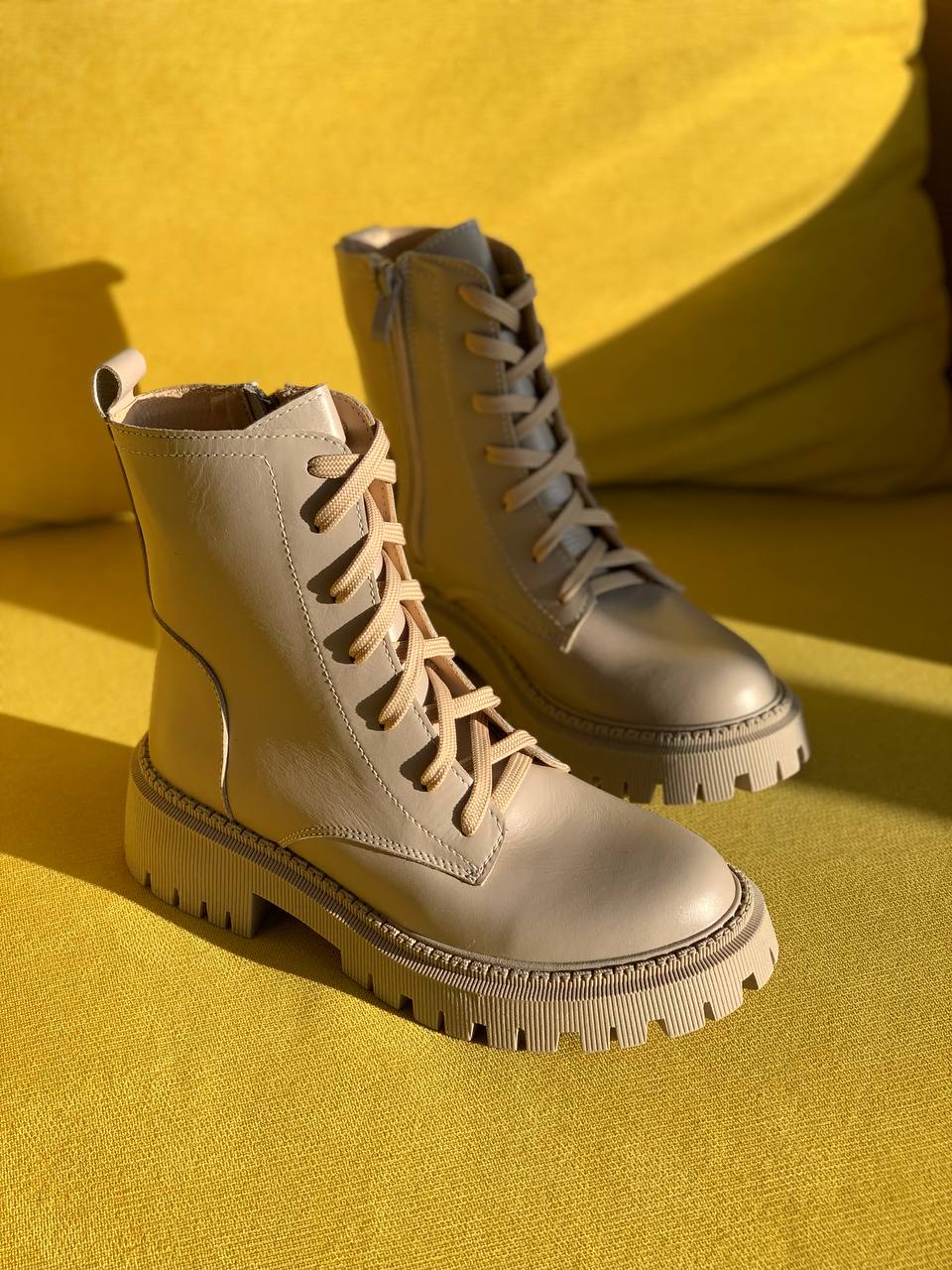 Женские Зимние Ботинки Беживые – Высокие из Натуральной Кожи с Мехом