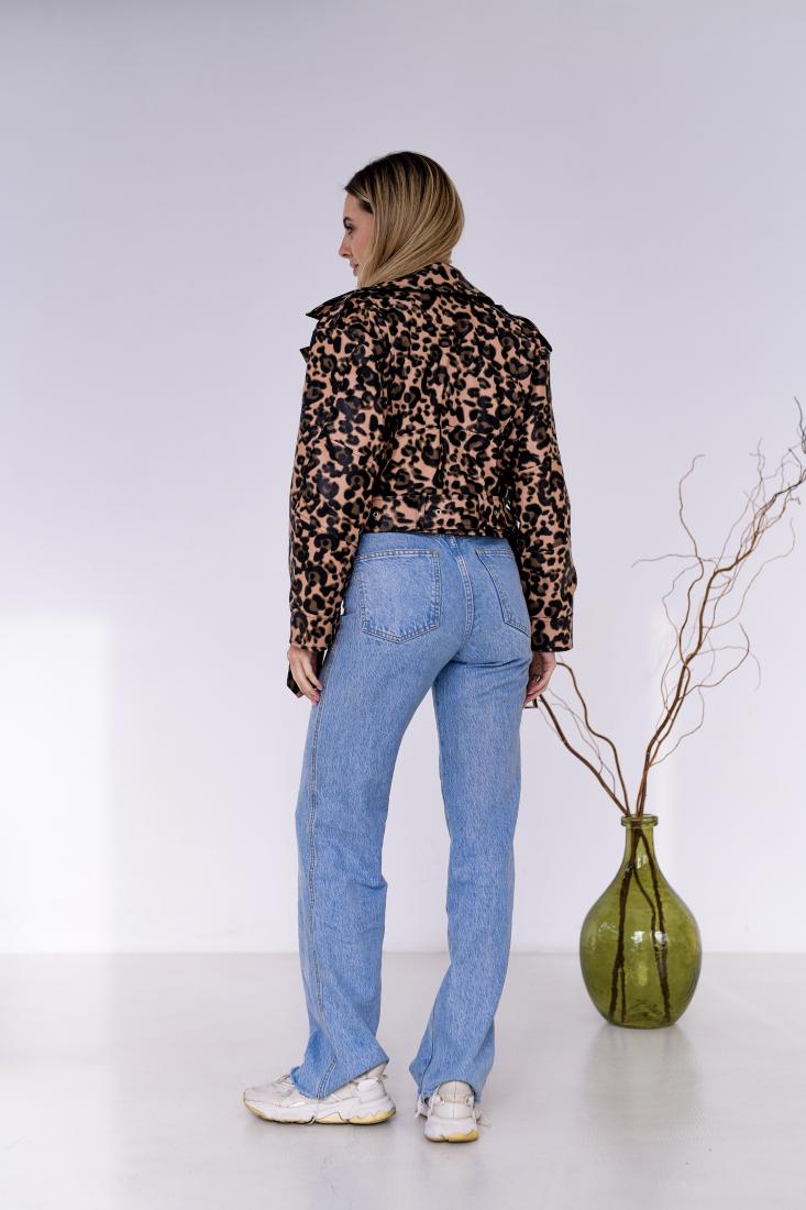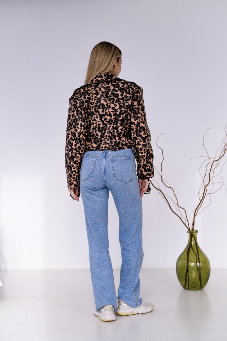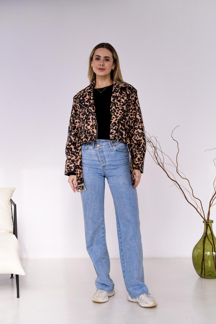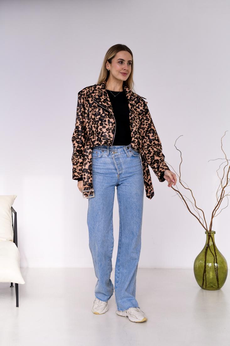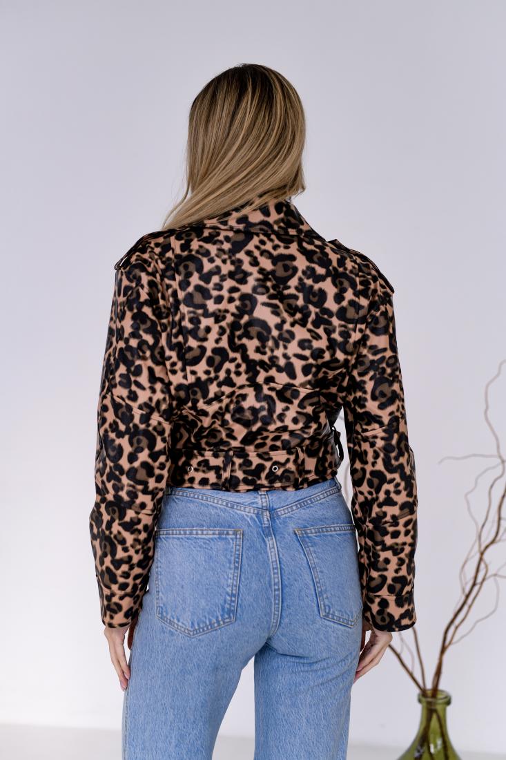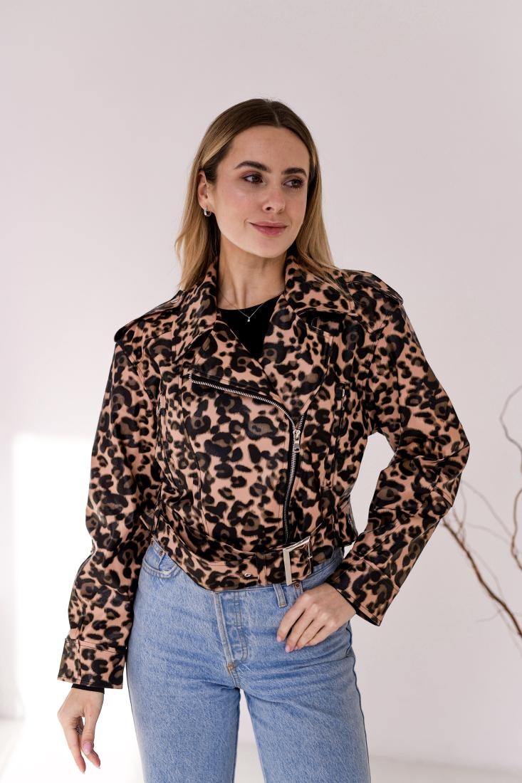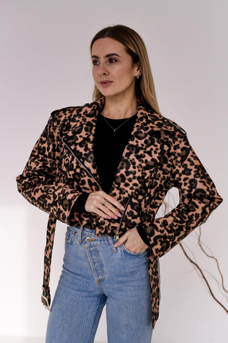 Женская Бежевая Кожаная Куртка Косуха в Леопардовый Принт – Короткая с Ремешком
