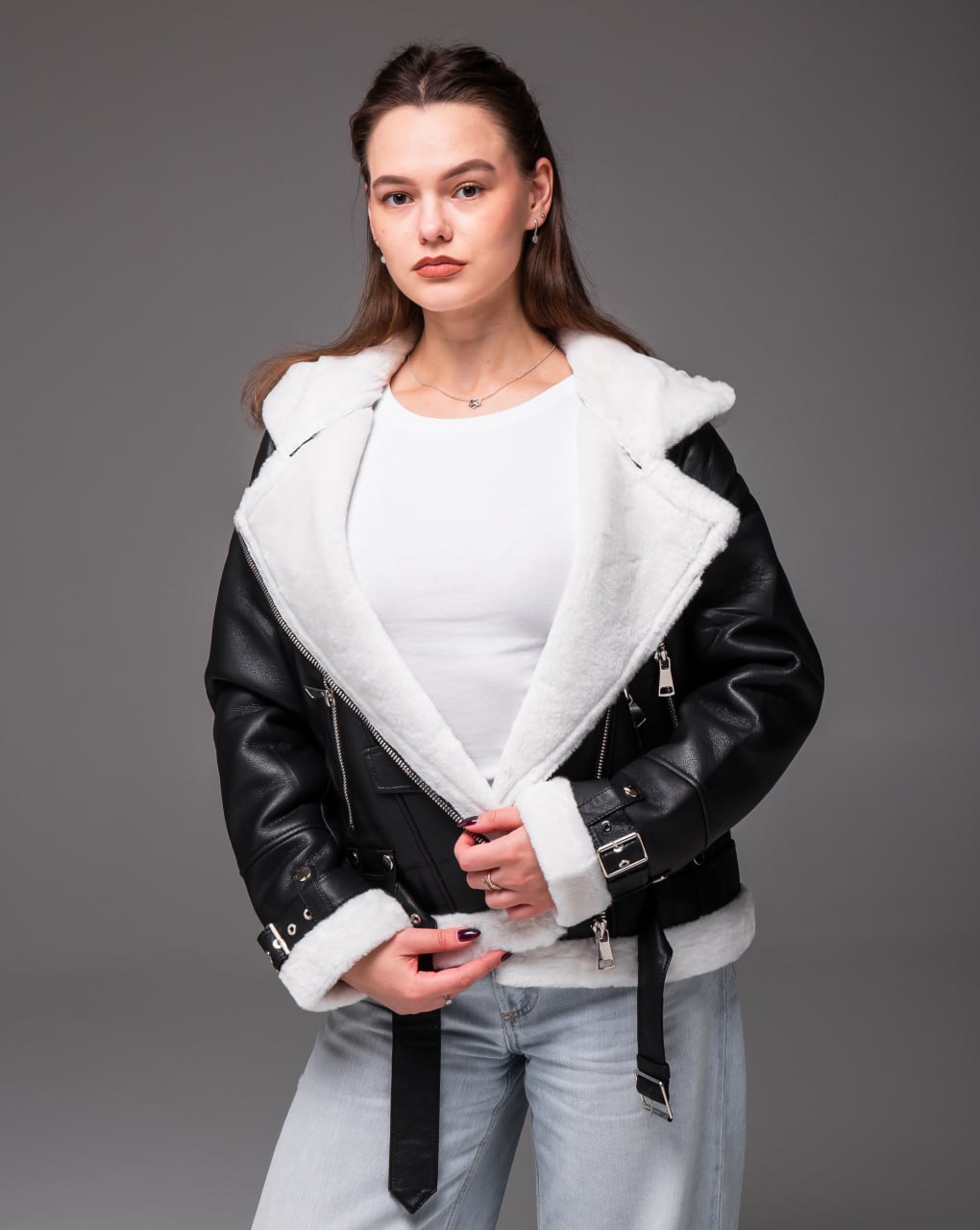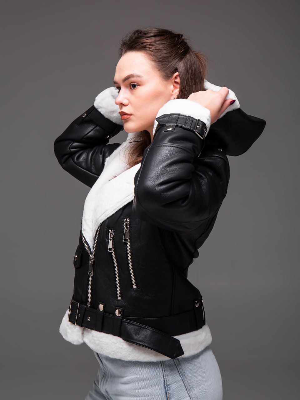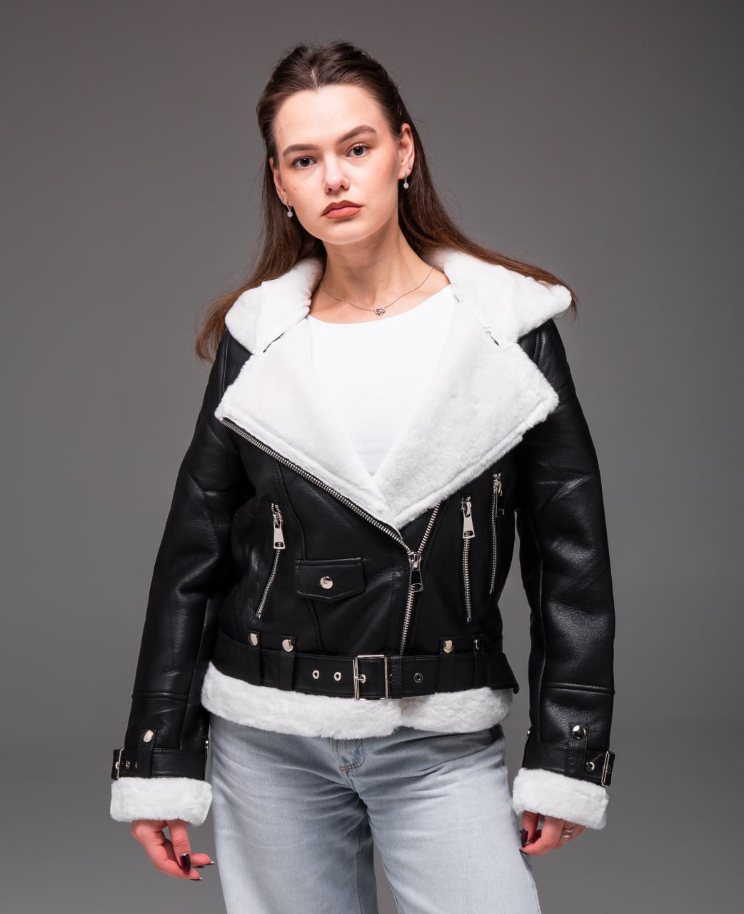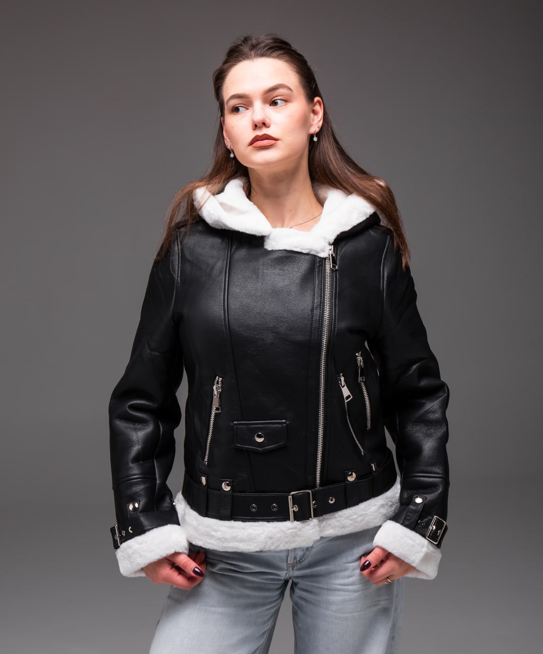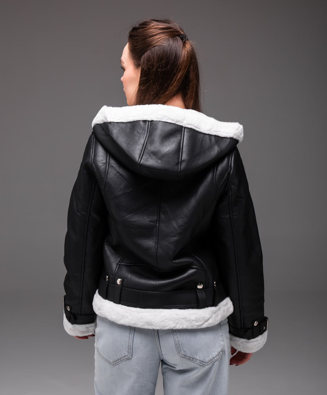 Женская Черная Кожаная Дубленка на Молнии с Капюшоном и Белым Мехом