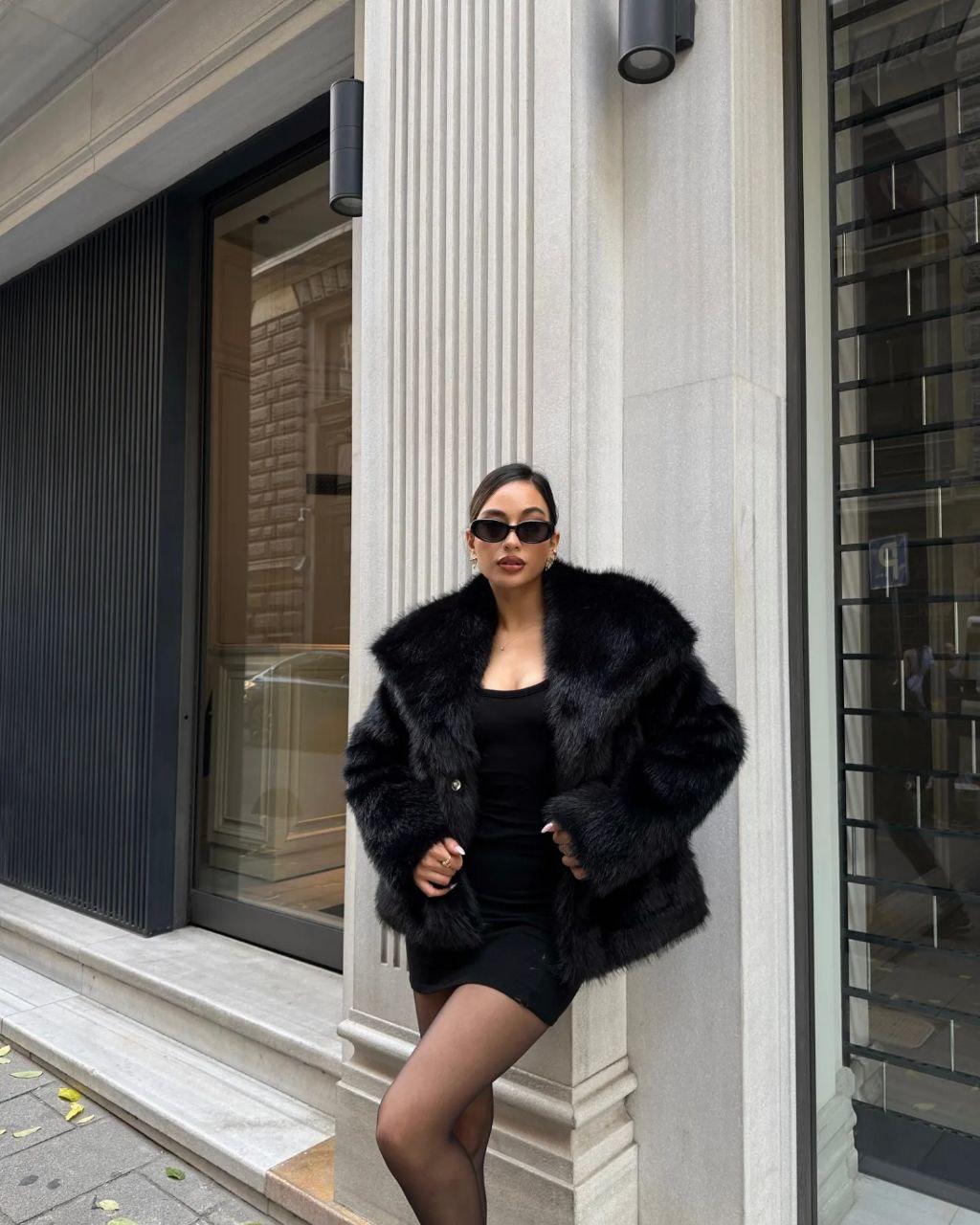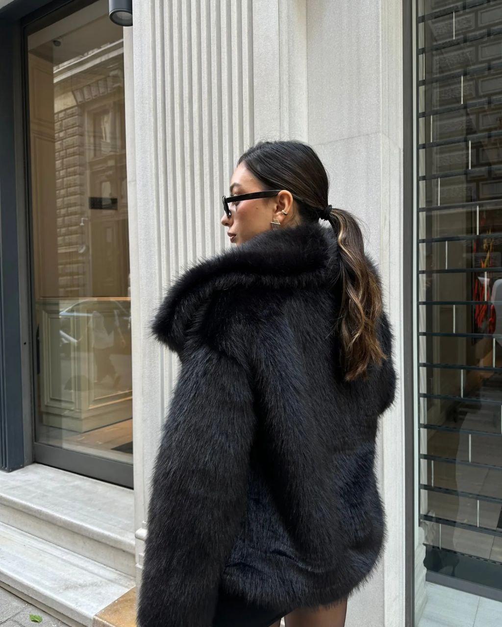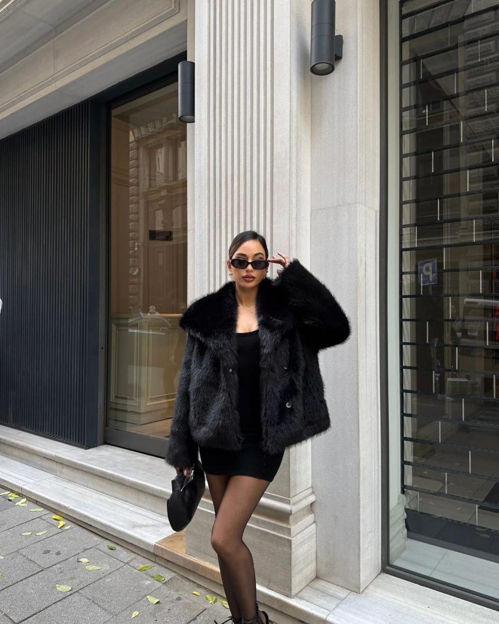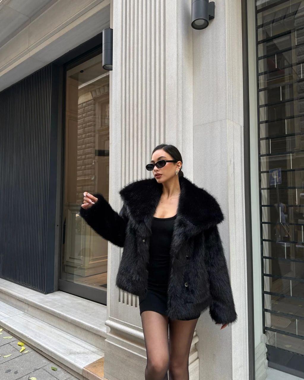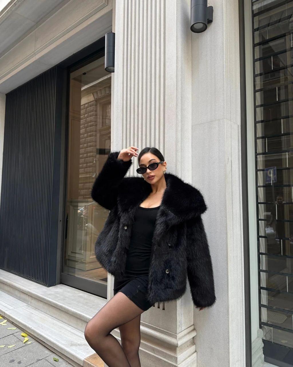 Женская Черная Шуба на Кнопках с Объемным Воротником