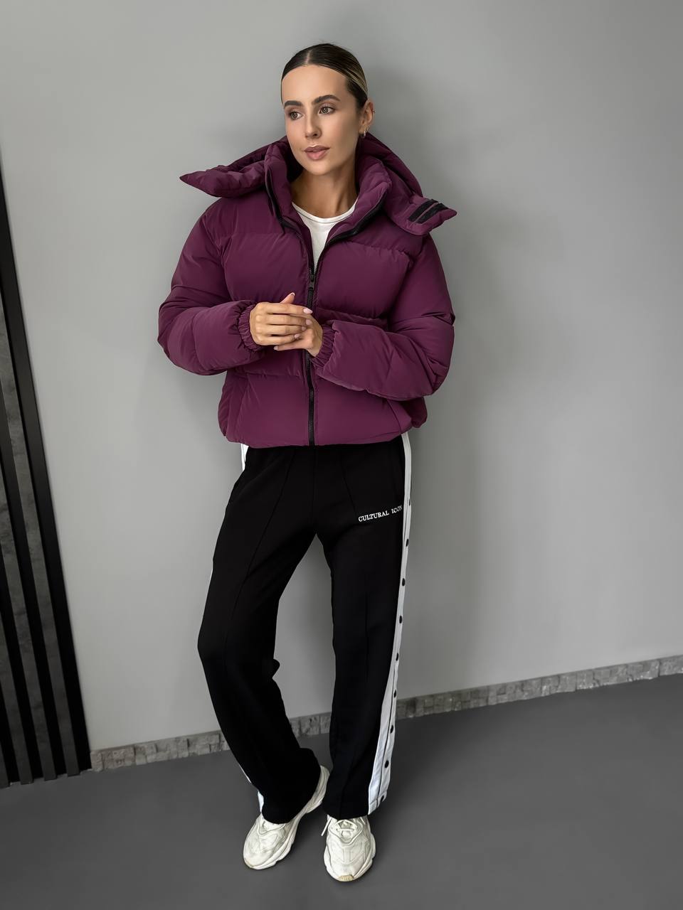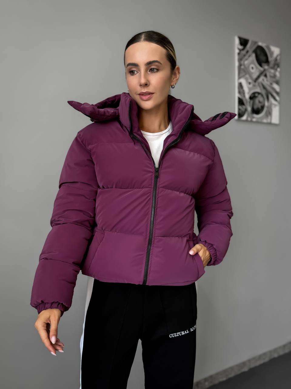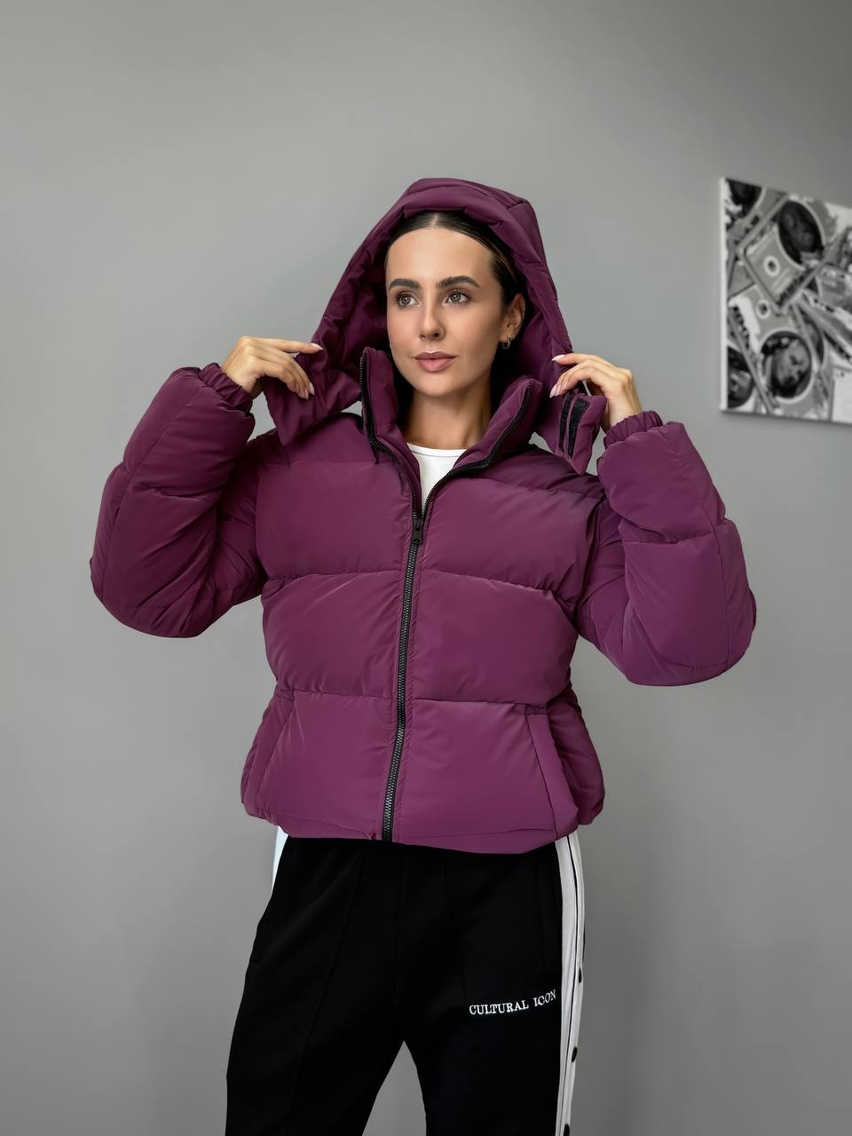 Женская Демисезонная Бархатная Фиолетовая Куртка под Горло с Капюшоном – Стеганая Дутая с Манжетами
