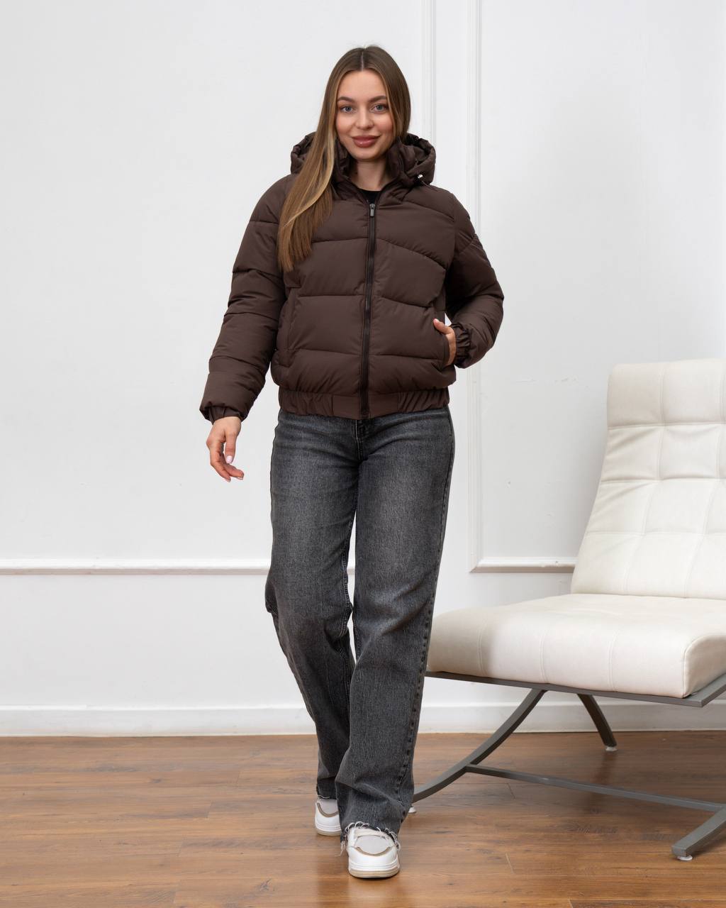 Женская Демисезонная Коричневая Куртка с Резинкой Внизу и на Маежетах