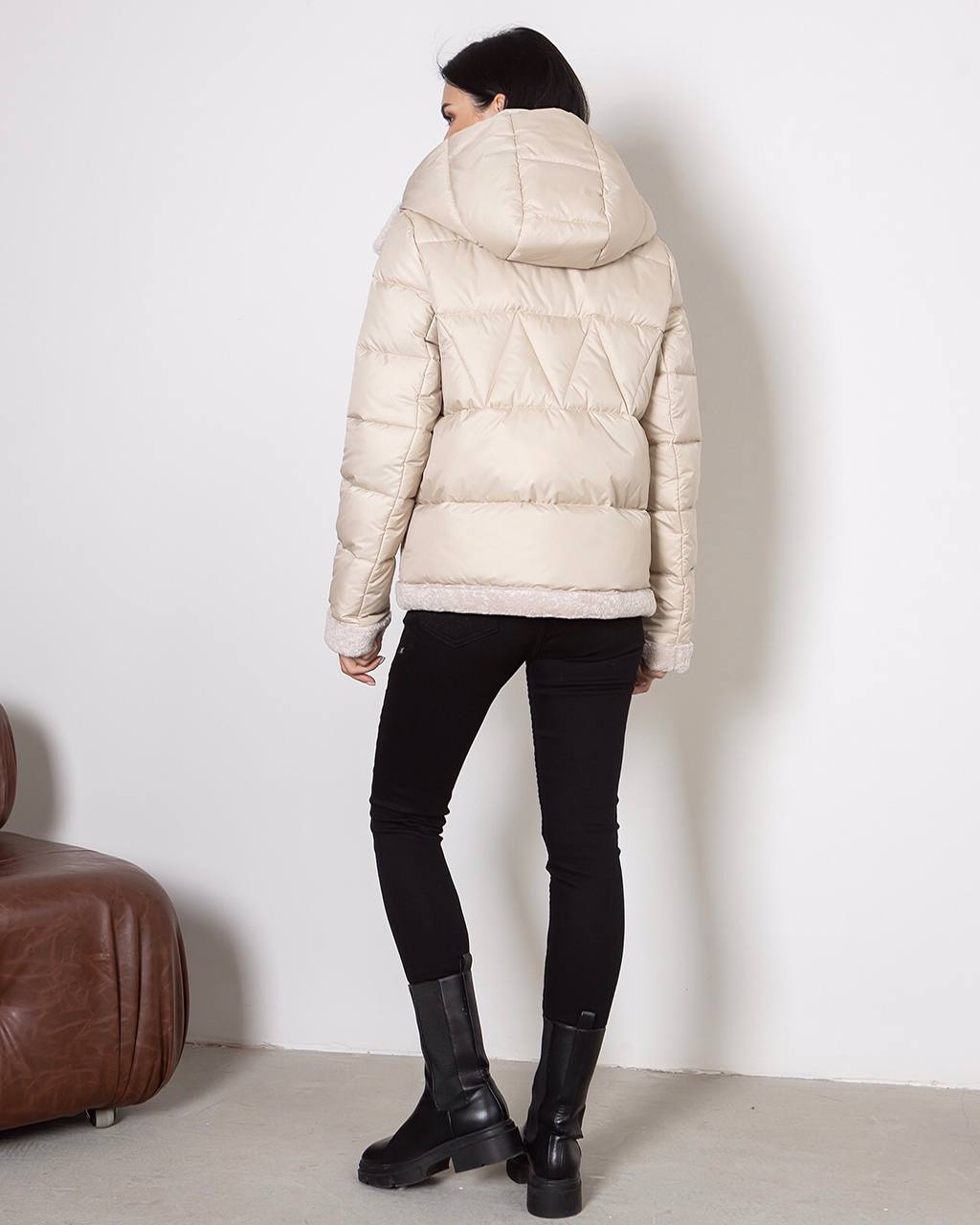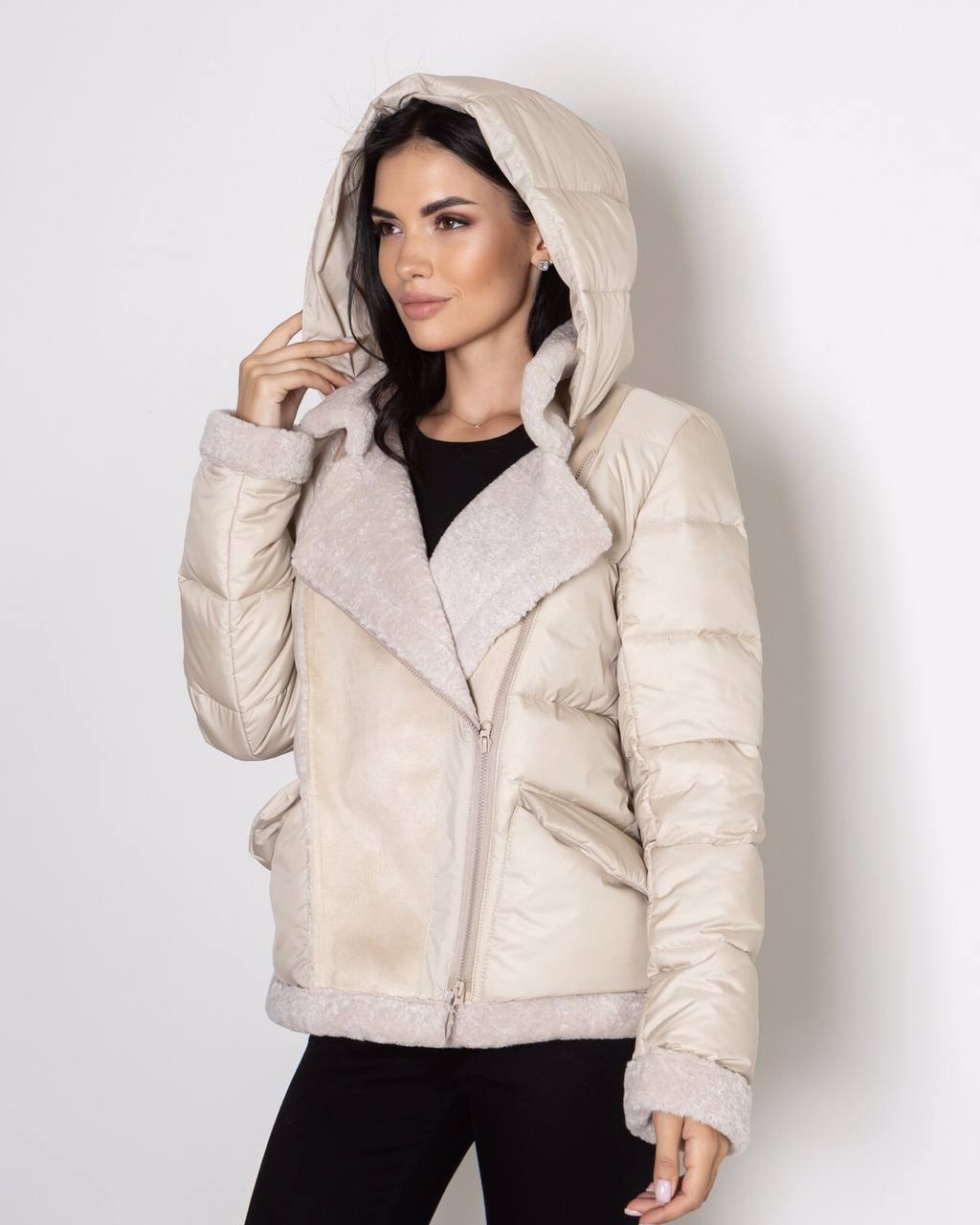 Женская Комбинированная Куртка-Дубленка Айвори с Капюшоном и Молнией Сбоку Наискосок