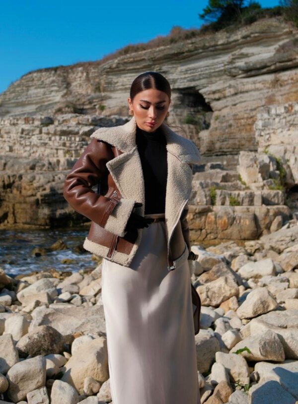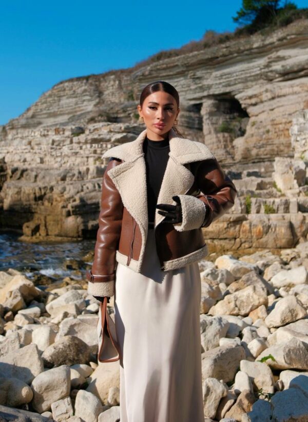 Женская Коричневая Дубленка Авиатор с Ремешками на Рукавах (Бежевый Мех)