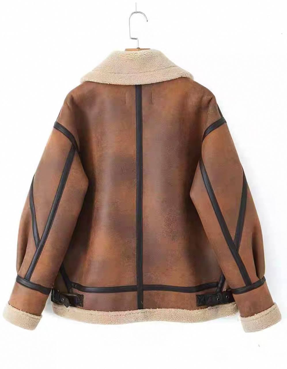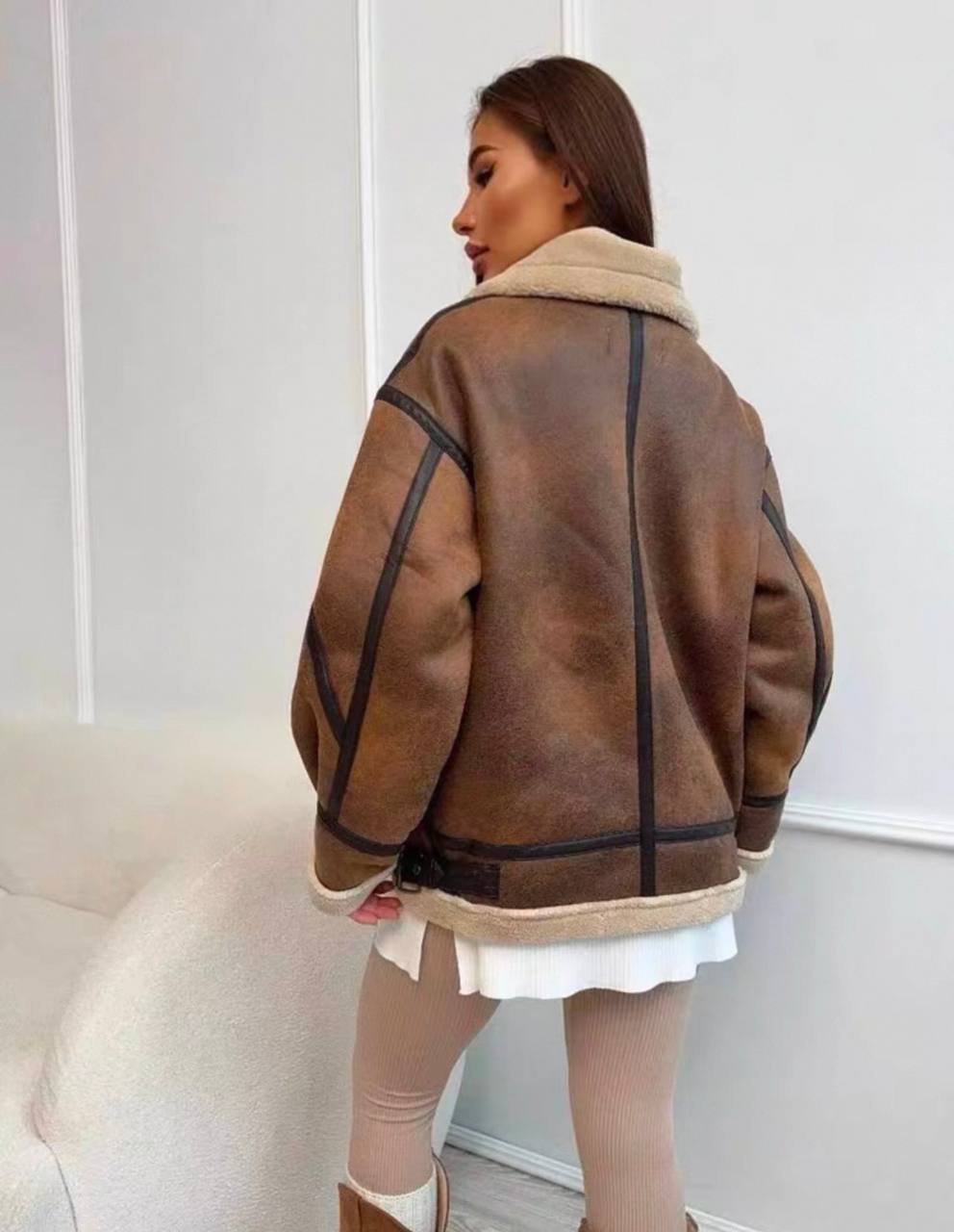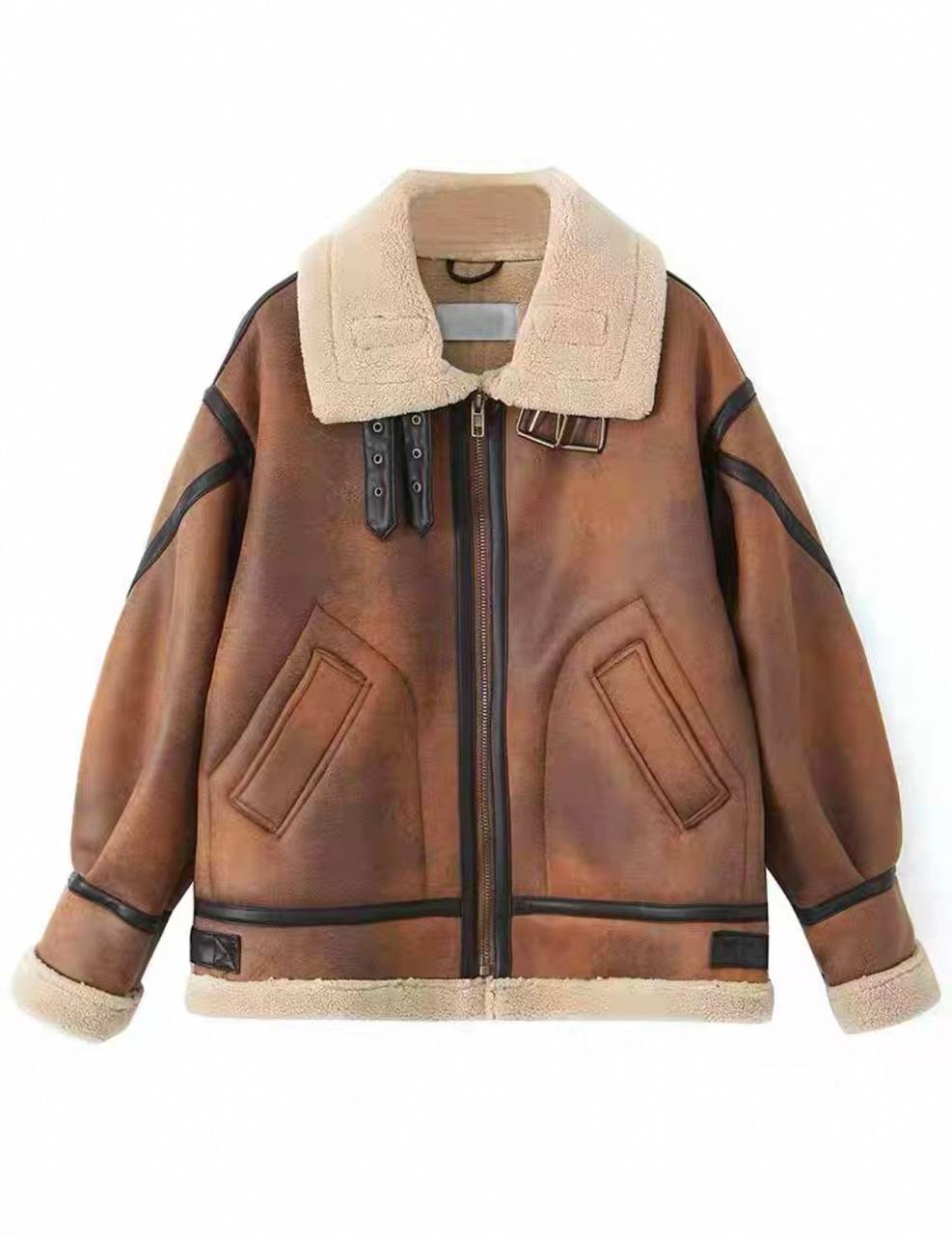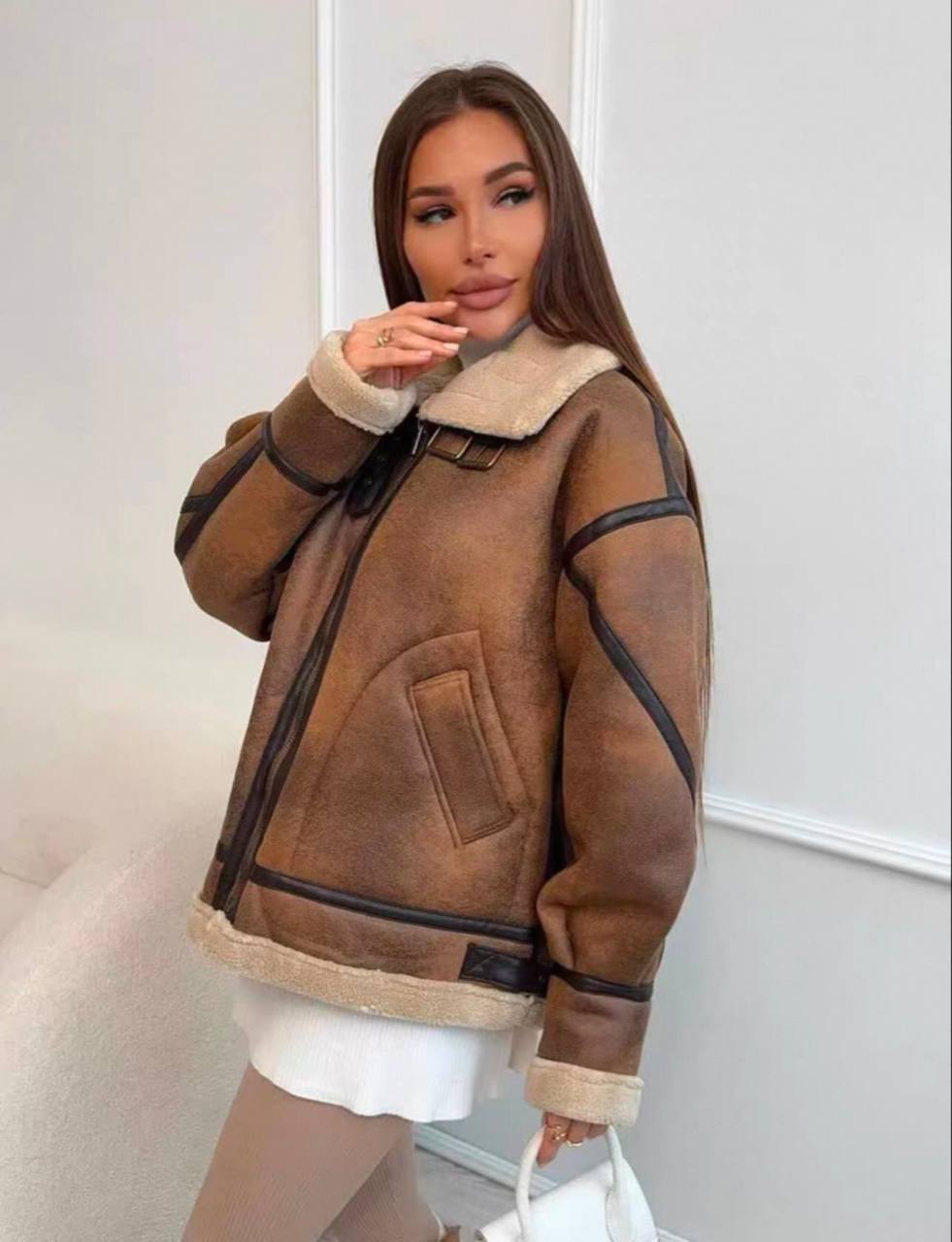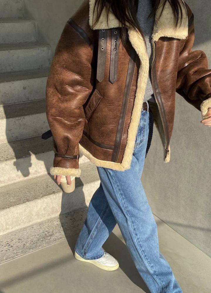 Женская Коричневая Дубленка Оверсайз на Молнии с Зястежками на Воротнике