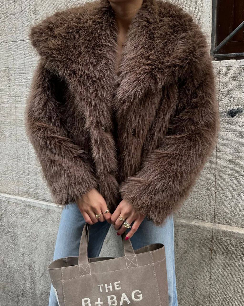 Женская Коричневая Шуба на Кнопках с Объемным Воротником