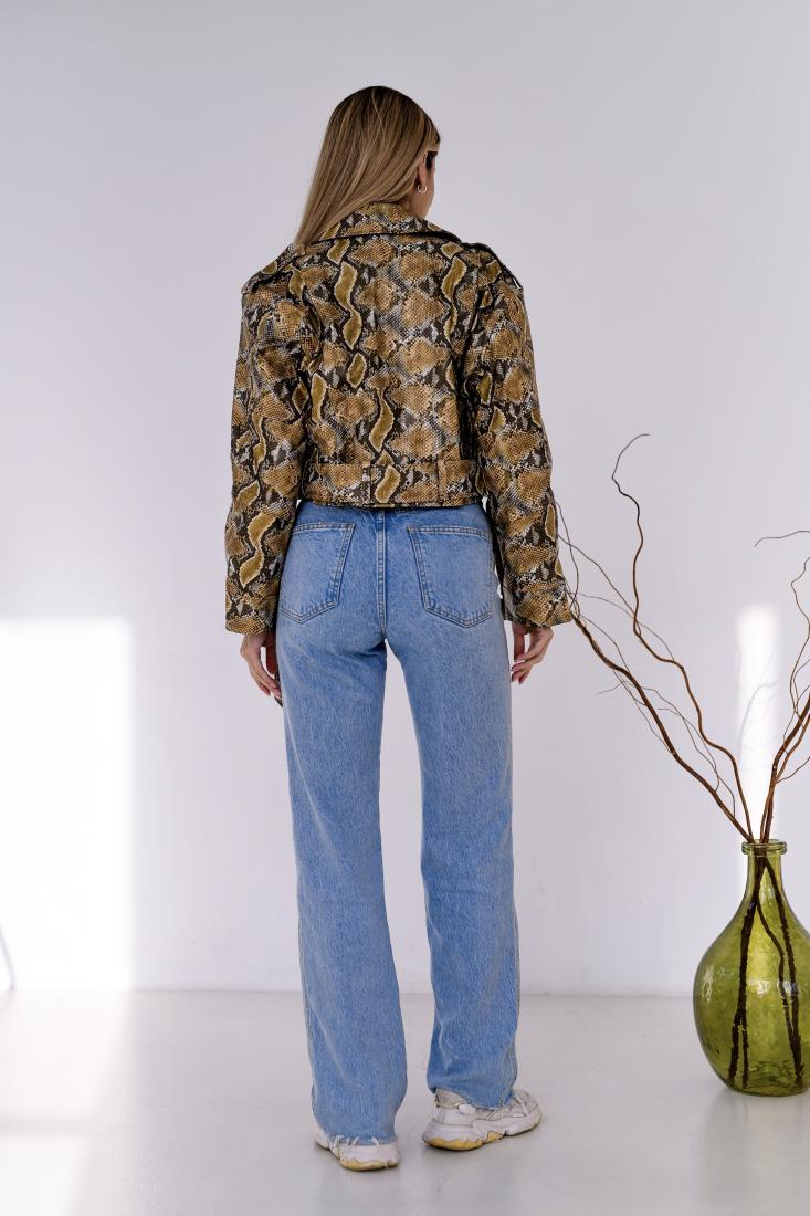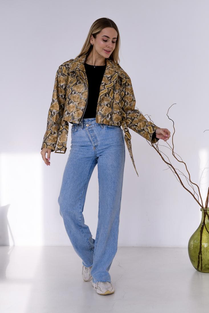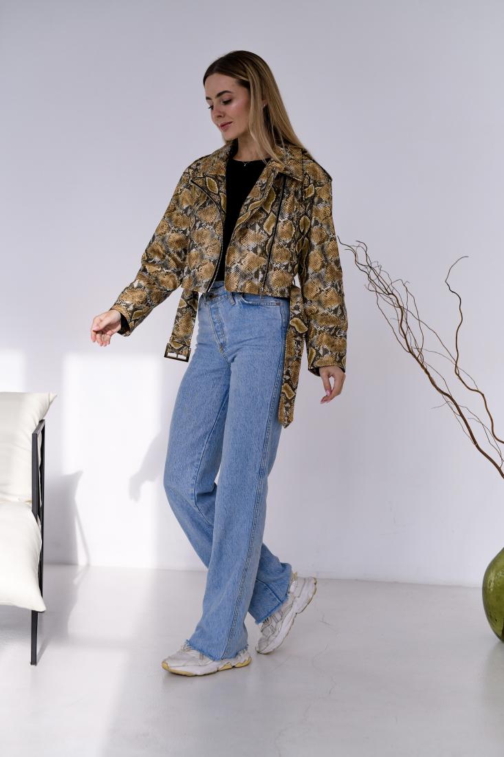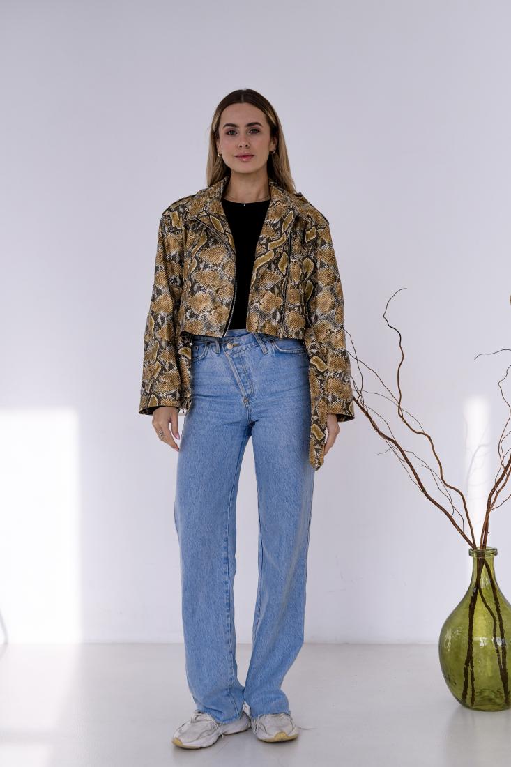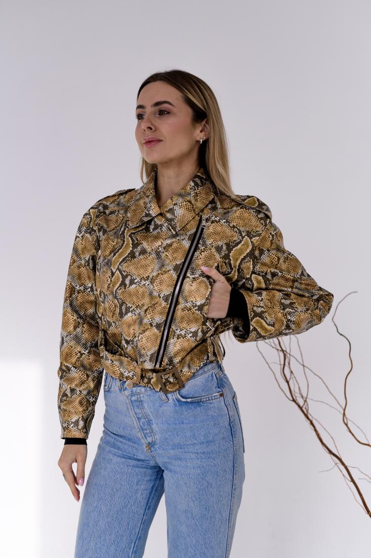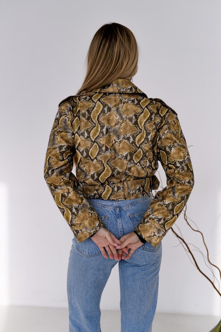 Женская Кожаная Куртка Косуха Хаки в Змеиный Принт – Короткая с Ремешком