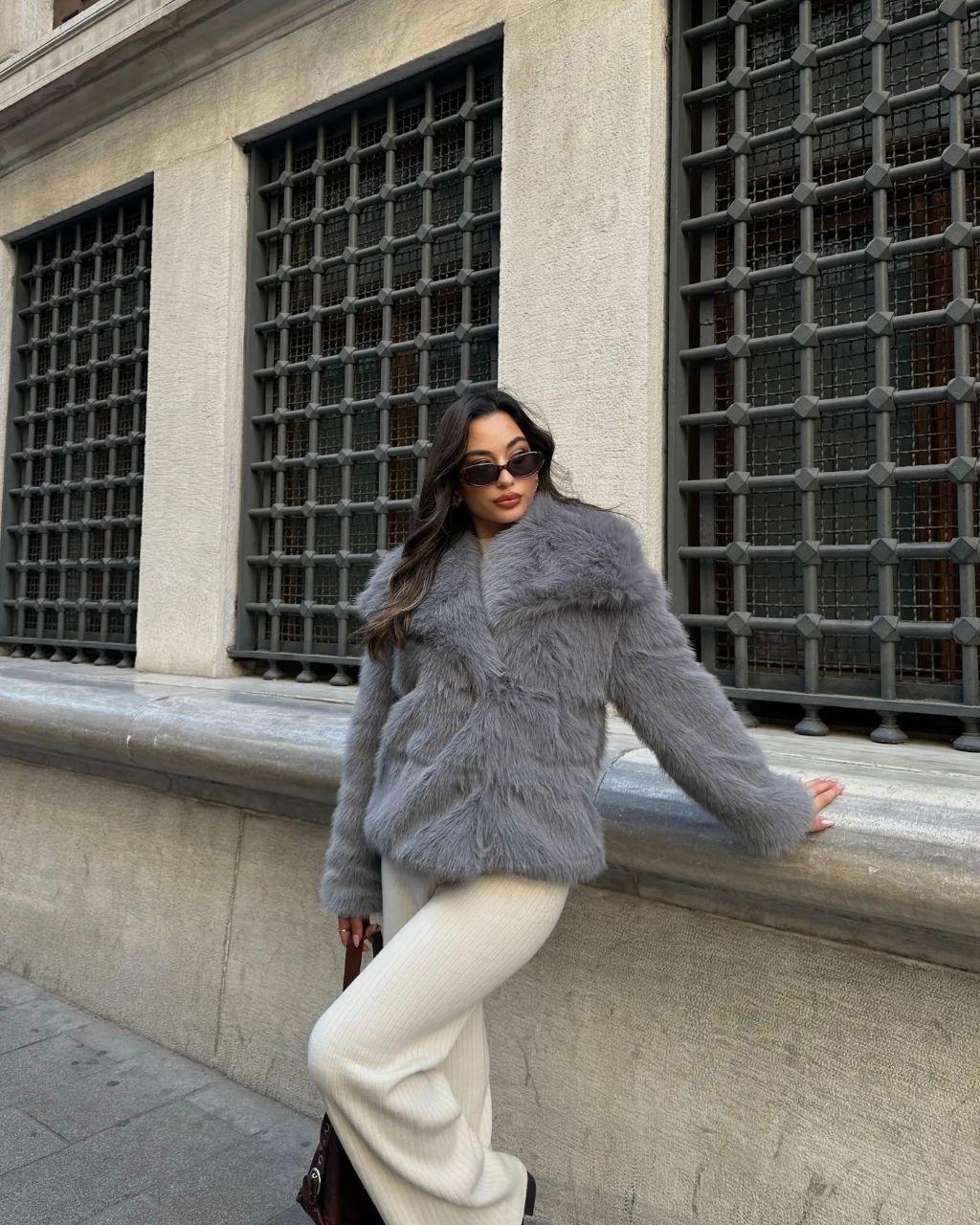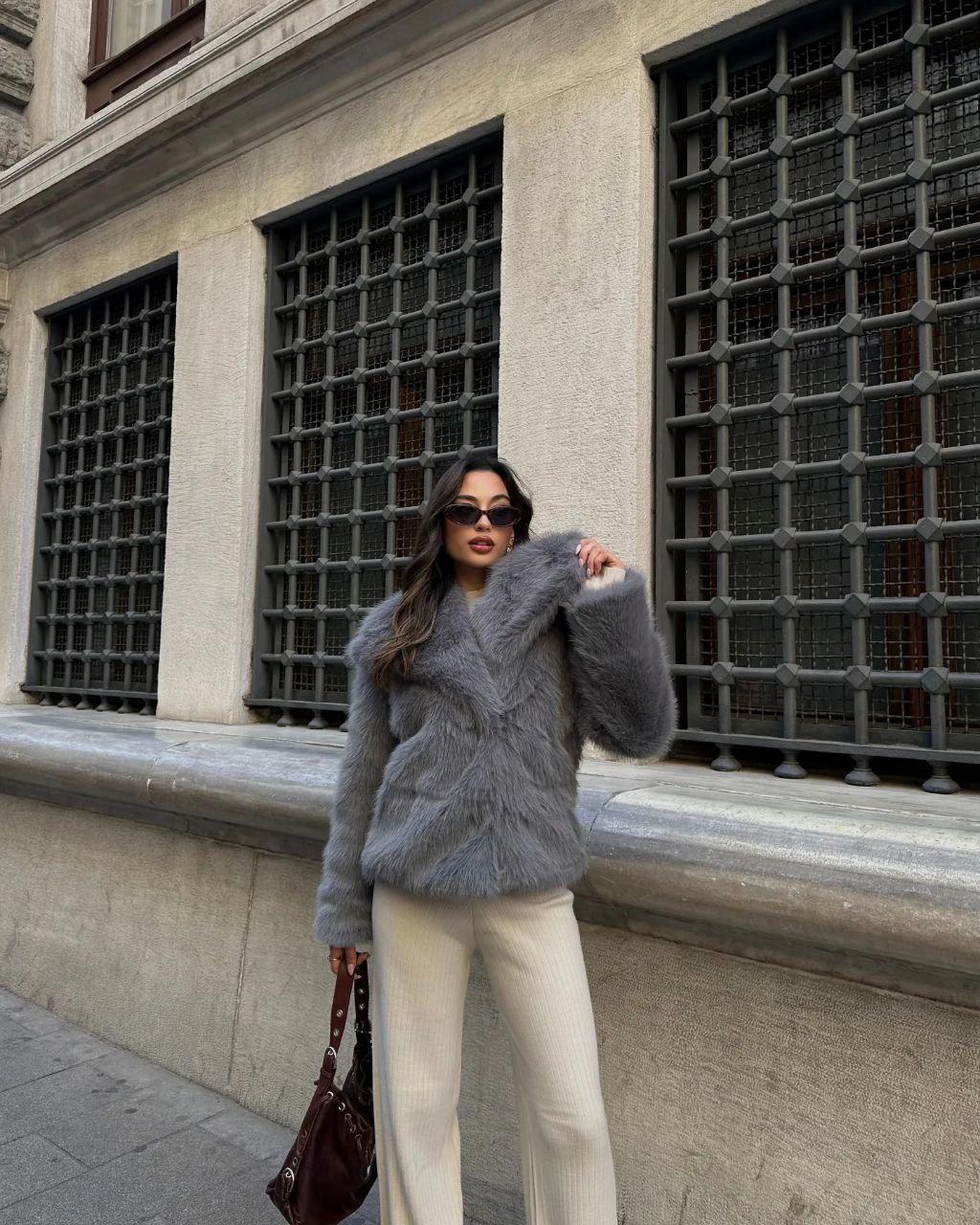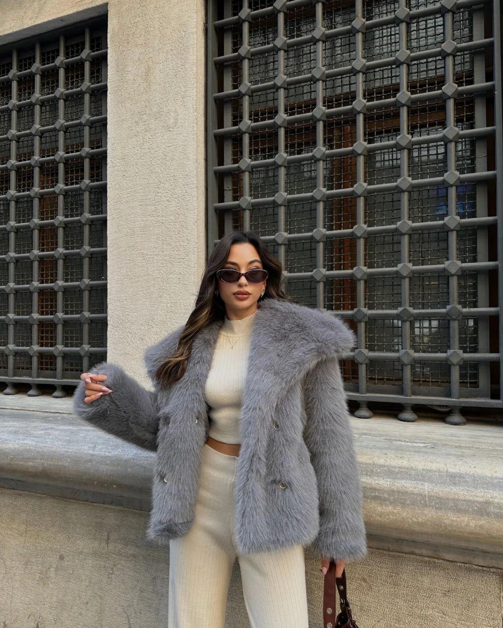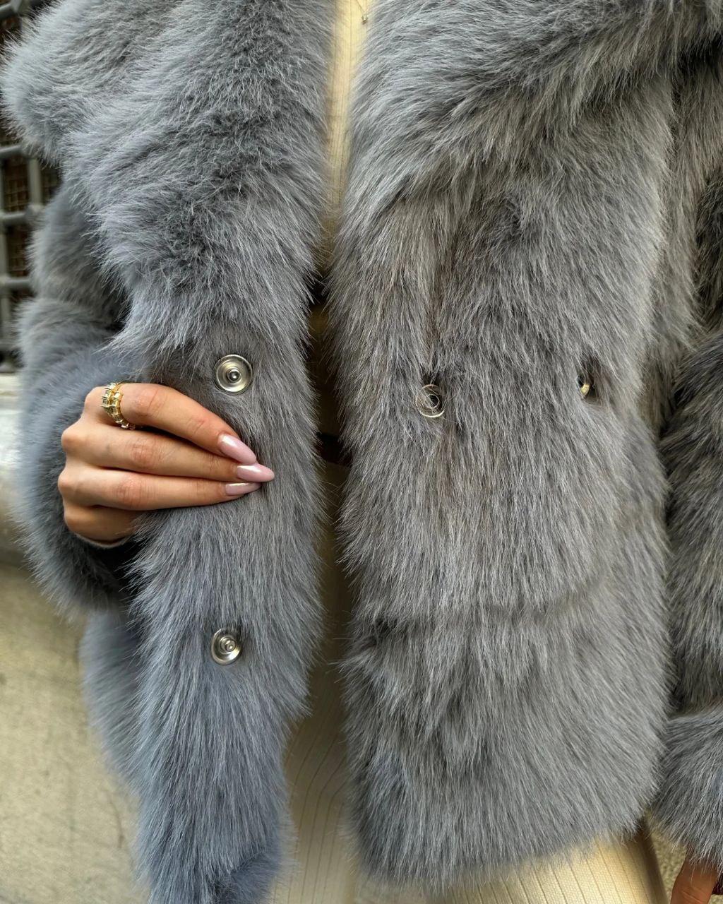 Женская Серая Шуба на Кнопках с Объемным Воротником