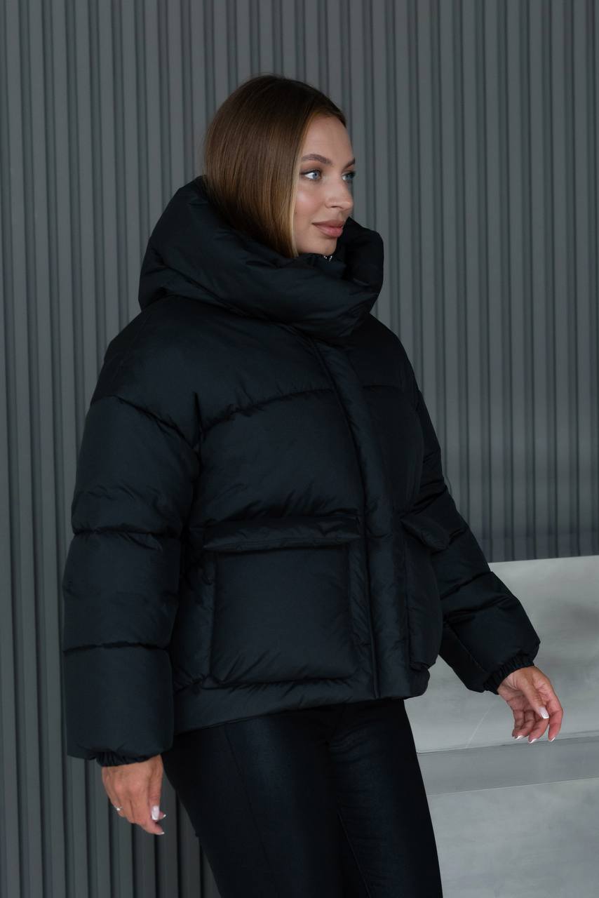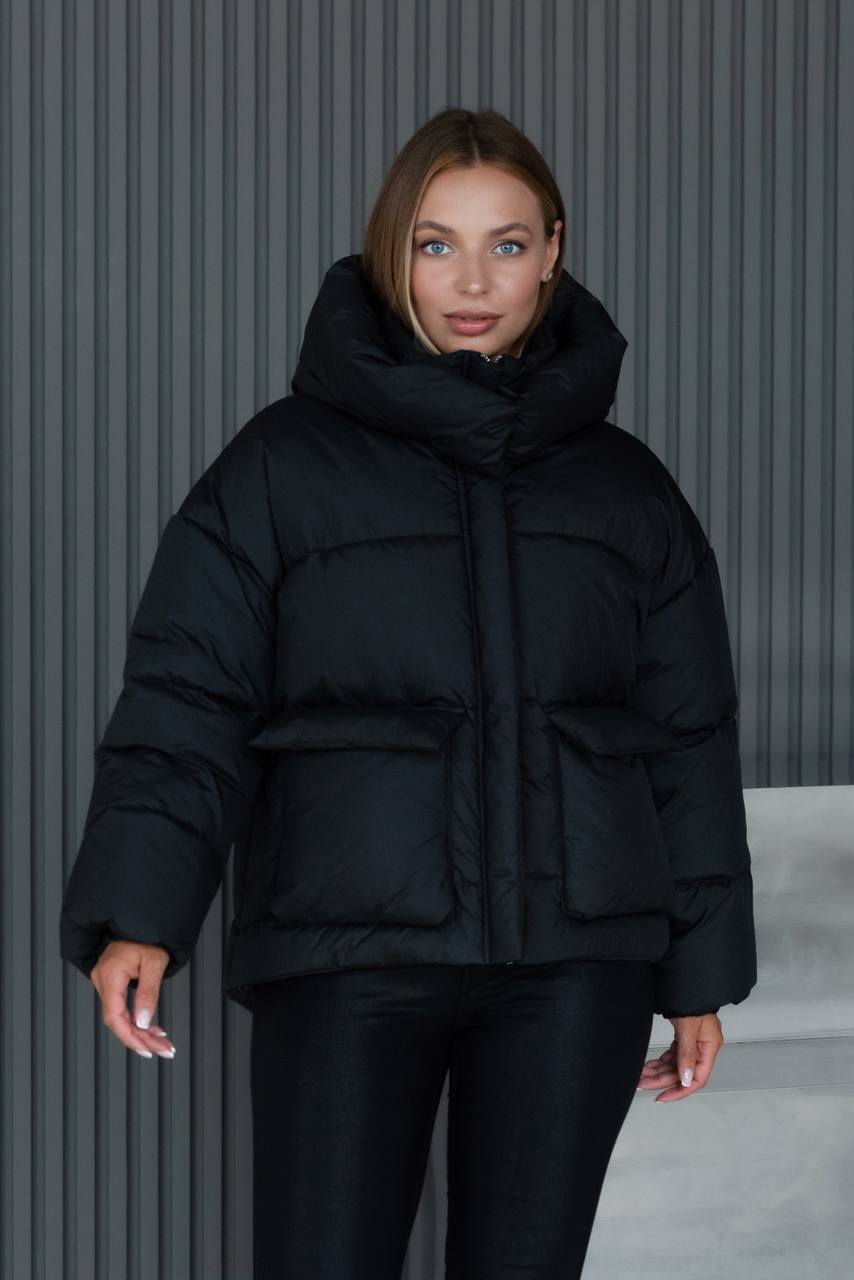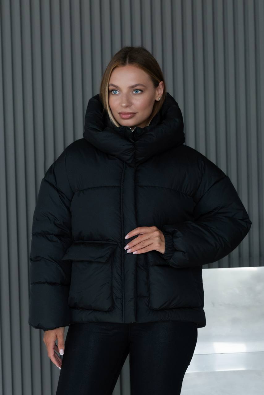 Женская Зимняя Черная Дутая Куртка – Объемная под Горло с Капюшоном и Накладными Карманами