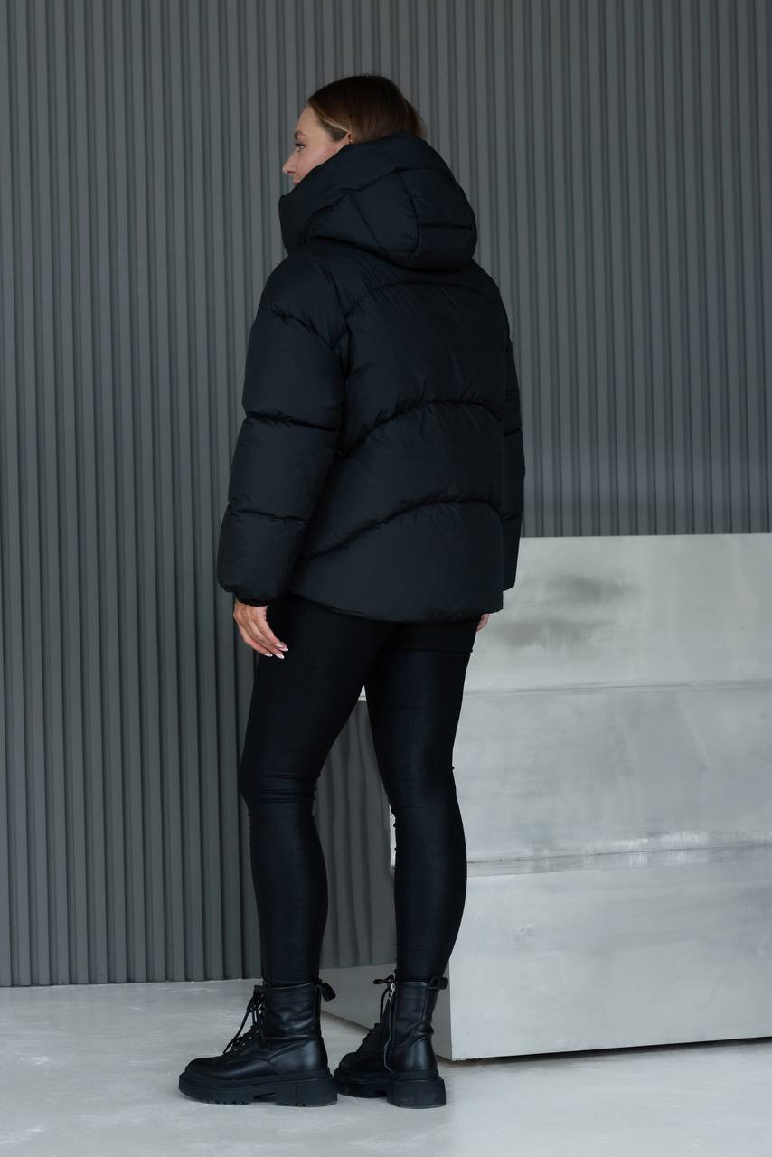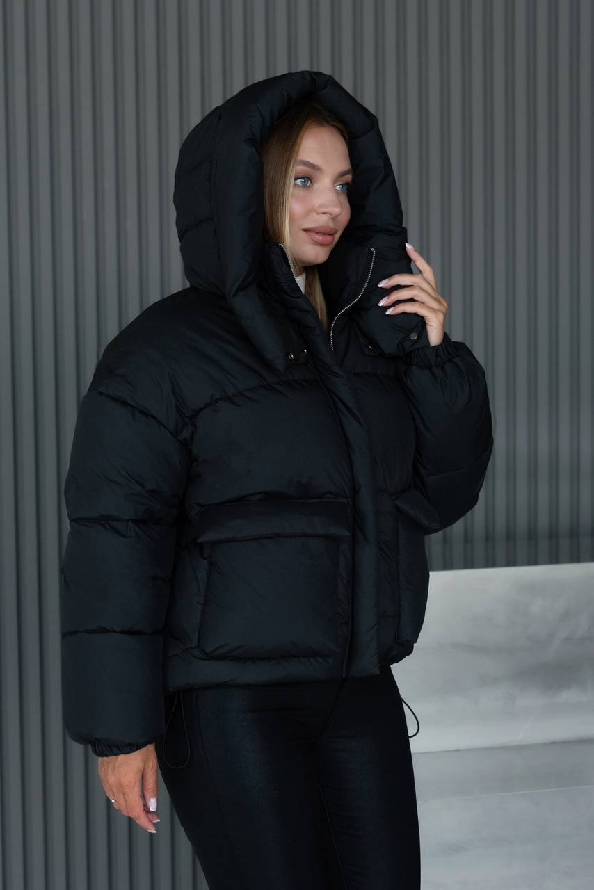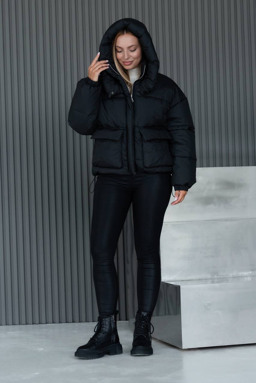 Женская Зимняя Черная Дутая Куртка – Объемная под Горло с Капюшоном и Накладными Карманами