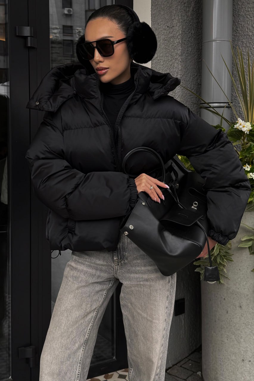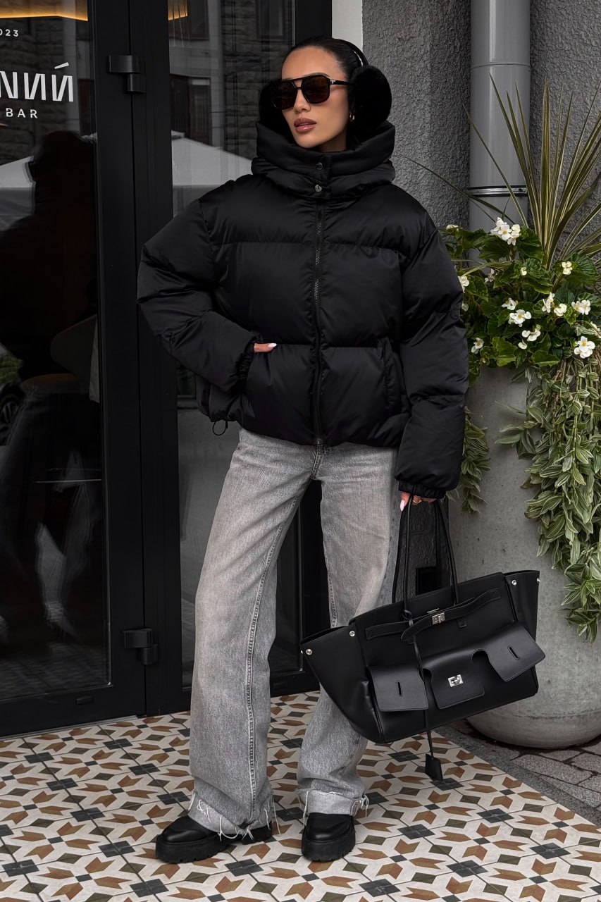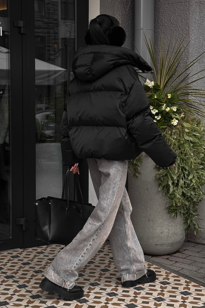Женская Зимняя Дутая Черная Куртка Пуфер Пуфи Оверсайз с Капюшоном