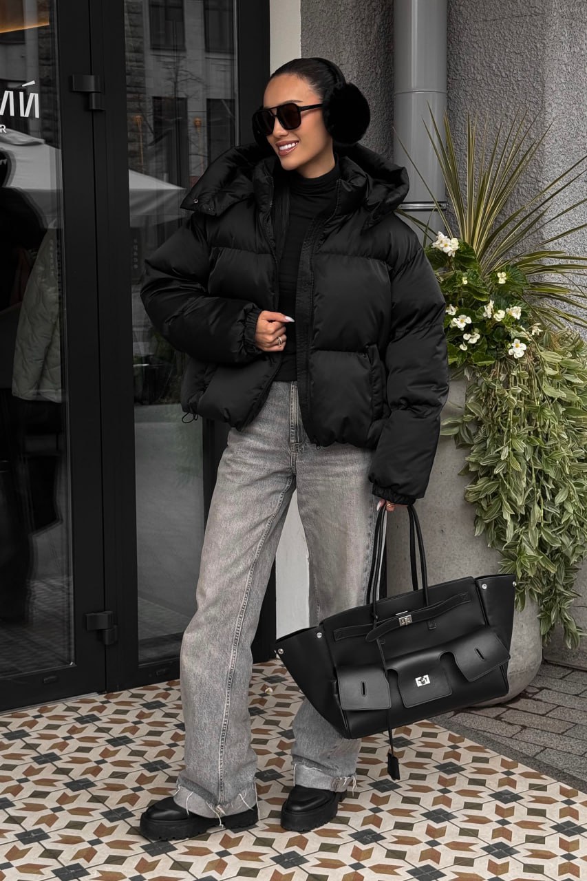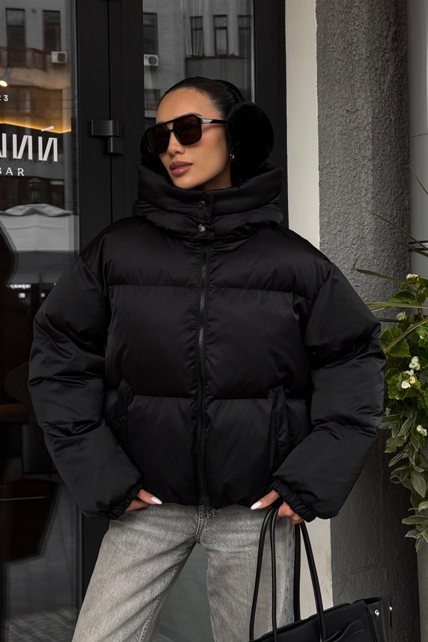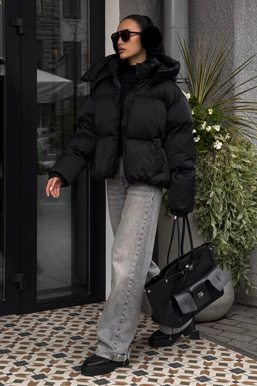 Женская Зимняя Дутая Черная Куртка Пуфер Пуфи Оверсайз с Капюшоном