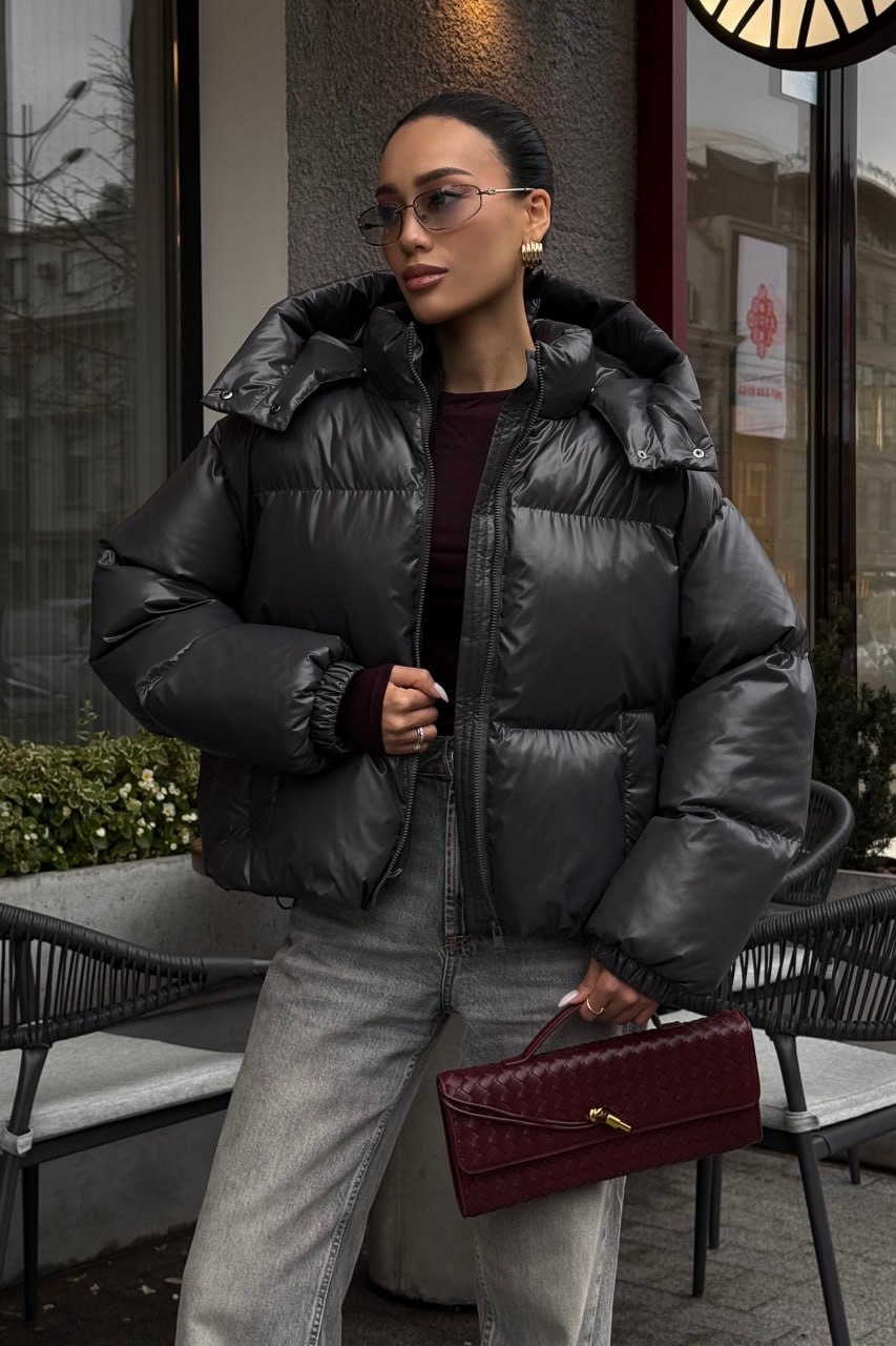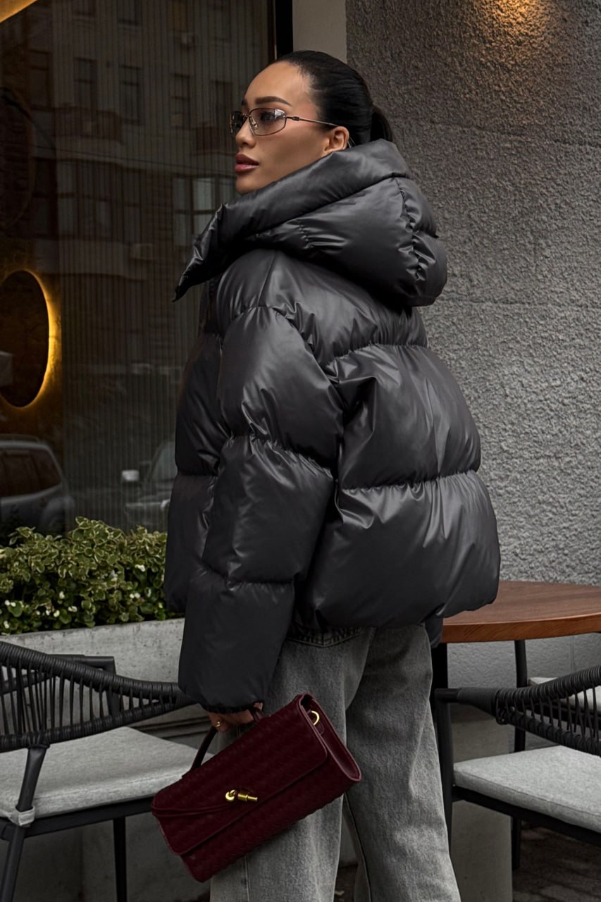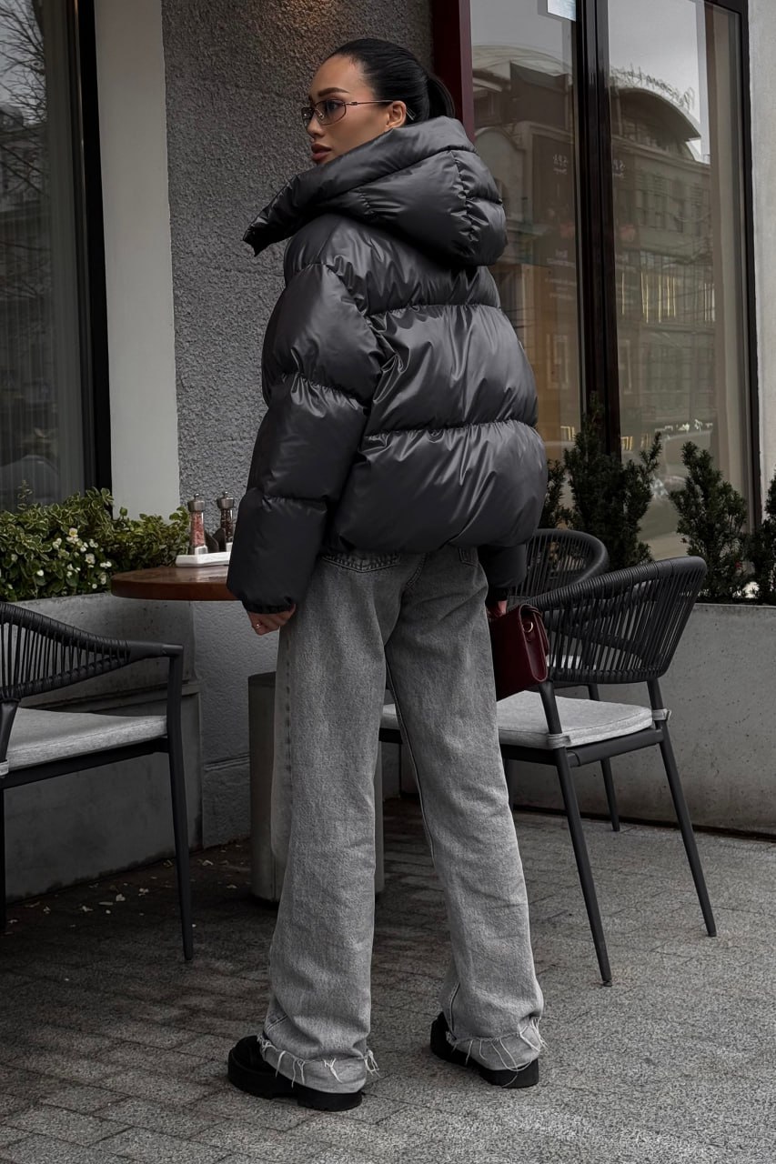 Женская Зимняя Дутая Графитовая Куртка Пуфер Пуфи Оверсайз с Капюшоном