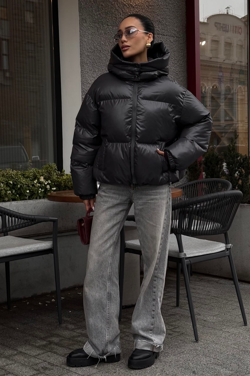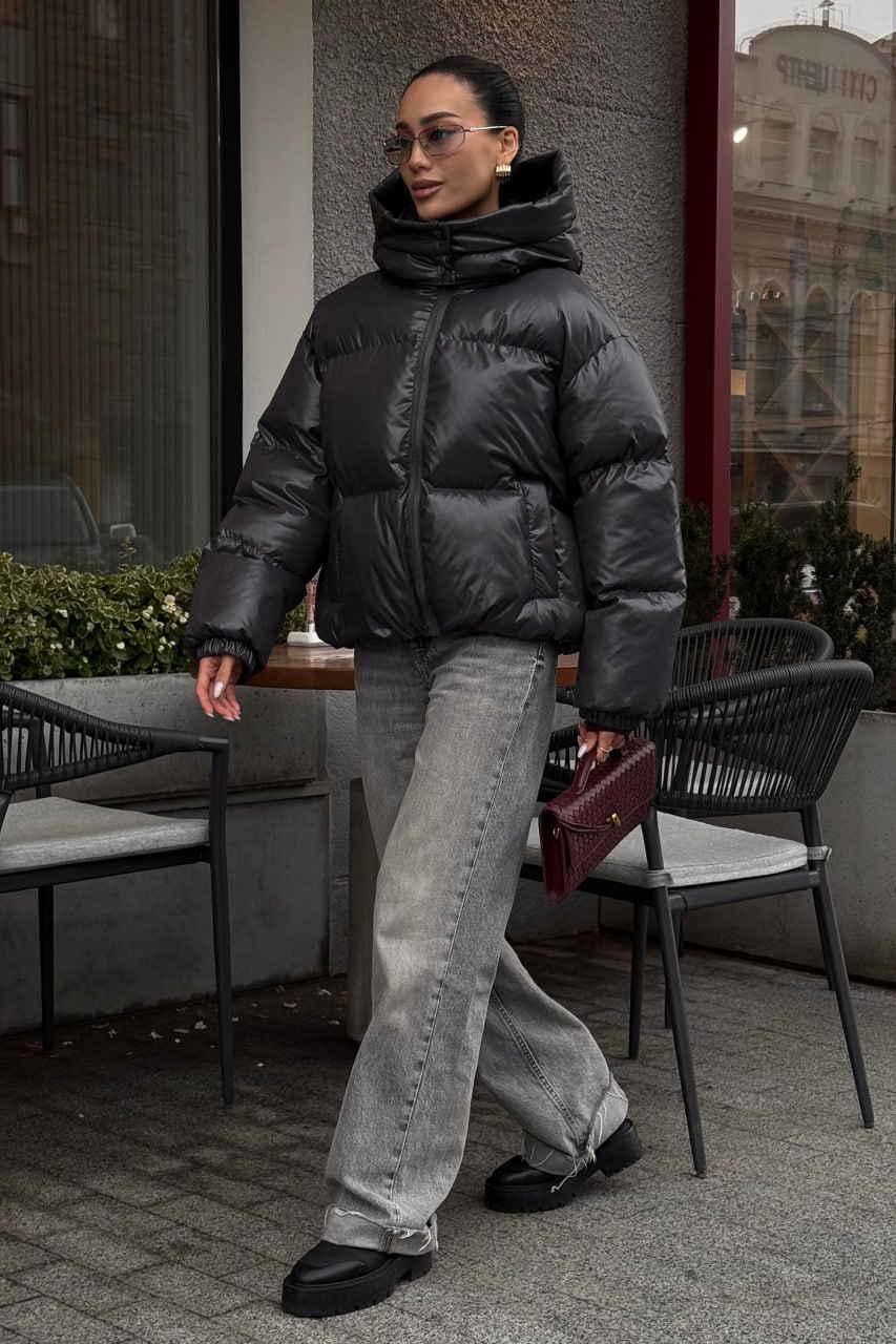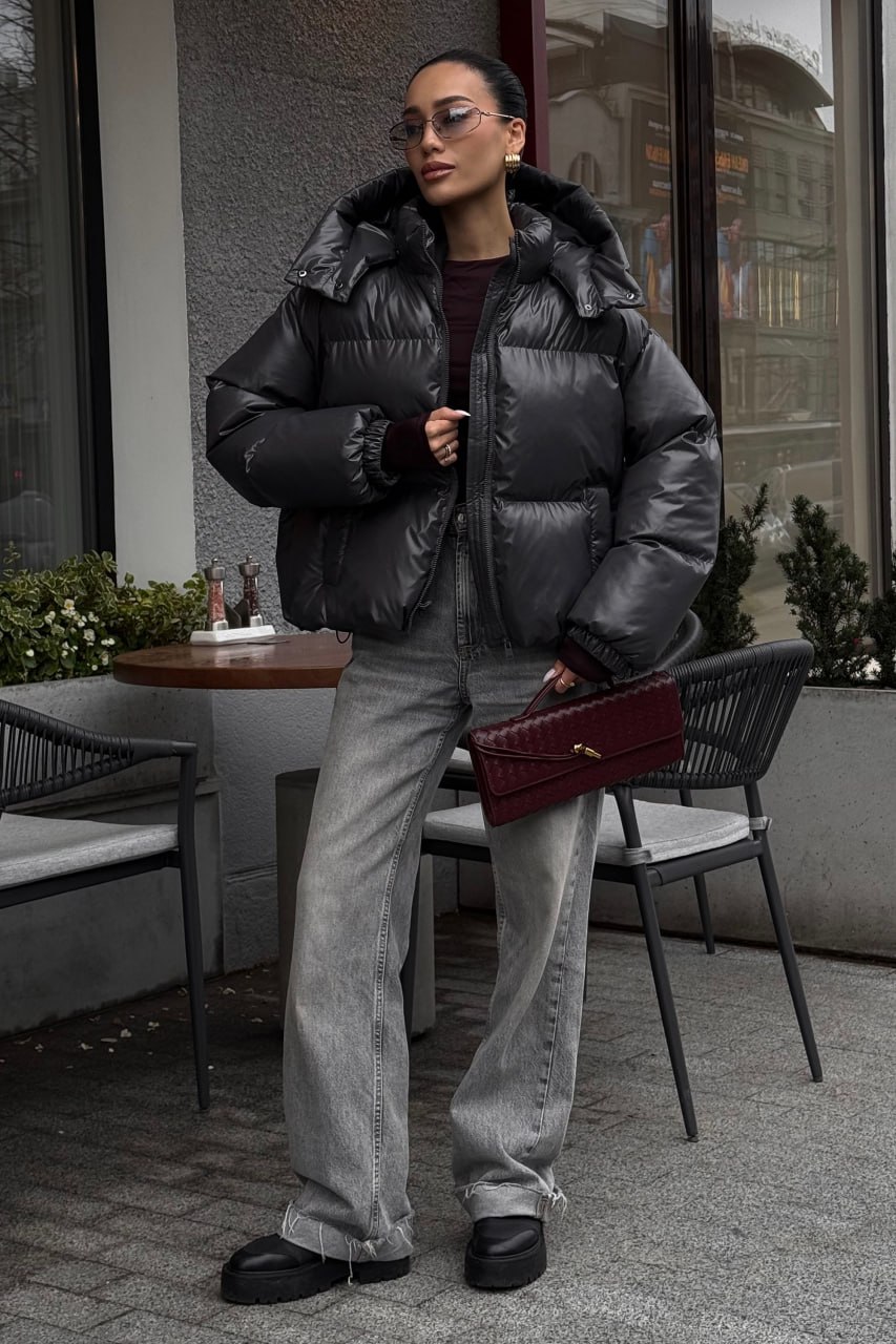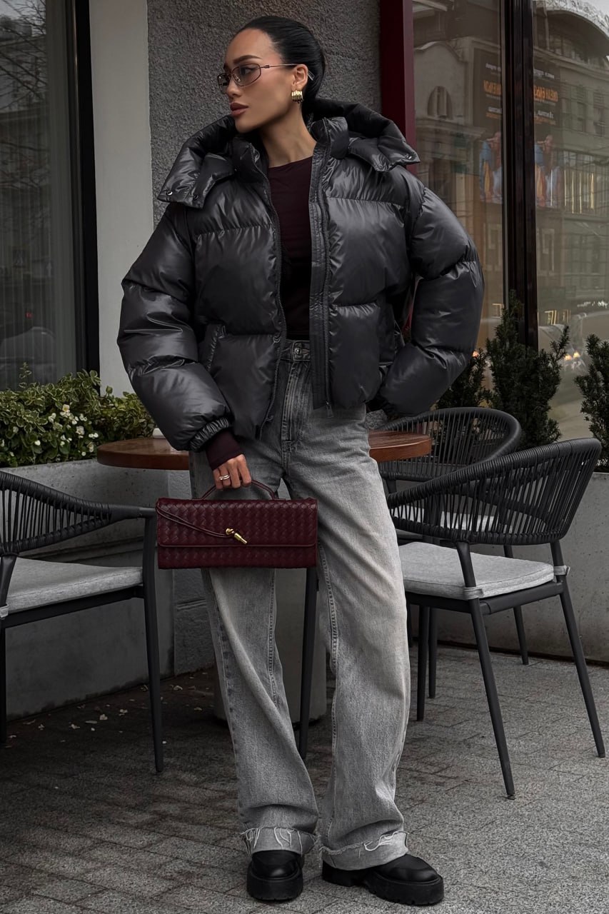 Женская Зимняя Дутая Графитовая Куртка Пуфер Пуфи Оверсайз с Капюшоном