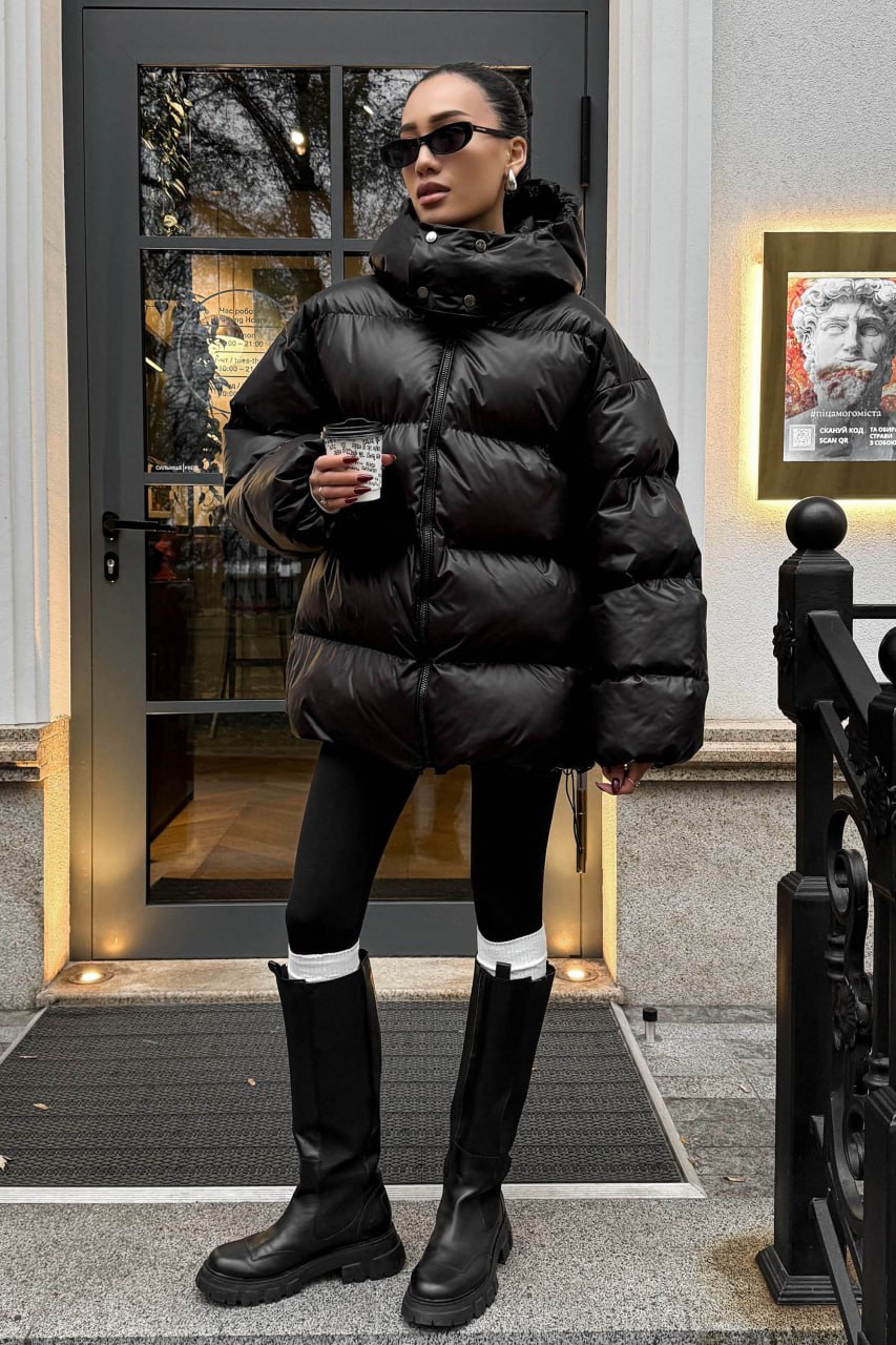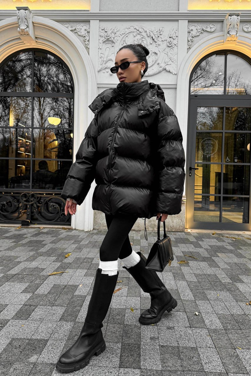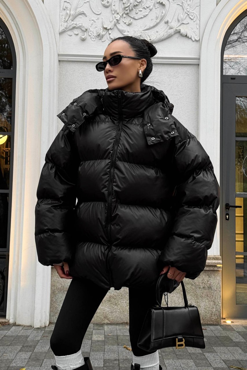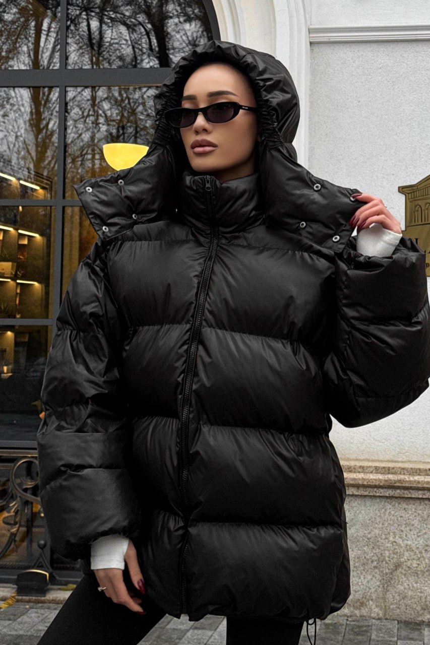 Женская Зимняя Объемная Черная Куртка Пуховик Тайм Оверсайз с Капюшоном